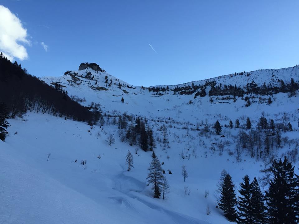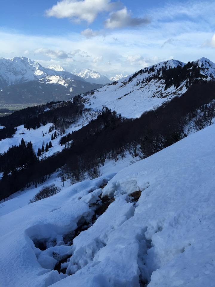 Verhältnisse: Sehr bescheiden. Egenlich wäre es besser gewesen zu Hause zu bleiben. Am PP bereits 11°. Schneedecke nicht durchgefrohren, nur in den oberen Bereichen tragfähig. Sonst Bruchharsch und Sulz. Abfahrt vom Schlenken bis zur Alm brauchbar.