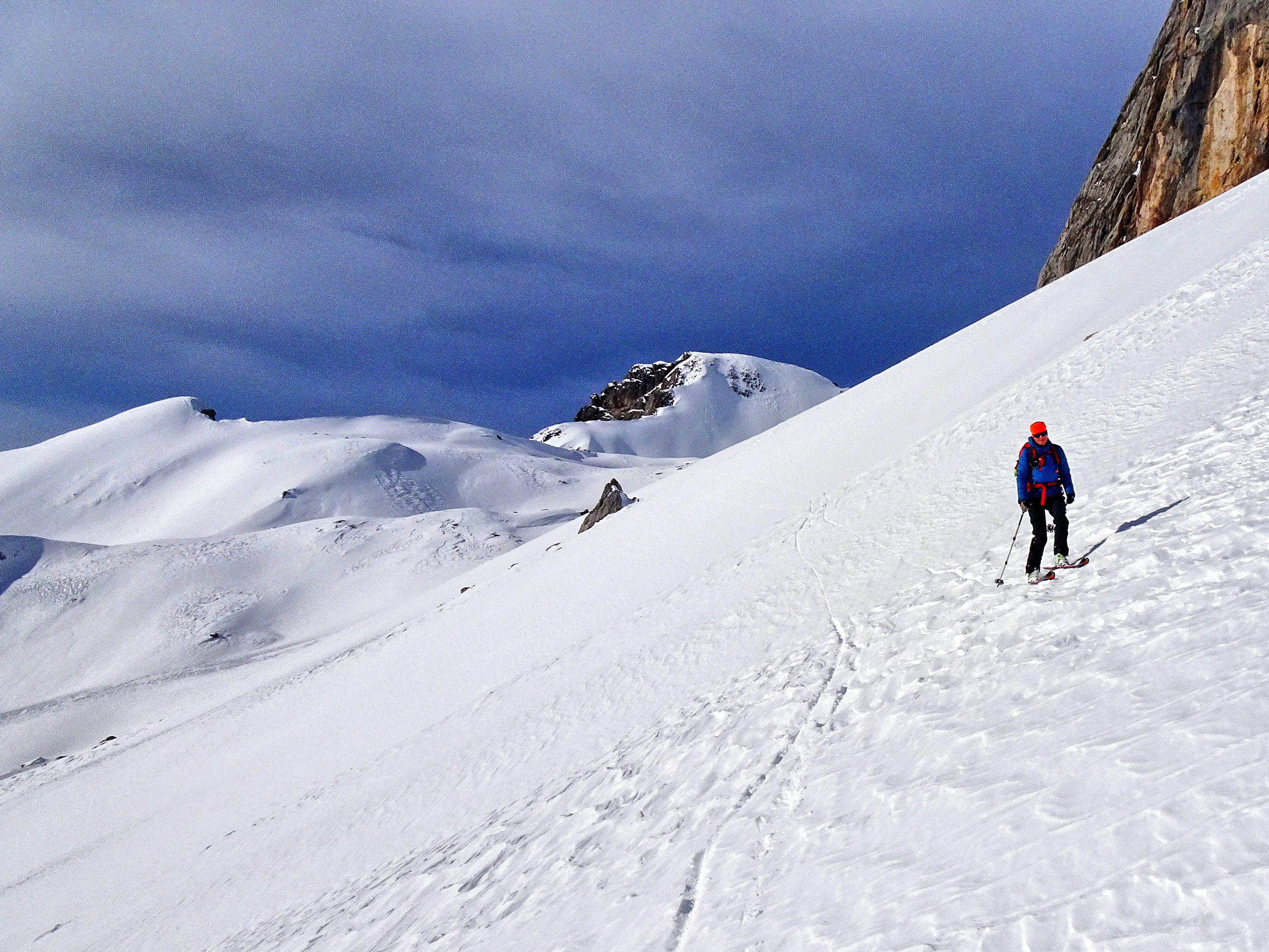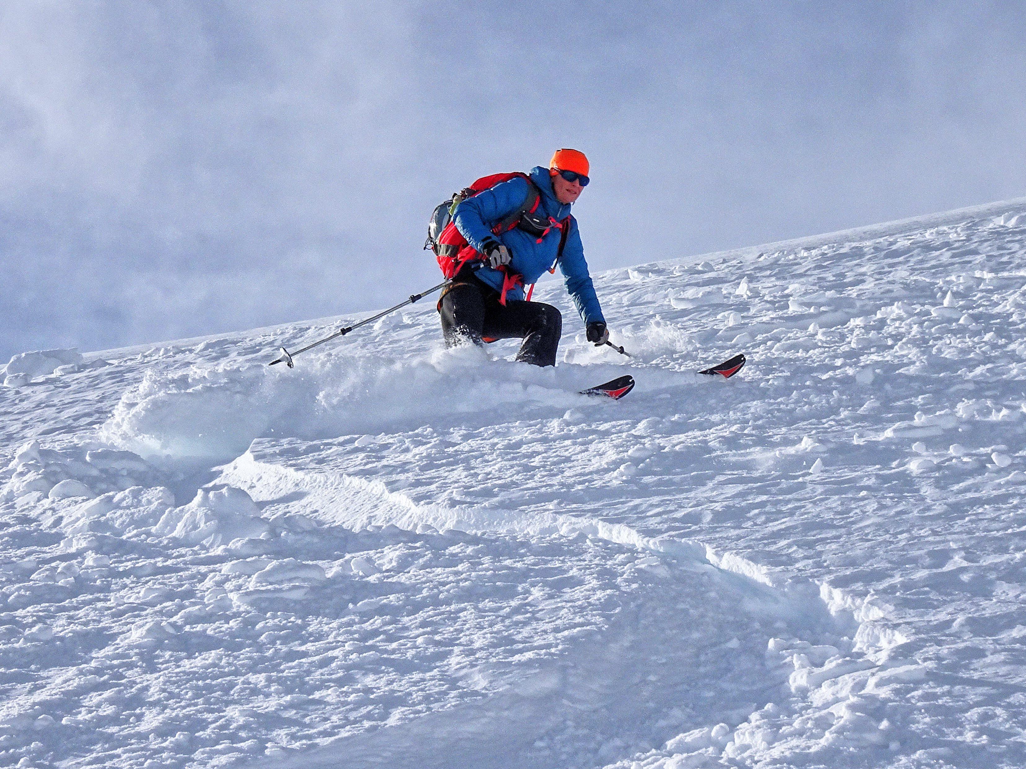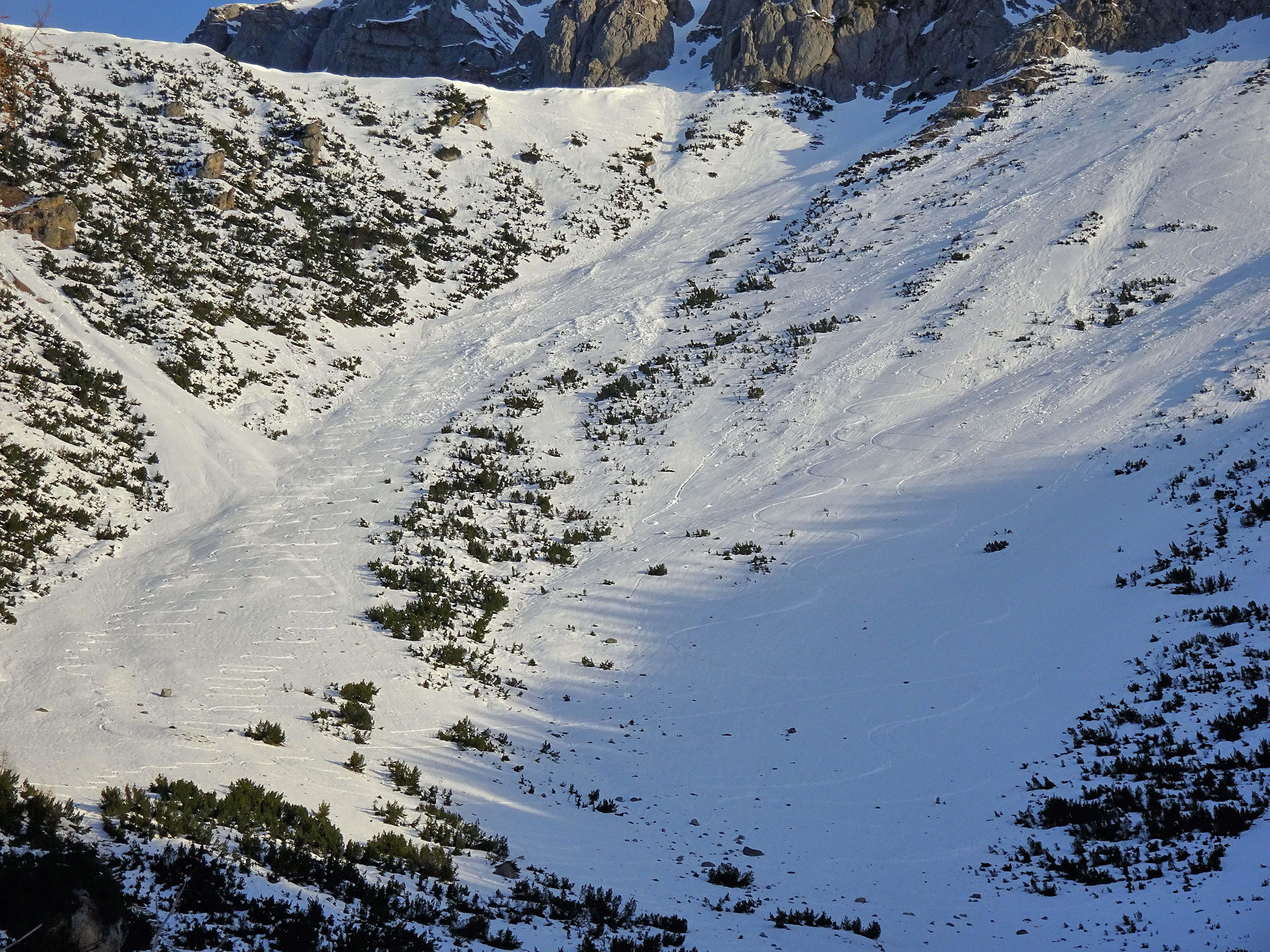 Aufbruch Ramsau Ort. Bis 2000m dünne, auch am Folgetag dank Isolierung durch 10-20cm Pulver nicht gänzlich durchgefrorene Altschneedecke mit Harschdeckel. Ab 2000m rasch zunehmende Schneedecke bis 250cm, gut gesetzt, oberflächlich windbehandelt. Kleinräumige Einwehungen die in den steilen Osthängen des Koppenkars plattenartig unter Last wenige Meter abrutschen. Ziel: Mitterstein Talstation. Der Sessellift fährt aufgrund der guten Schneelage heuer bereits vor Weihnachten zum Mittagessen ;-)