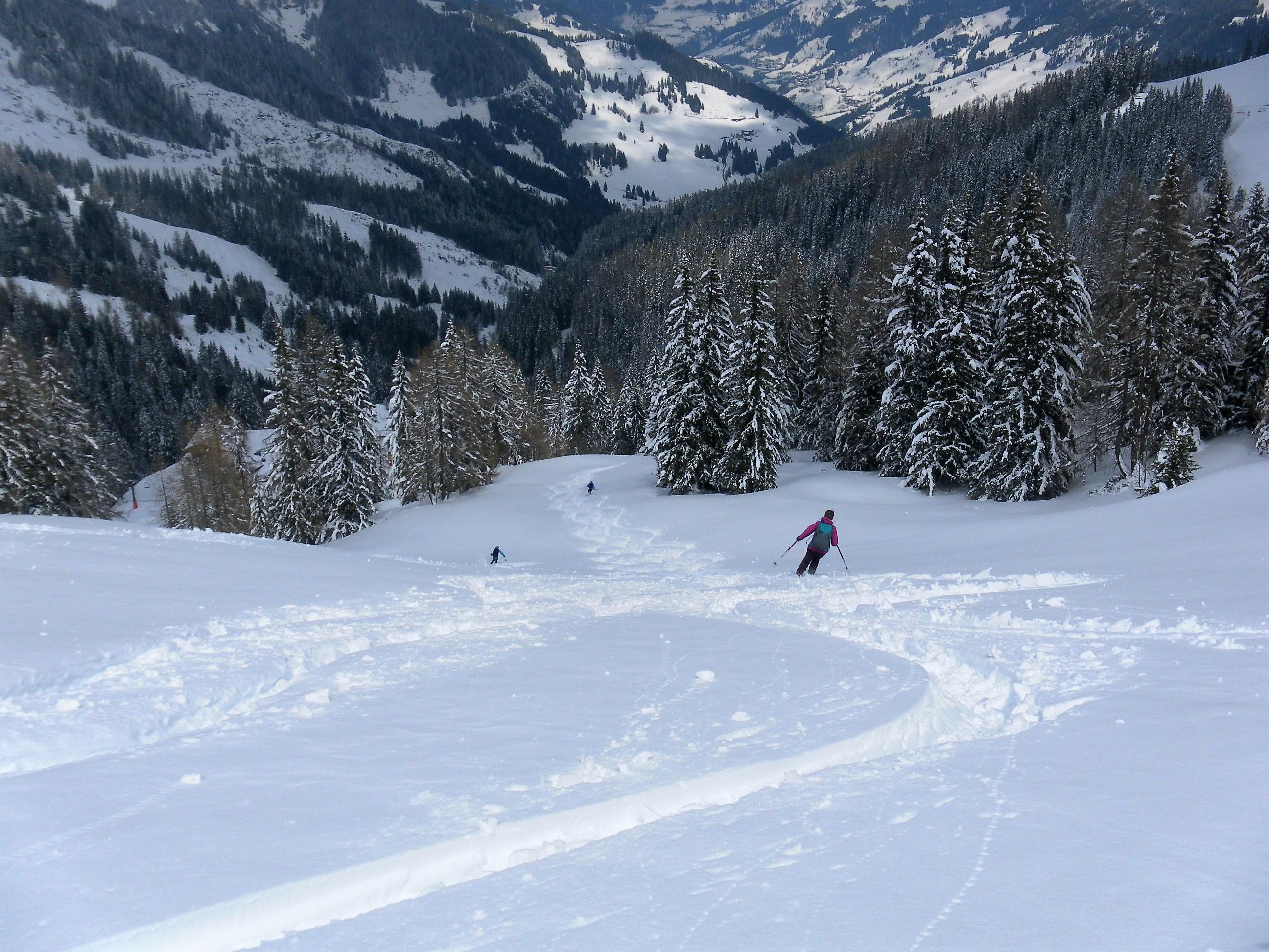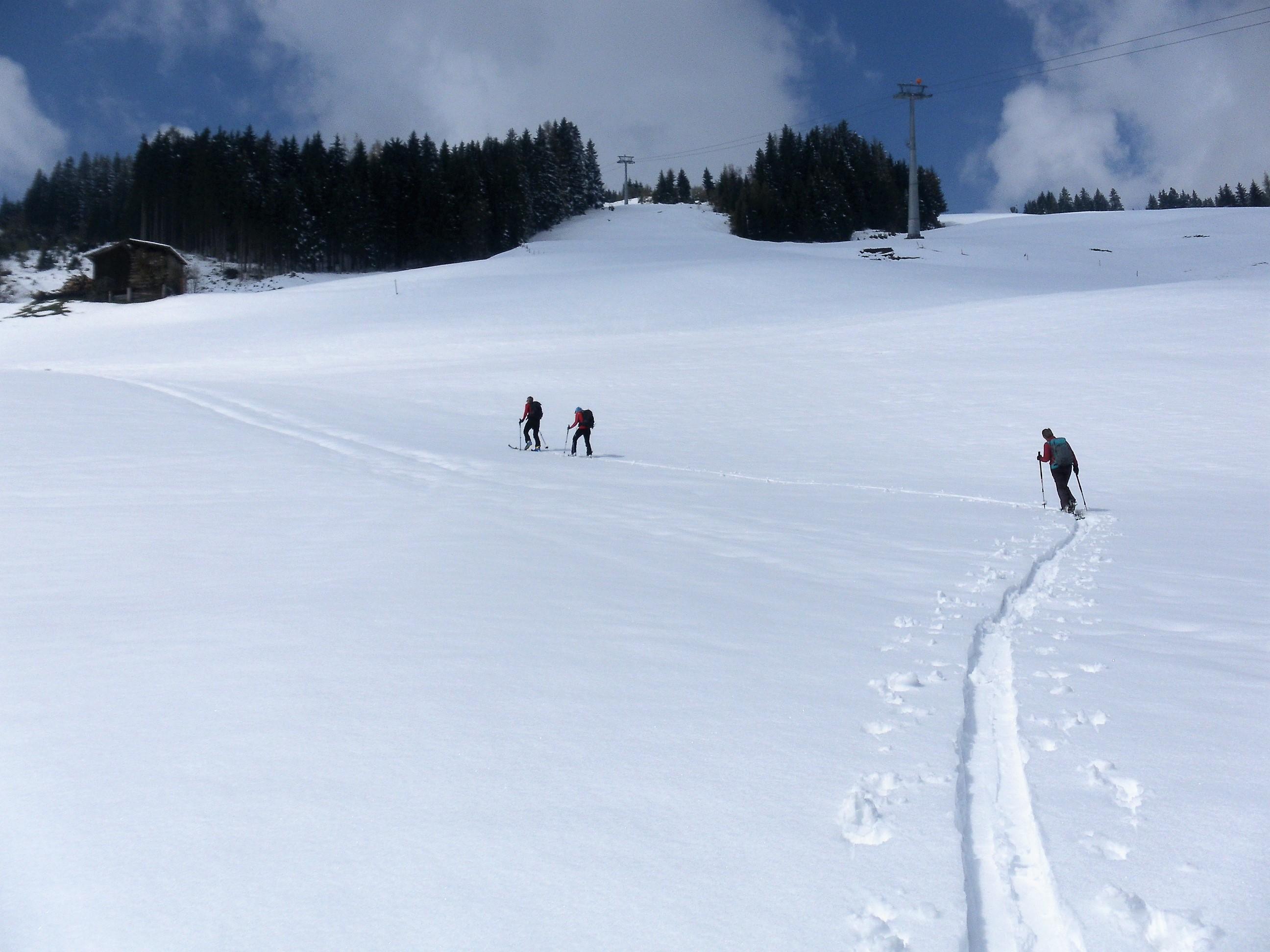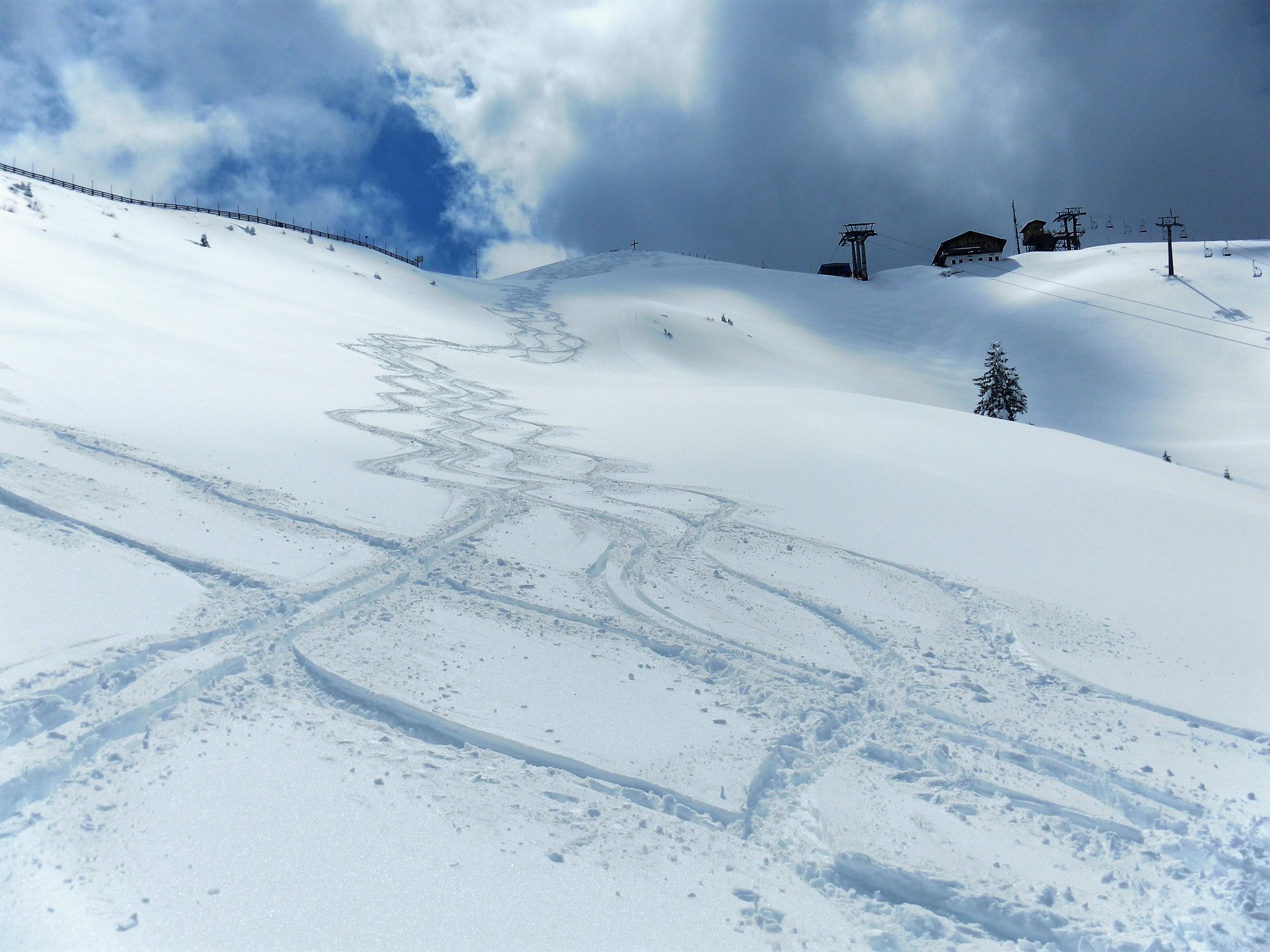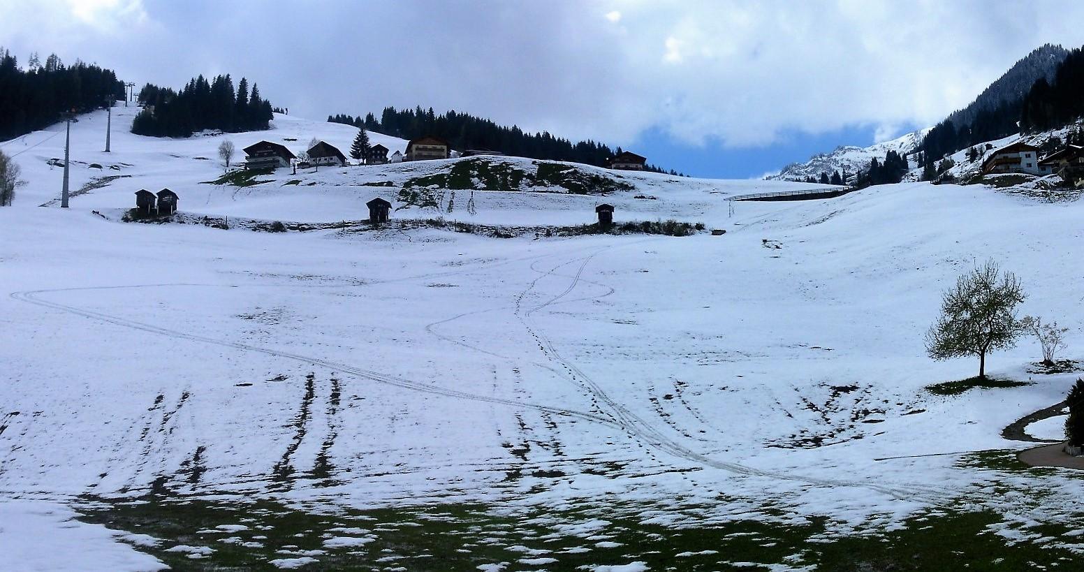 Postsaisonale Pistentour mit feuchtem Neuschnee auf fehlender Schneeunterlage.