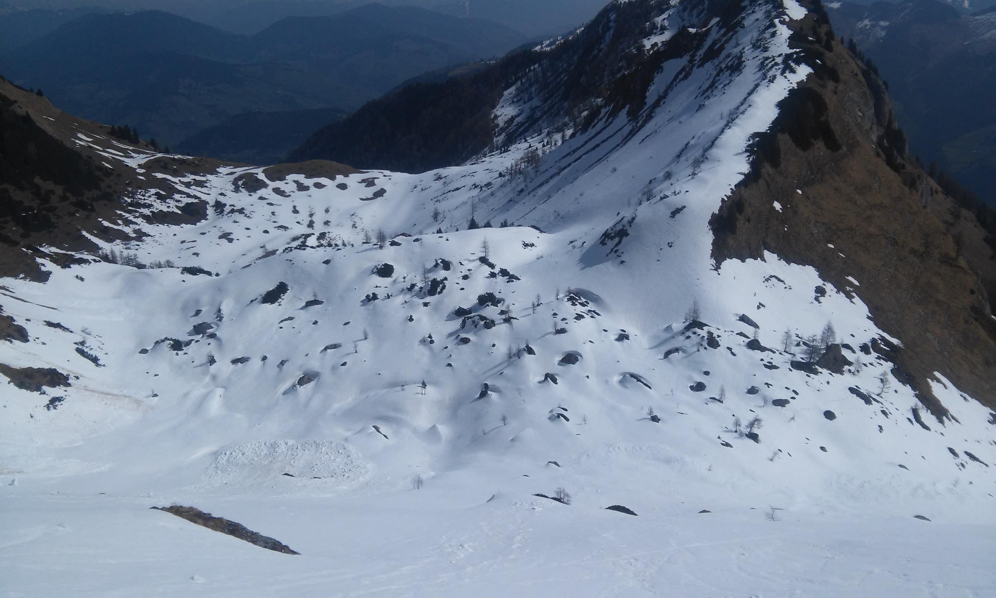 Das Gute liegt wirklich nah – Auffahrt von Großarl, Schied zum PP Himmelsknoten; Schitragen entlang der Forststraße bis 10min oberhalb der Niggeltalalm, dann kann angeschnallt werden. Der südseitige Hang vom Igltal ist bereits schneefrei, während an den Nordhängen zwischen Wetterkreuz und Höllwand noch begeh- und befahrbare Schneedecke liegt. Dort entlang sind einige alte Nassschneerutsche zu queren und aus den Wänden hört man immer wieder kleinere Steinschlag- und Schneerutsche kommen – aus sicherer Entfernung. Zwischen Sandkogel, Höllwand, Heukareck und Schober ist dann wirklich ein Firnspielplatz vom Feinsten – wohin zuerst!