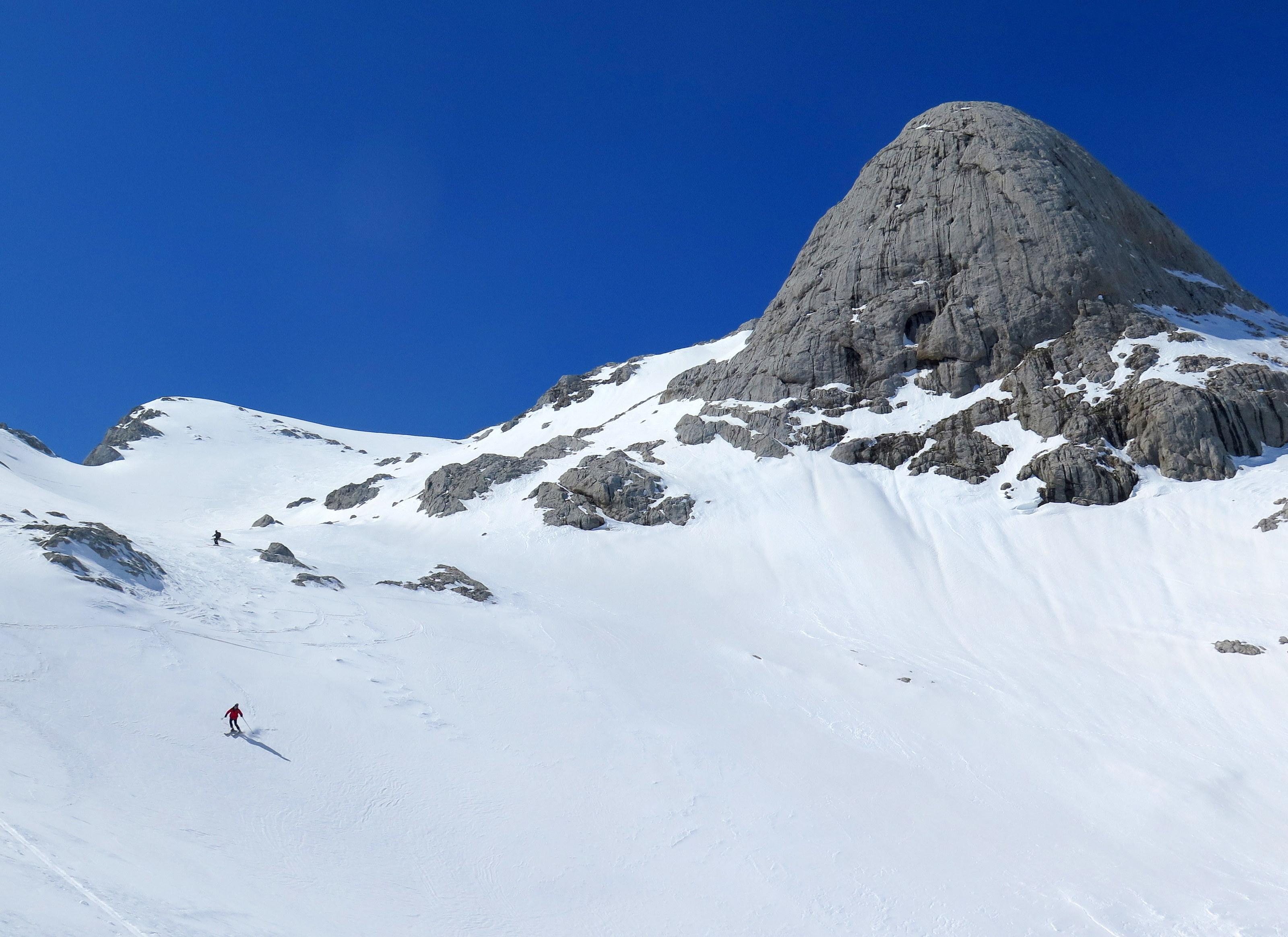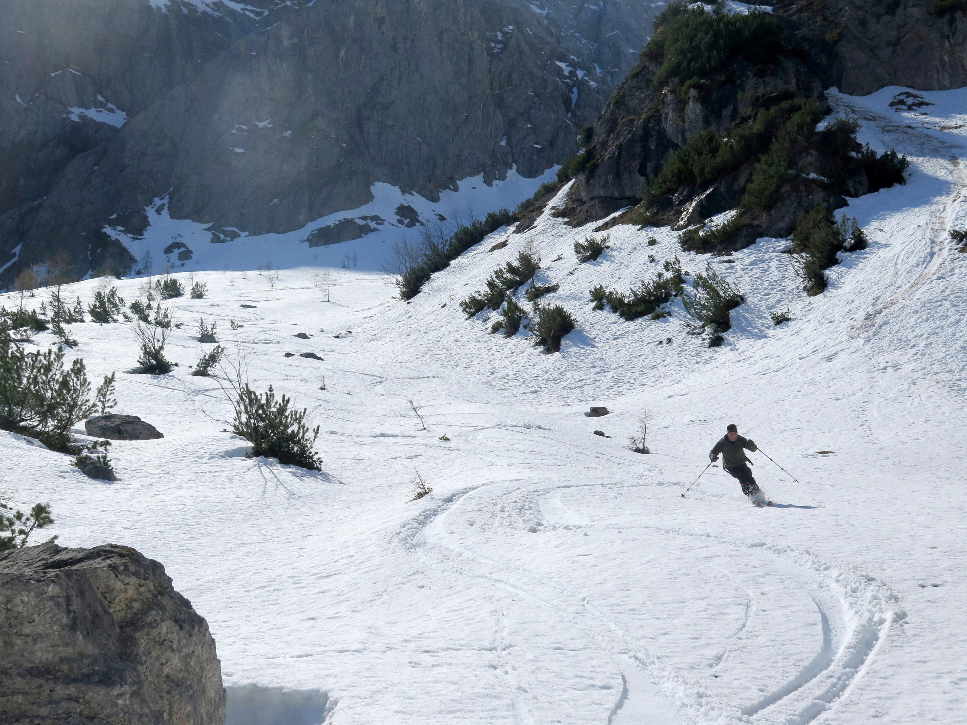 Anstieg vom Blühnbachtal aus über das Tauchertal, dann stärker südwestlich abzweigend am markanten Kohlhaufen vorbei zum Gipfel. Zeitweise frischer Wind sorgte für willkommene Kühlung. Bis ca. 1900 m bereits gut aufgefirnt, danach waren auf den stärker sonnabgewandten Hängen abschnittweise die Harscheisen gefragt. Abfahrt um die Mittagszeit bei perfektem Firn in den großzügigen Mulden. Harter Harsch nur mehr auf einem kurzen Hang unterm Kohlhaufen und weiter unten auf einem Steilhang im Schatten des Reißhorns. Ab dem Hahnpfalzboden tiefer, teilweise bereits saugender, aber immer noch gut fahrbarer Firn.