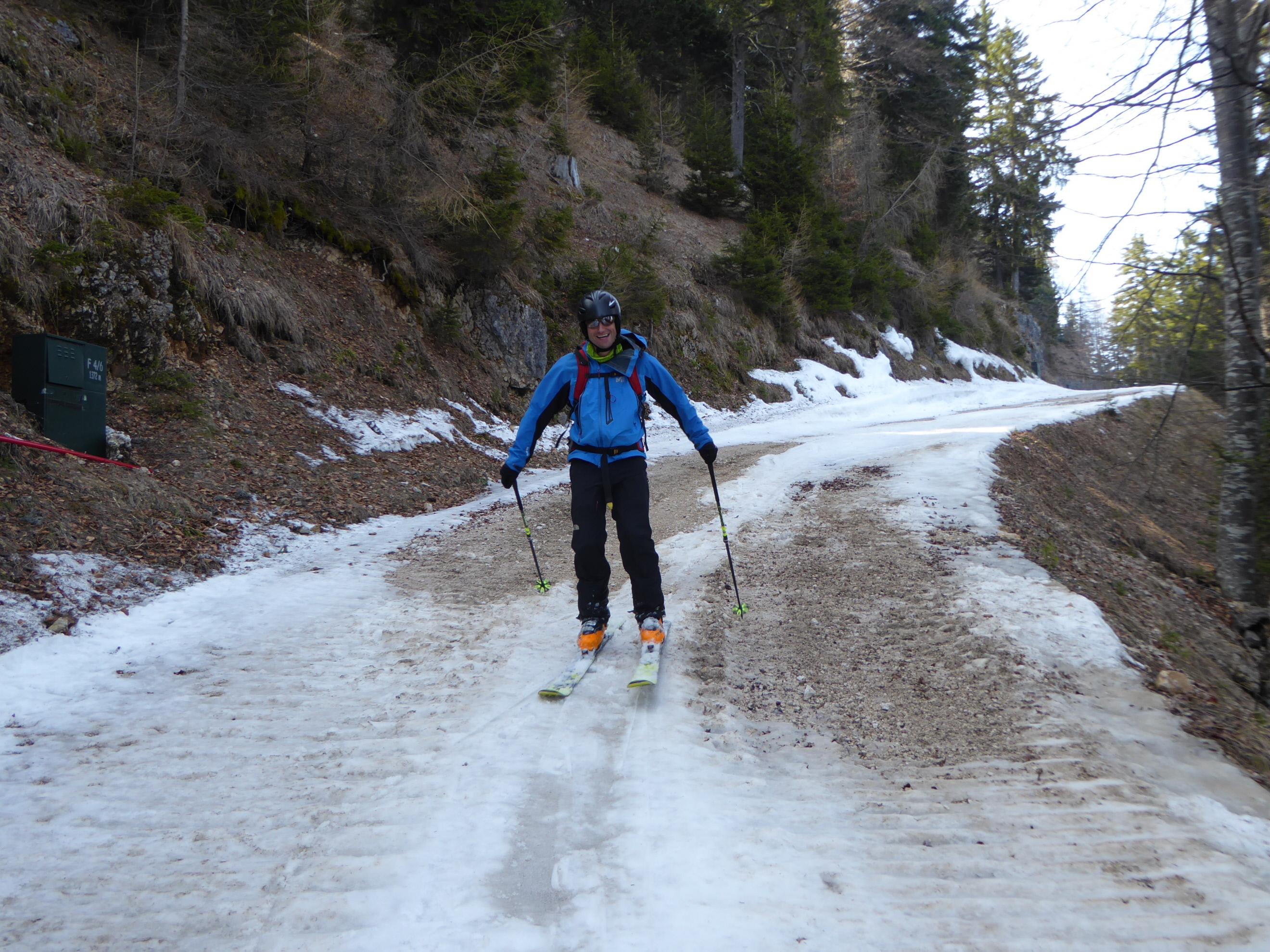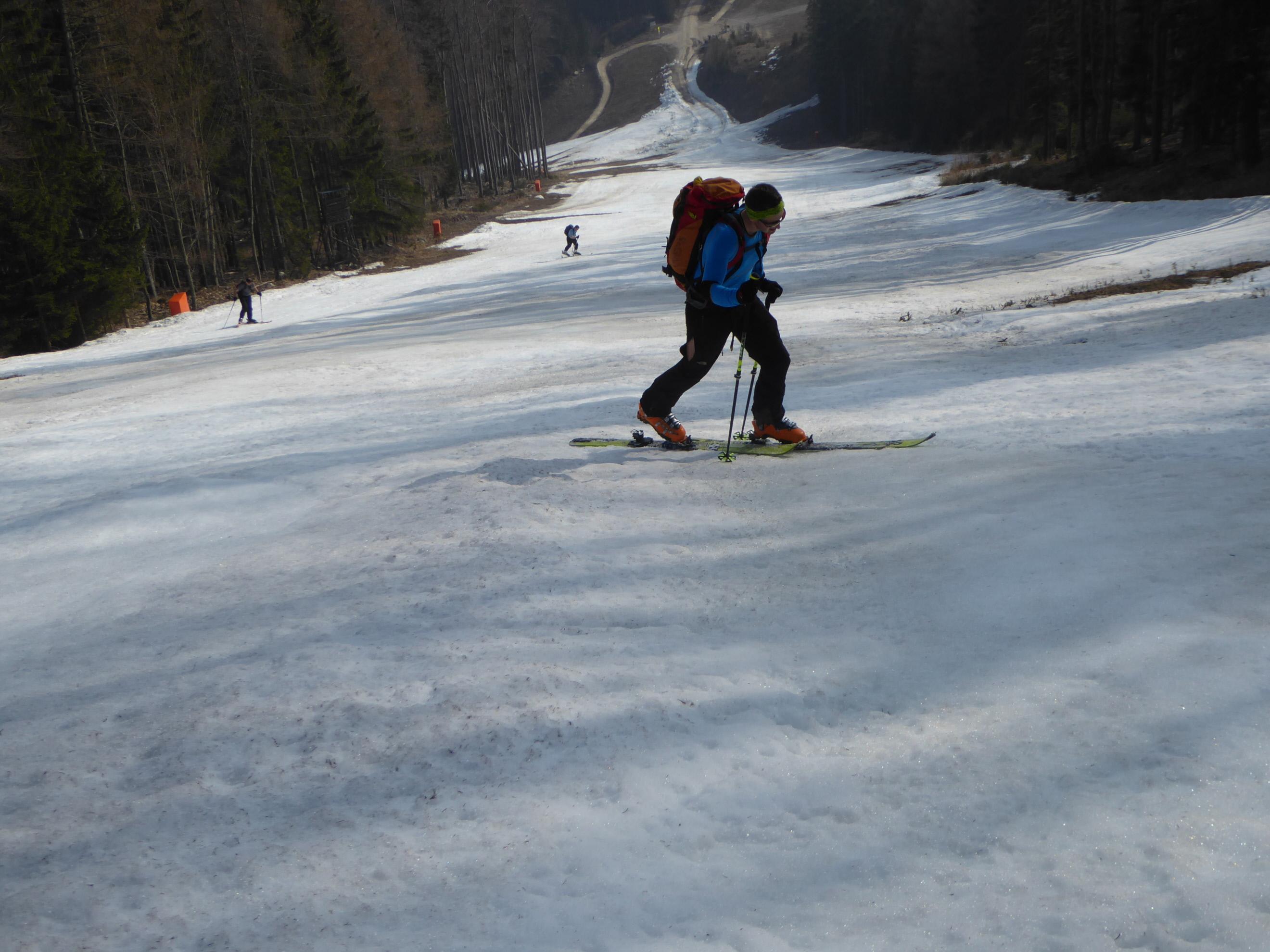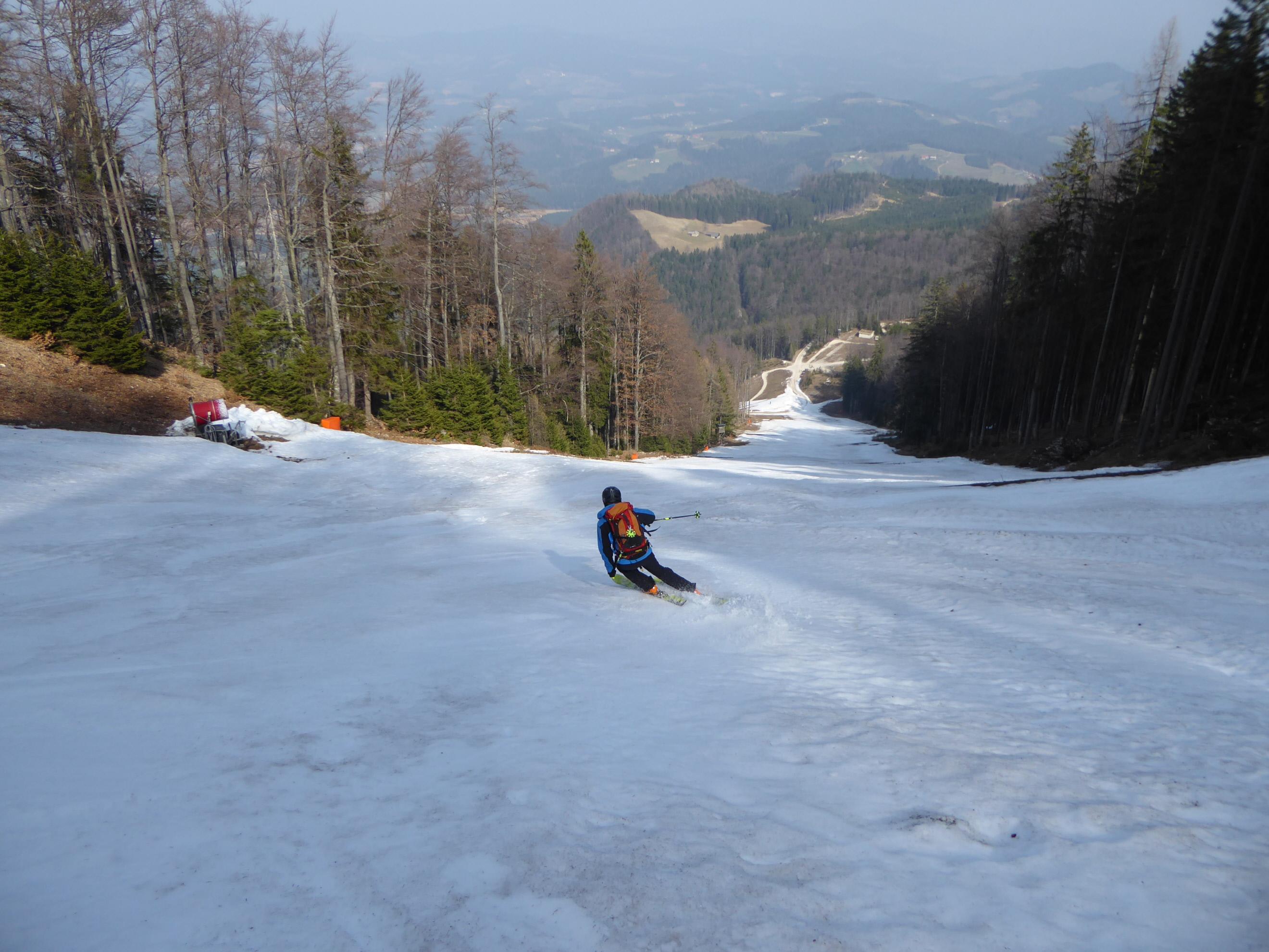Das Skigebiet auf der Petzen hat mit Sonntag 19.3. die heurige Wintersaison beendet; daher haben wir die Pisten als Aufstiegs- und Abfahrtsrouten nutzen können; eine am Vortag telefonisch vor Ort eingeholte Auskunft, dahingehend, dass die Talabfahrt bis zum Schluss in Betrieb war und jetzt einige Flecken habe, war nicht ganz richtig (oder doch: es waren ein paar Schneefleckerl auf der grünen Wiese im untersten Teil der Abfahrt ;-)); wir haben daher etwa 30 min hinauf getragen und in der Abfahrt mit ein bisserl Schneefleckerl hupfen die letzten 60 Hm (8 min) wieder hinunter getragen; im Mittelteil einige Skiwegpassagen mit gerade noch genug Schnee für eine durchgehende Abfahrt (eine Unterbrechungsstelle 20 m); aber 1.550 Hm Genussabfahrt !!! (die man natürlich vorher hinauf gehen muss ;-))