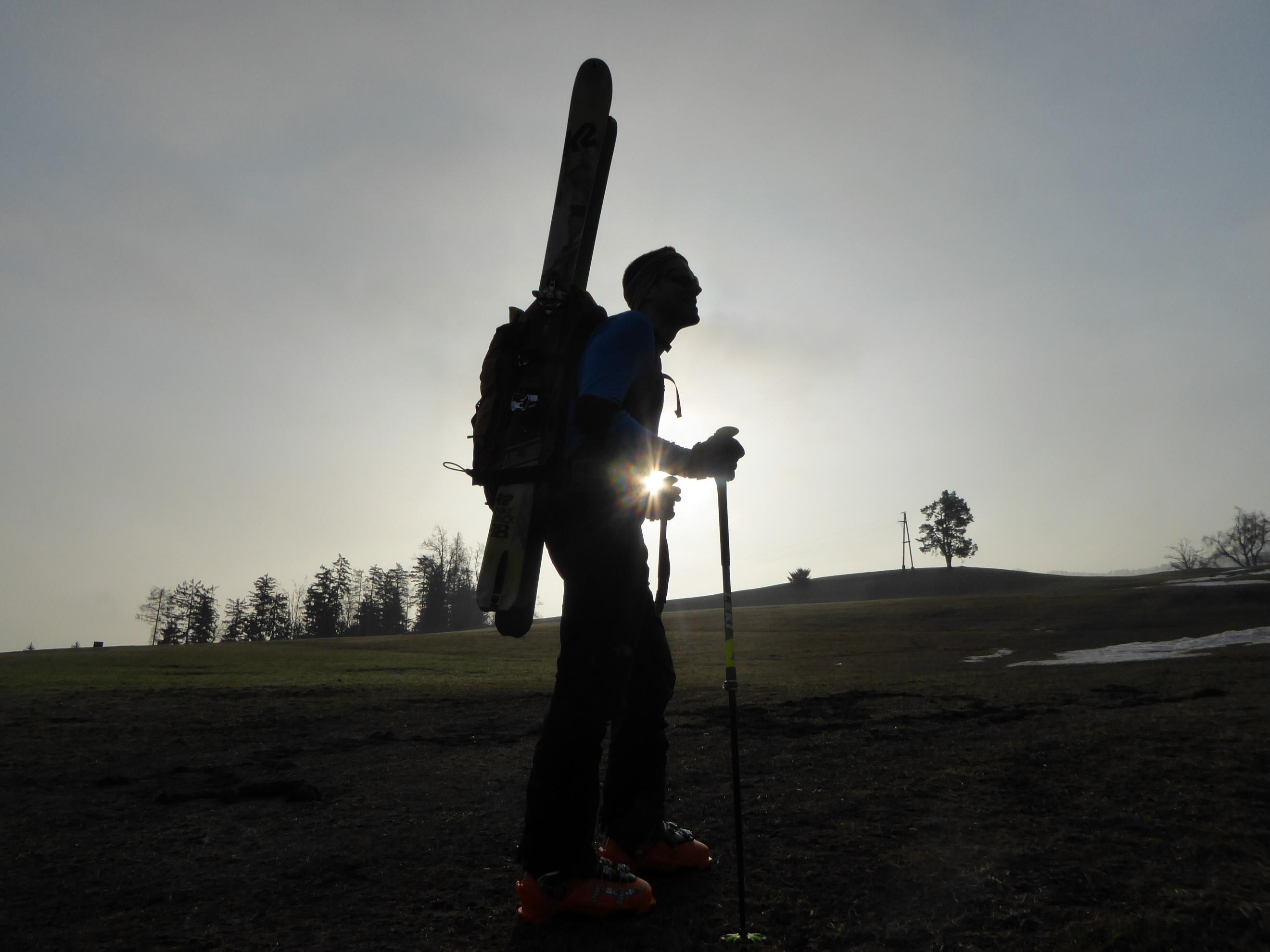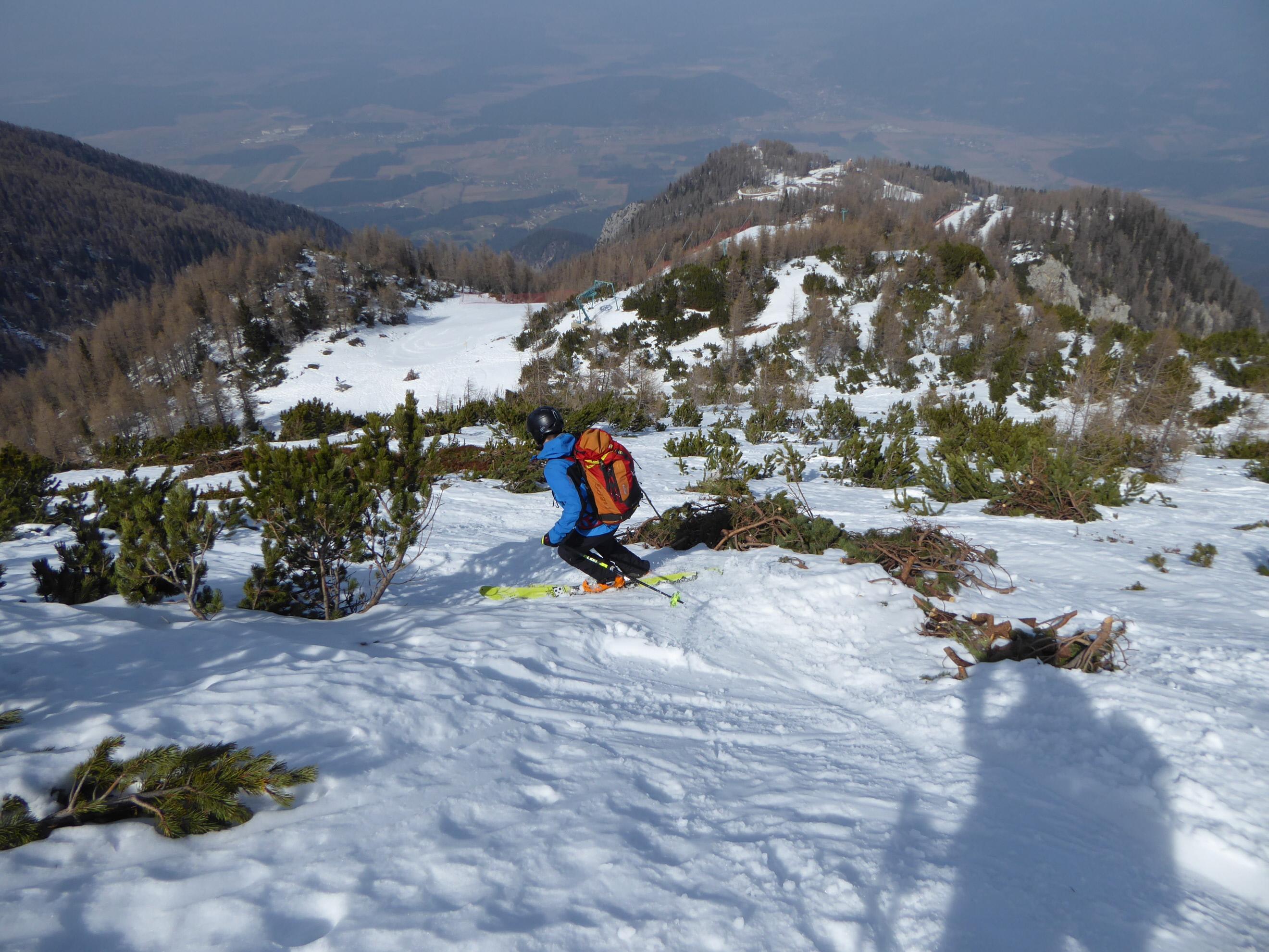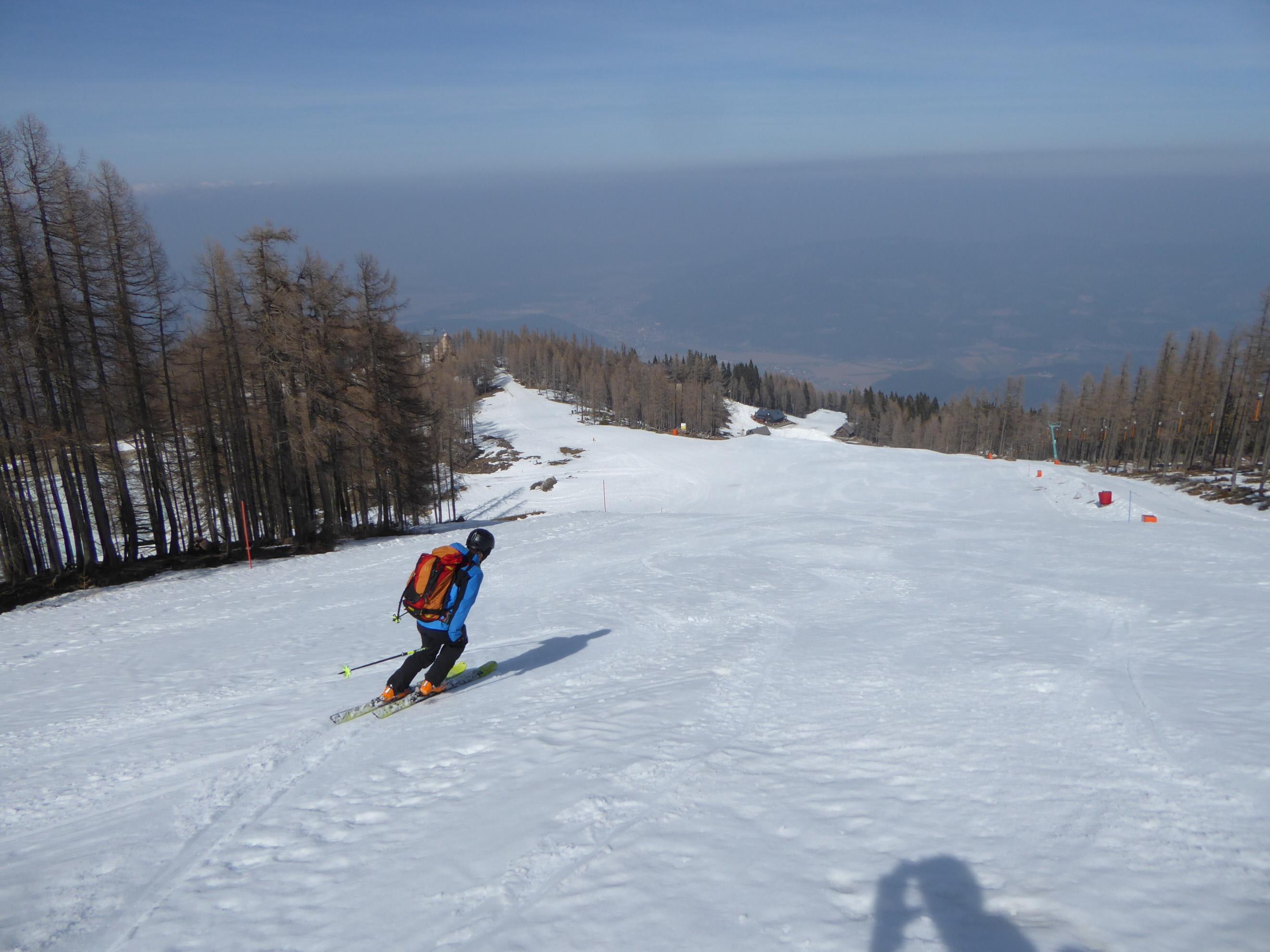 Das Skigebiet auf der Petzen hat mit Sonntag 19.3. die heurige Wintersaison beendet; daher haben wir die Pisten als Aufstiegs- und Abfahrtsrouten nutzen können; eine am Vortag telefonisch vor Ort eingeholte Auskunft, dahingehend, dass die Talabfahrt bis zum Schluss in Betrieb war und jetzt einige Flecken habe, war nicht ganz richtig (oder doch: es waren ein paar Schneefleckerl auf der grünen Wiese im untersten Teil der Abfahrt ;-)); wir haben daher etwa 30 min hinauf getragen und in der Abfahrt mit ein bisserl Schneefleckerl hupfen die letzten 60 Hm (8 min) wieder hinunter getragen; im Mittelteil einige Skiwegpassagen mit gerade noch genug Schnee für eine durchgehende Abfahrt (eine Unterbrechungsstelle 20 m); aber 1.550 Hm Genussabfahrt !!! (die man natürlich vorher hinauf gehen muss ;-))