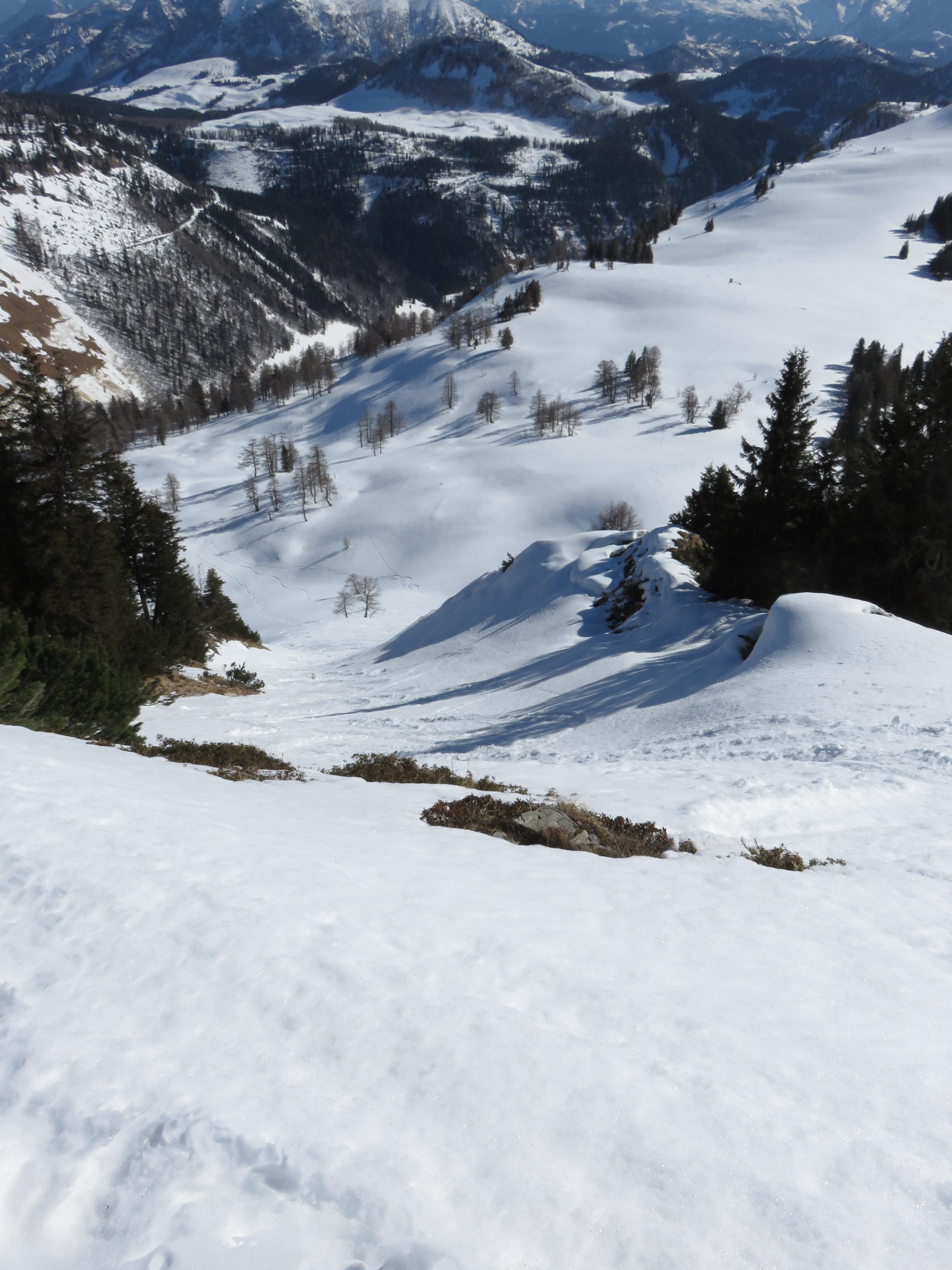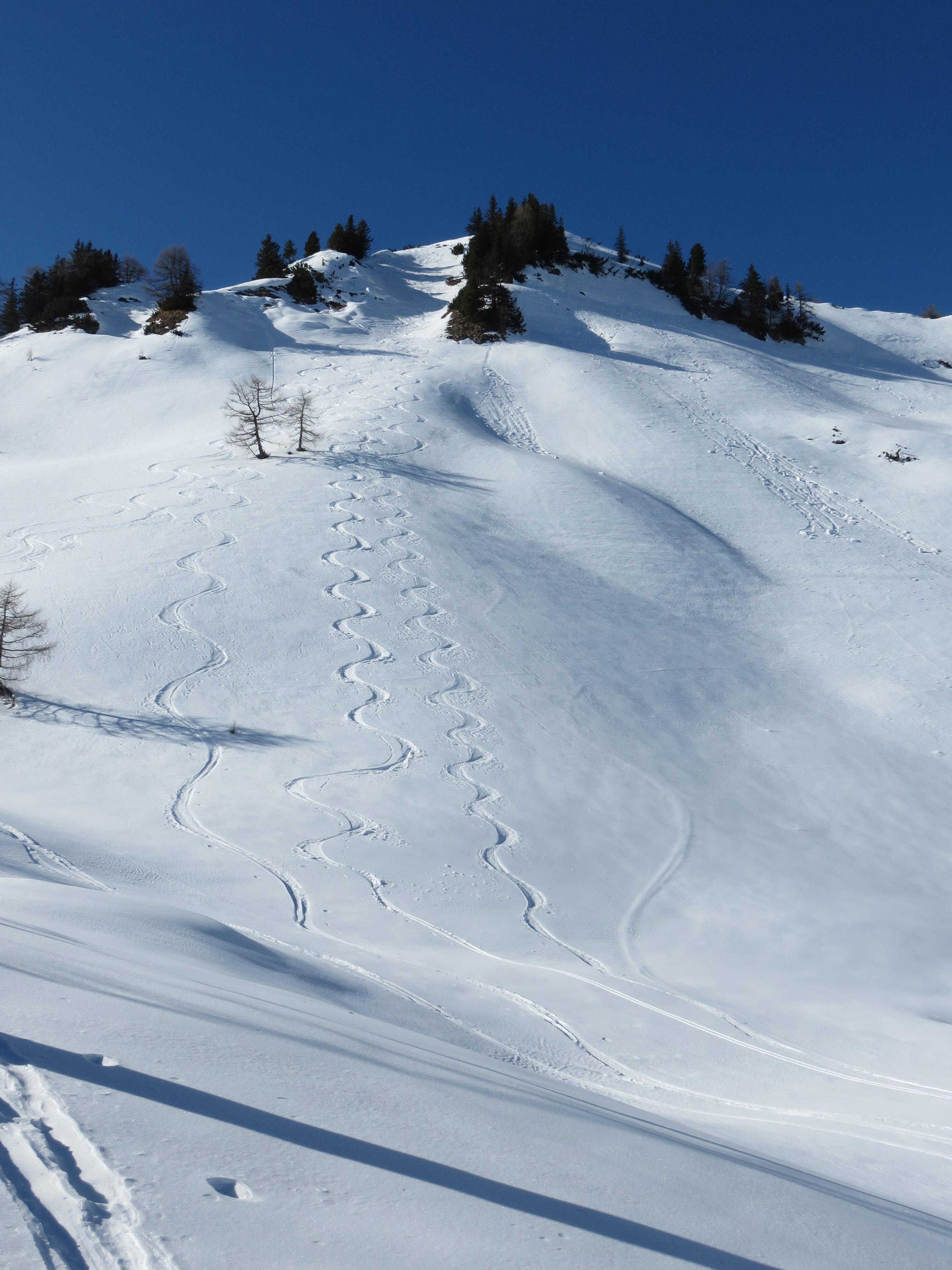 durch die südseitige Rinne um 13 Uhr einsinktiefe ca. 10cm die alten Spuren störten nicht. Aufstieg zum Hohen Zinken und Abfahrt nach Lämmerbach. Zinkenabfahrt gleicht einer Skipiste aber griffiger Pulver gut zu Fahren. Gesamtlänge der Tour 17km und 1680Hm