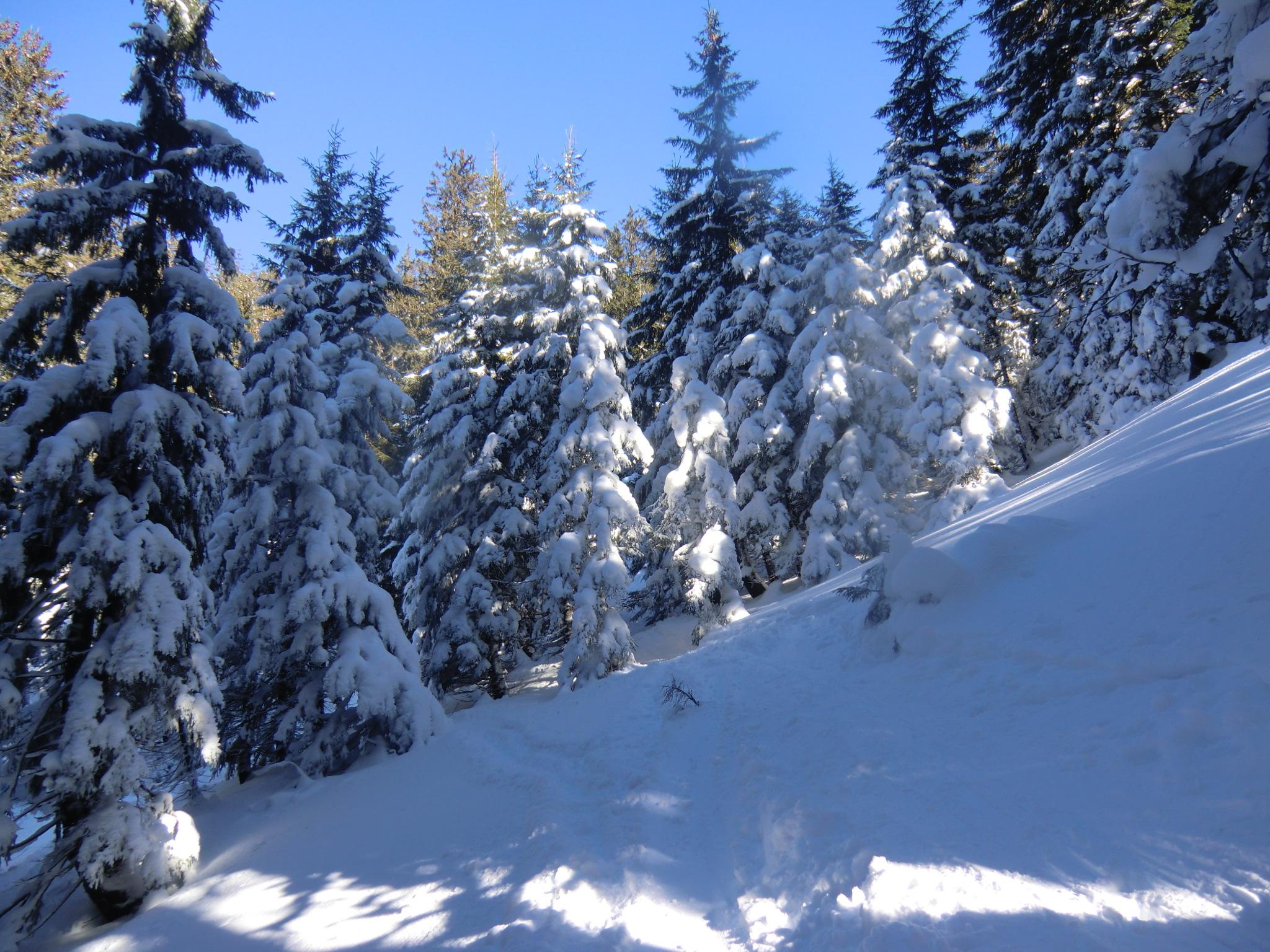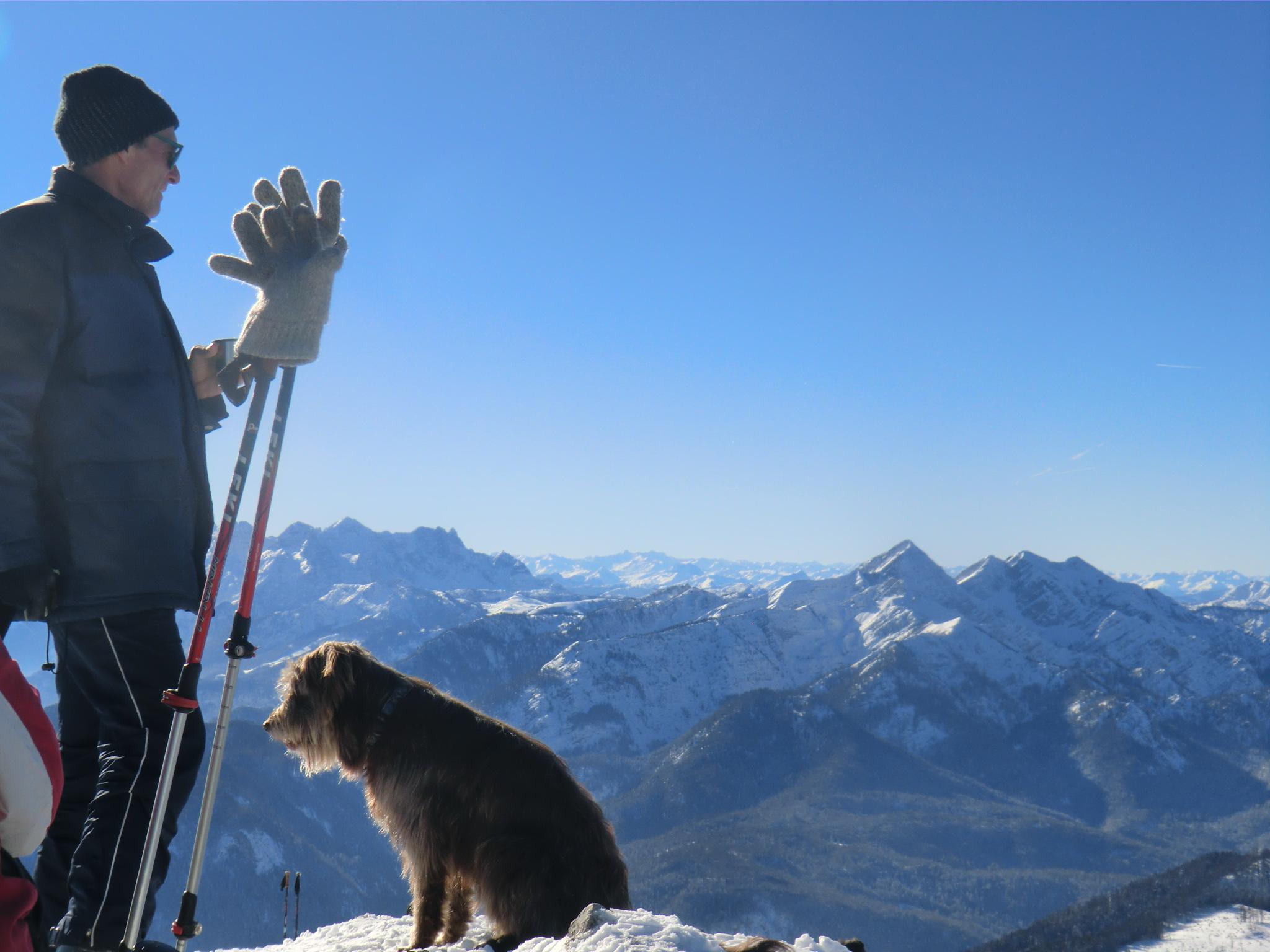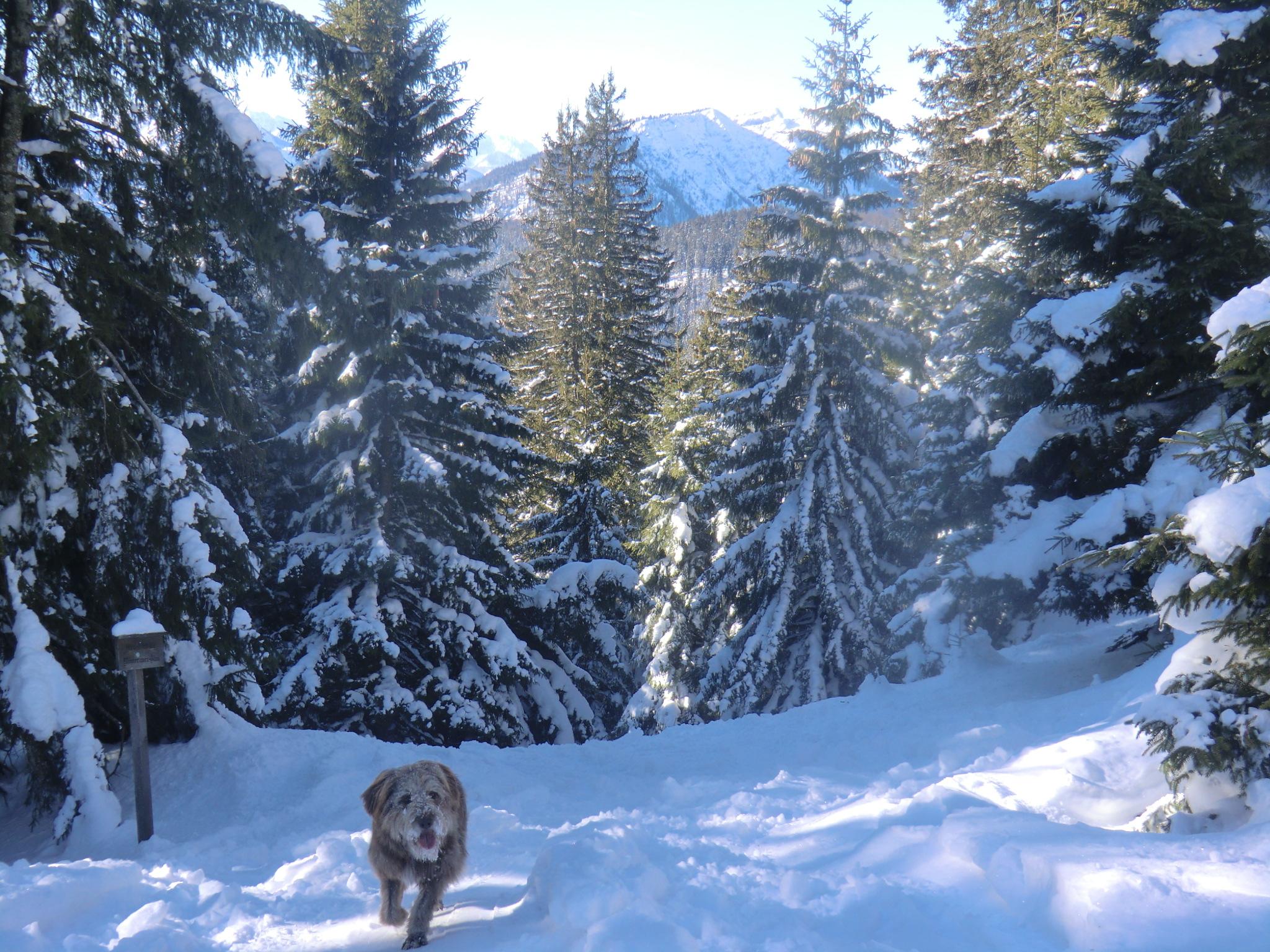 Heute war das Heutal-Paradies leider unerreichbar... eine laaange laaangsame Autoschlange wälzte sich über´s kleine deutsche Eck. Ein Ausweichziel mußte her ! Der PP am Jochberg (Weißbach a.d.A.) war dann um 9:30 auch voll. Seit dem letzten Eintrag am 18.1. hat die Sonne die Verhältnisse etwas verändert. Auf den sonnenbeschienenen freien Flächen unter dem Gipfel war der Schnee gesetzt und bissl schwer. Die Sonne hat den Bäumen schließlich auch das weiße Mäntelchen weggetaut. Dennoch gut: unten im Wald Januarpulver, oben Märzensonne. Mittags am Gipfel war es windstill und angenehm.