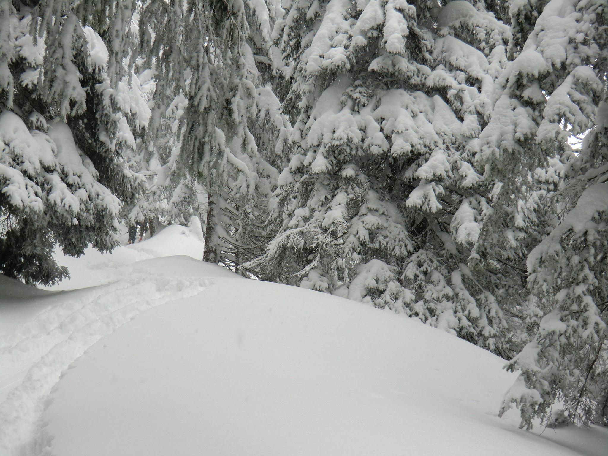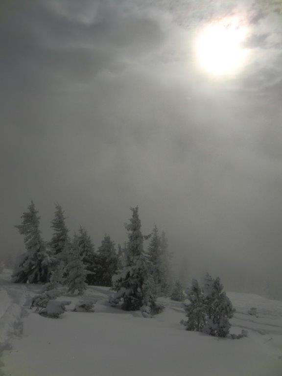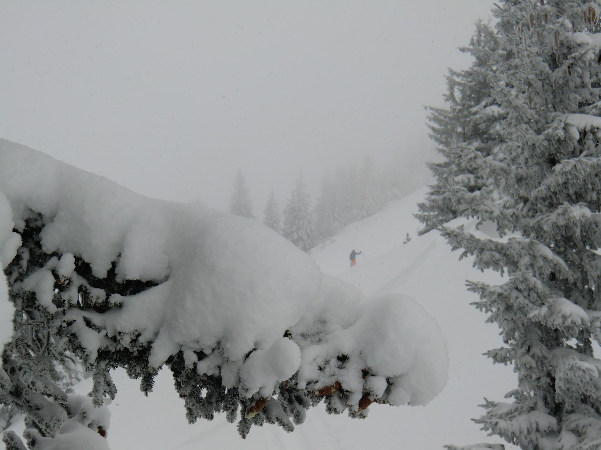 Die Schneepakete auf den Bäumen reichen bei meiner Körpergröße locker für eine Totalverschüttung aus. Mehr als 50cm Neuschnee sind in den letzten Tagen gefallen, aber offensichtlich nicht unter starkem Windeinfluß. Reichlich Schneeschauer wurden heute immer wieder von sonnigen Auflockerungen unterbrochen. Beim Aufstieg reichte die Sicht grade mal bis zu den Schispitzen – aber mehr braucht´s da ja auch nicht. Die Sicht wurde zunehmend besser. Das Abfahrtsvergnügen wurde durch die gewaltigen Neuschneemengen etwas gebremst, aber dafür konnte man heute auch mal die steileren Passagen in Angriff nehmen. Ein Winterzaubermärchentag... der ein bisschen bilderlastig ausfällt ;-)