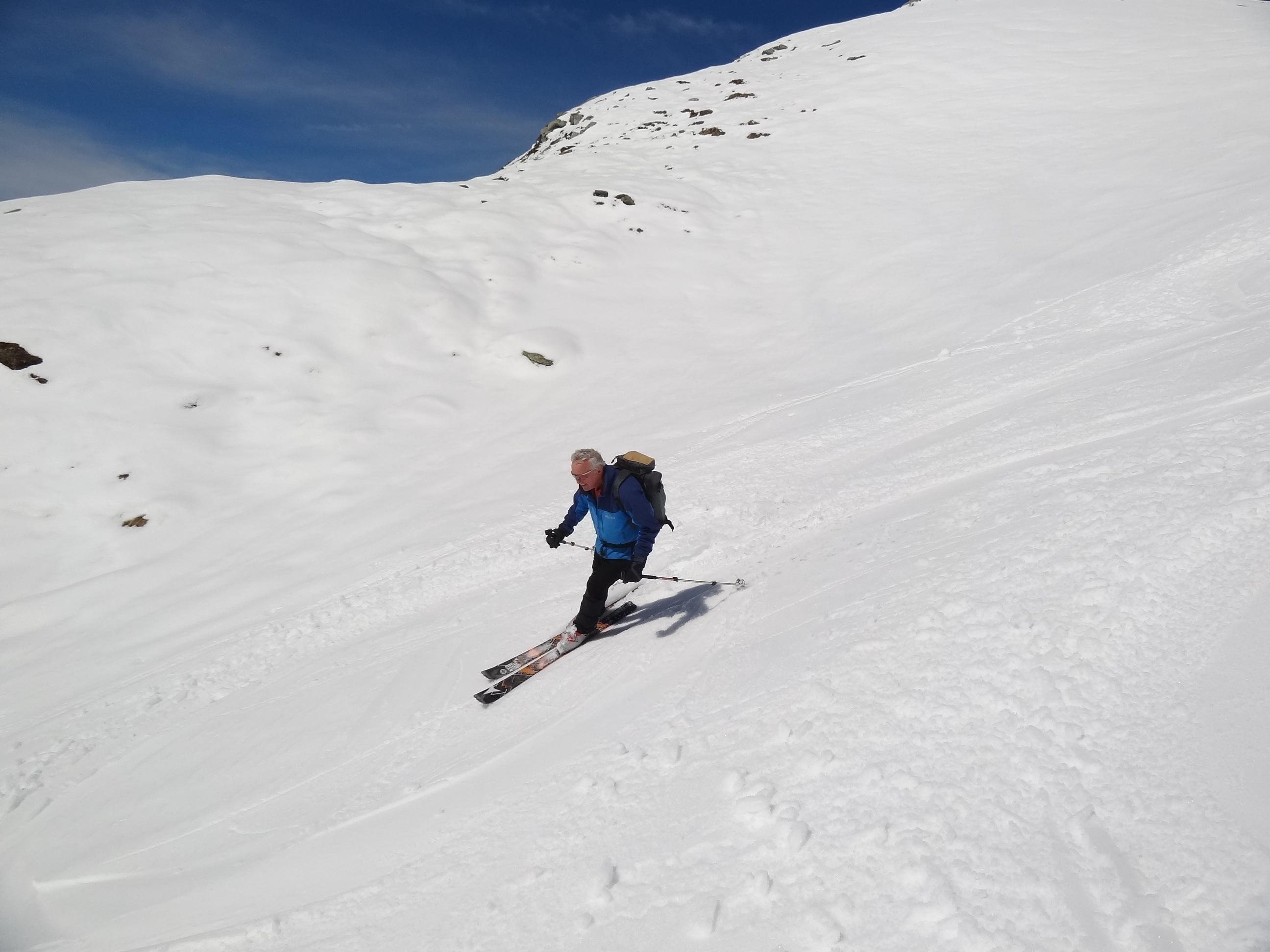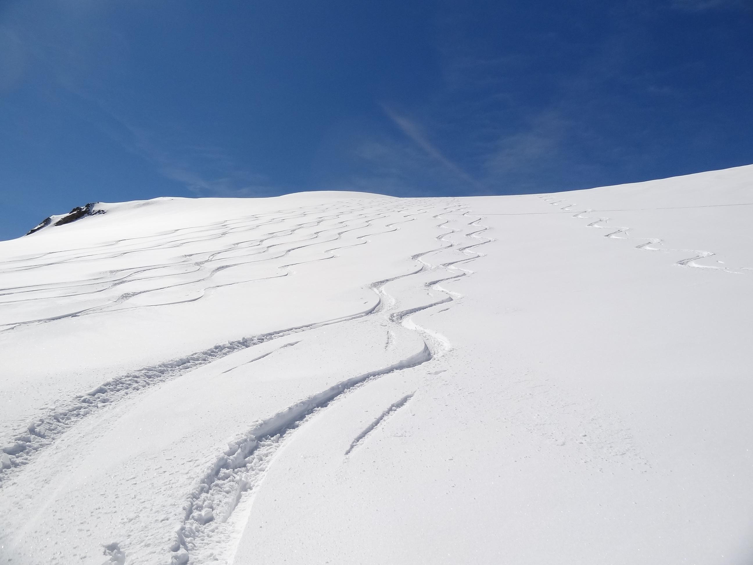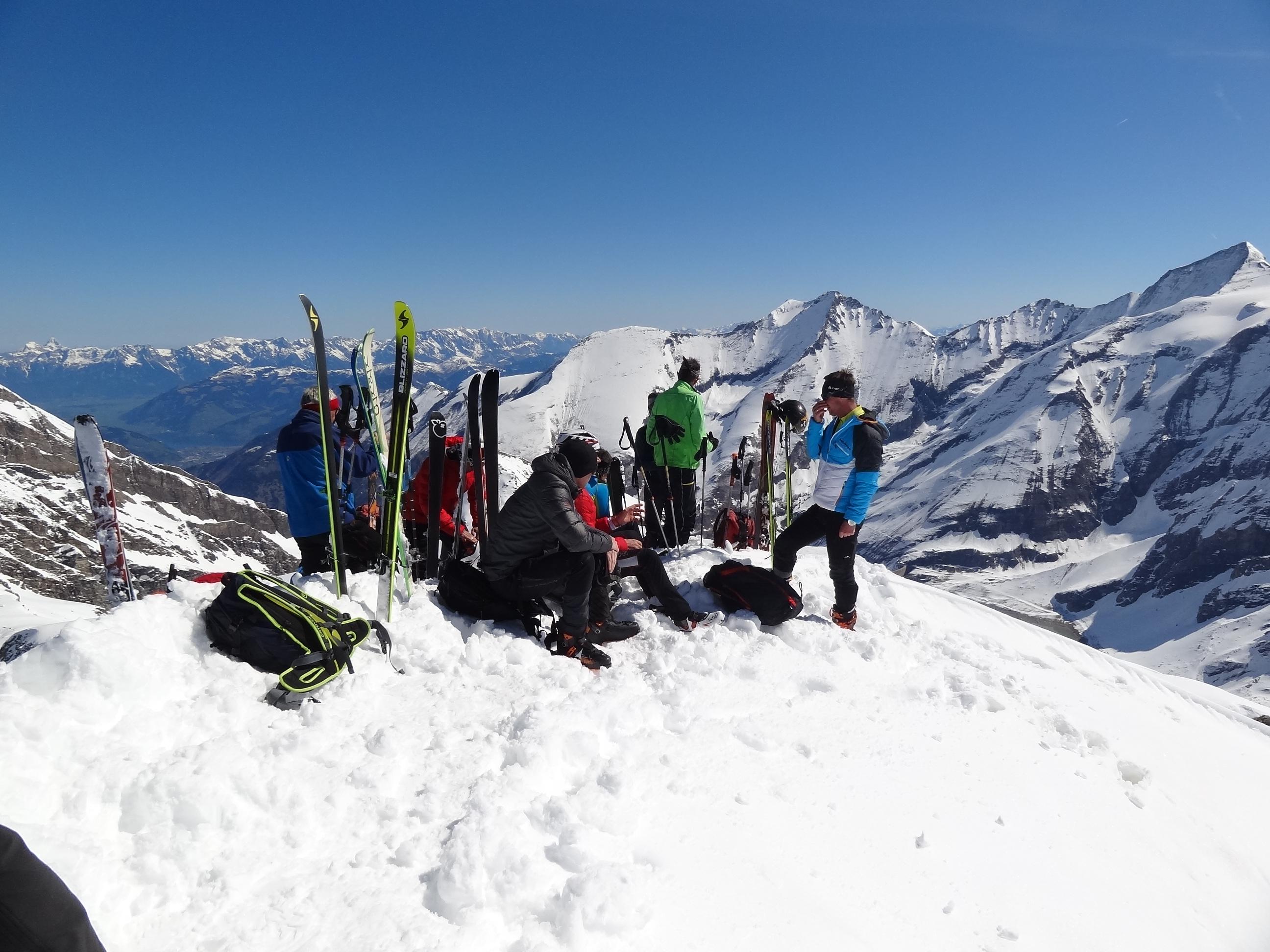 Die Tourensaison ist noch nicht zu Ende. Heute waren ca. 20 Tourengeher am Hocheiser. Wegen des Neuschnees vom Dienstag konnten wir schon nach einer viertelstündigen Tragepassage die Tourenschi anlegen. Bis auf 2800 m hinauf tragfähiger Schmelzharschdeckel, dann Pulver. Bei der Abfahrt umgekehrt: Pulver - Harschdeckel und dann feinster Firn.