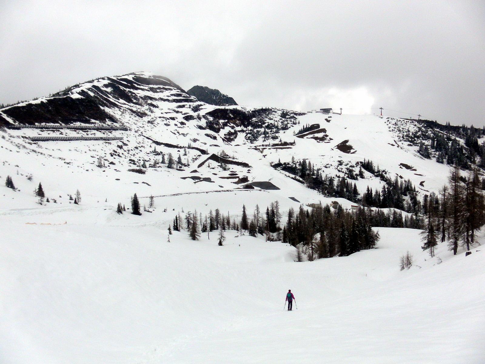 Am Sonntag von Flachauwinkl auf den Mooskopf: die liebenswerterweise knollig präparierte Rillen-Piste noch ohne Unterbrechung befahrbar, weich, bremsend.