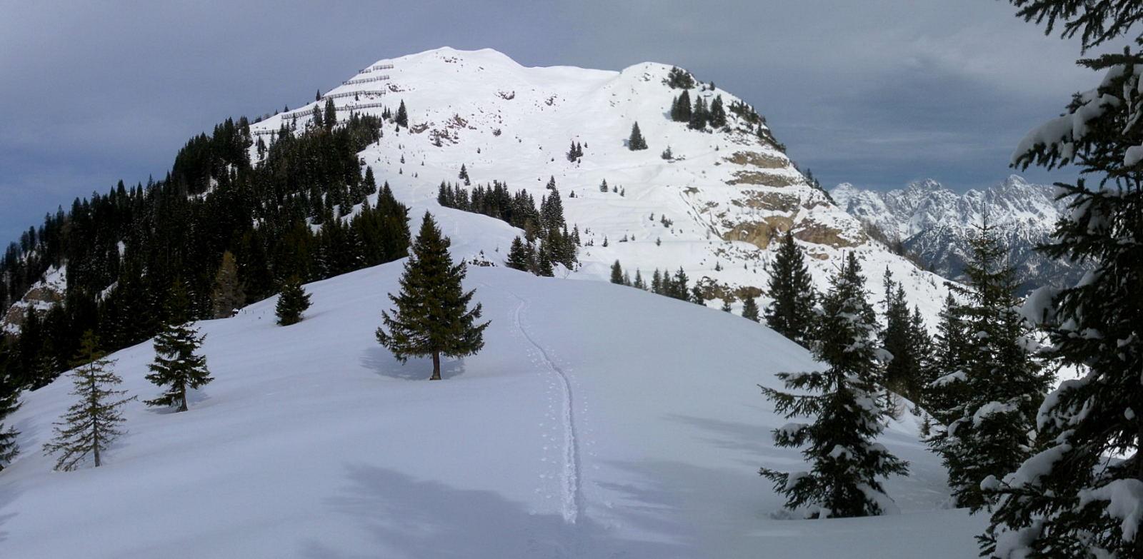 Es stehen nun zwei Anstiegsspuren am Gipfelhang zur Verfügung: am "Grat" entlang der Lawinenverbauungen (Klappert) und in der zuletzt steilen Mulde rechts vom Gipfel (von mir).