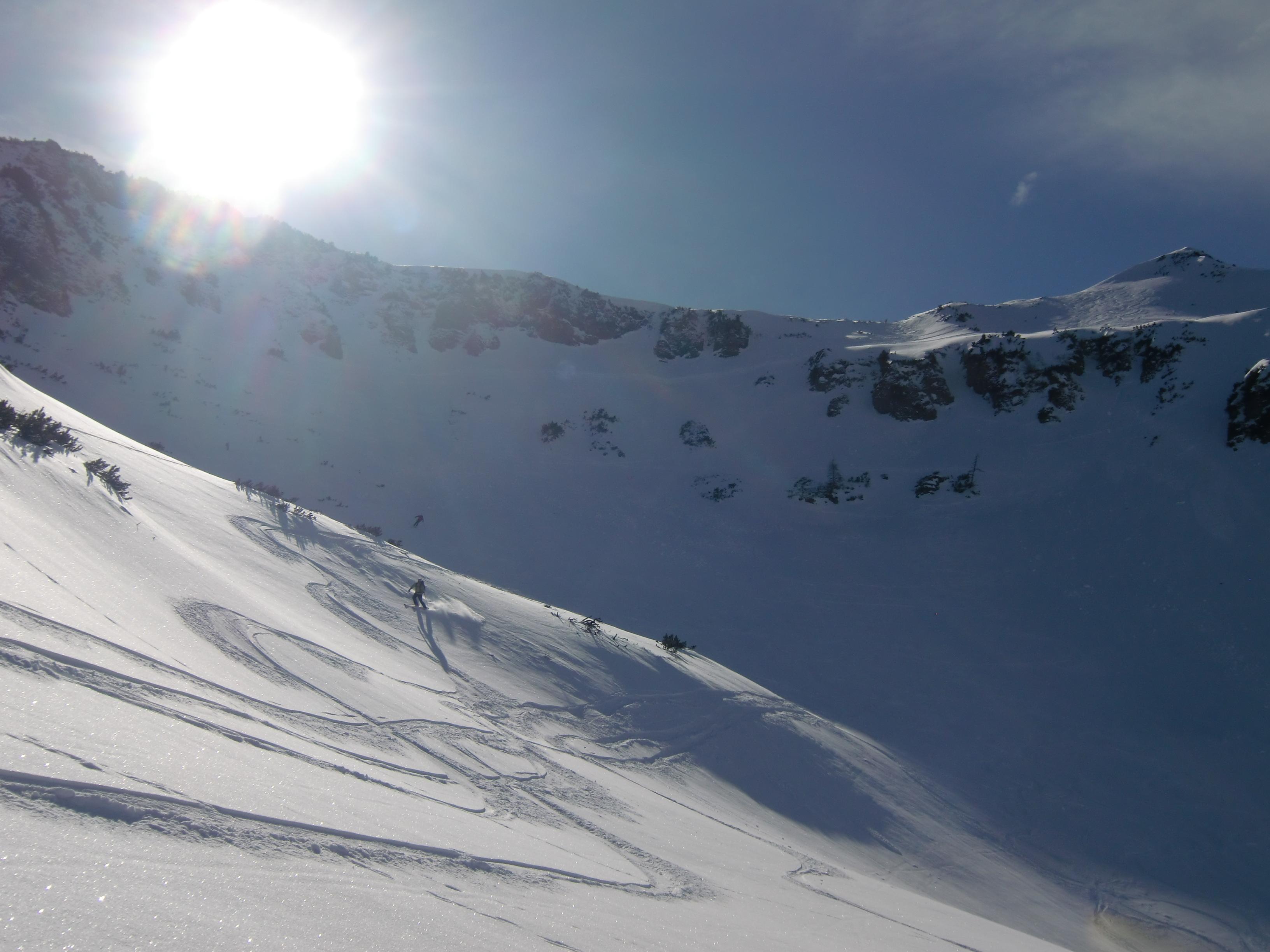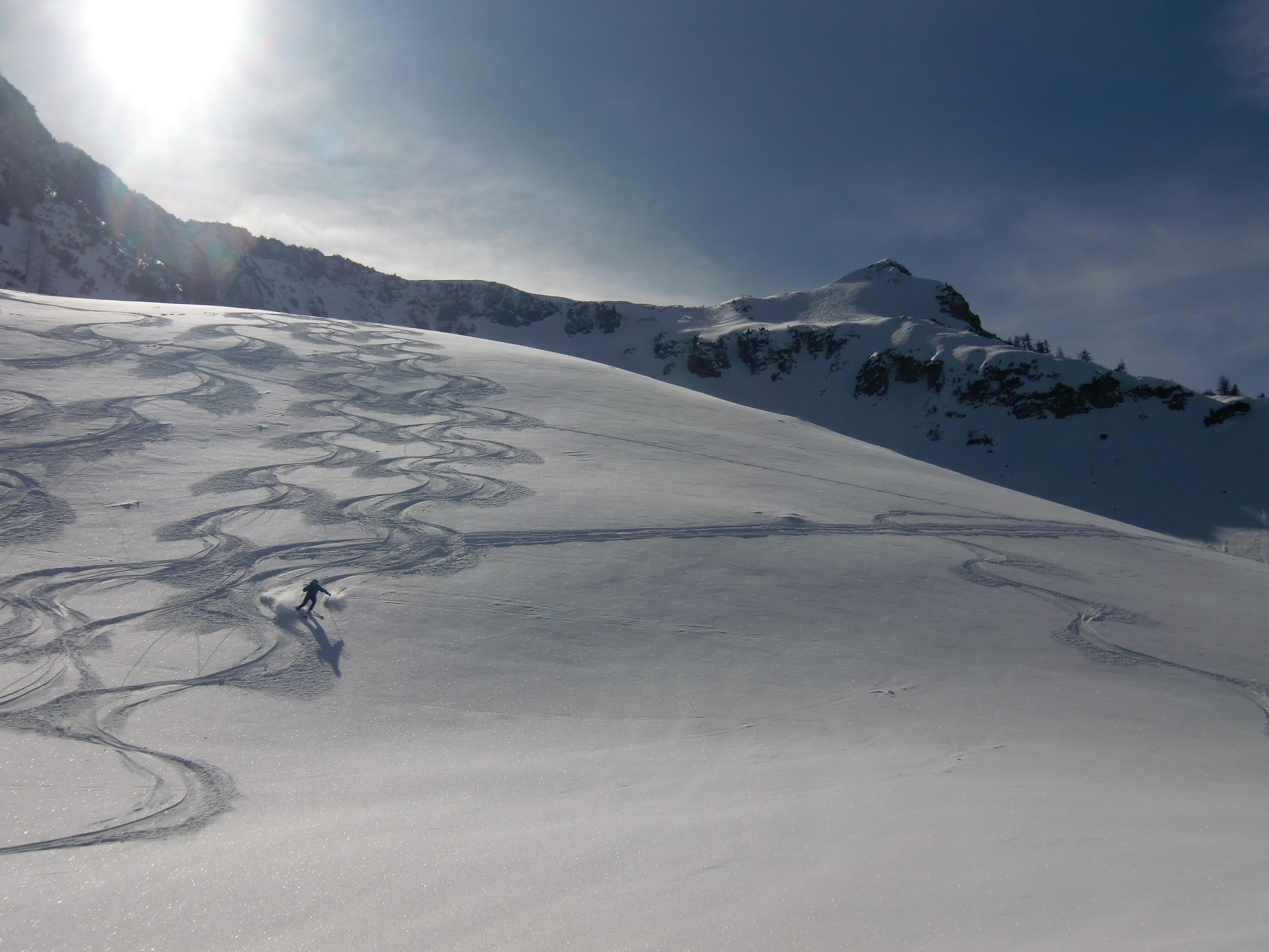Schnee: Oben ein Hauch Pulver auf harter, fast eisiger Unterlage, dann knapp 100Hm lästig auf steinharten, angefrorenen Lawinenknollen, dann wieder Pulver auf tragendem Harsch und ab der Mitte dann Schmier-Firn vom Feinsten, also alles da da da.