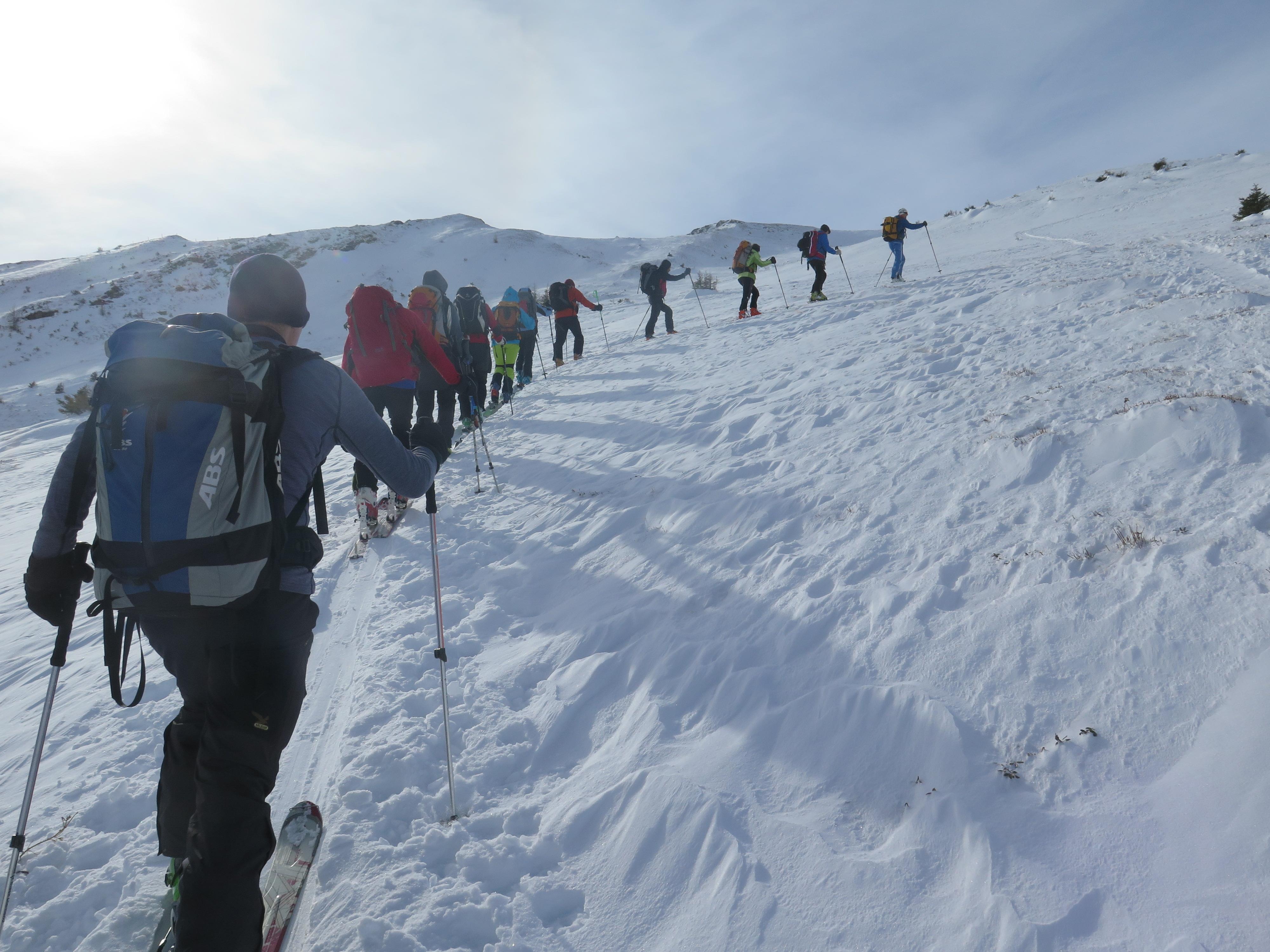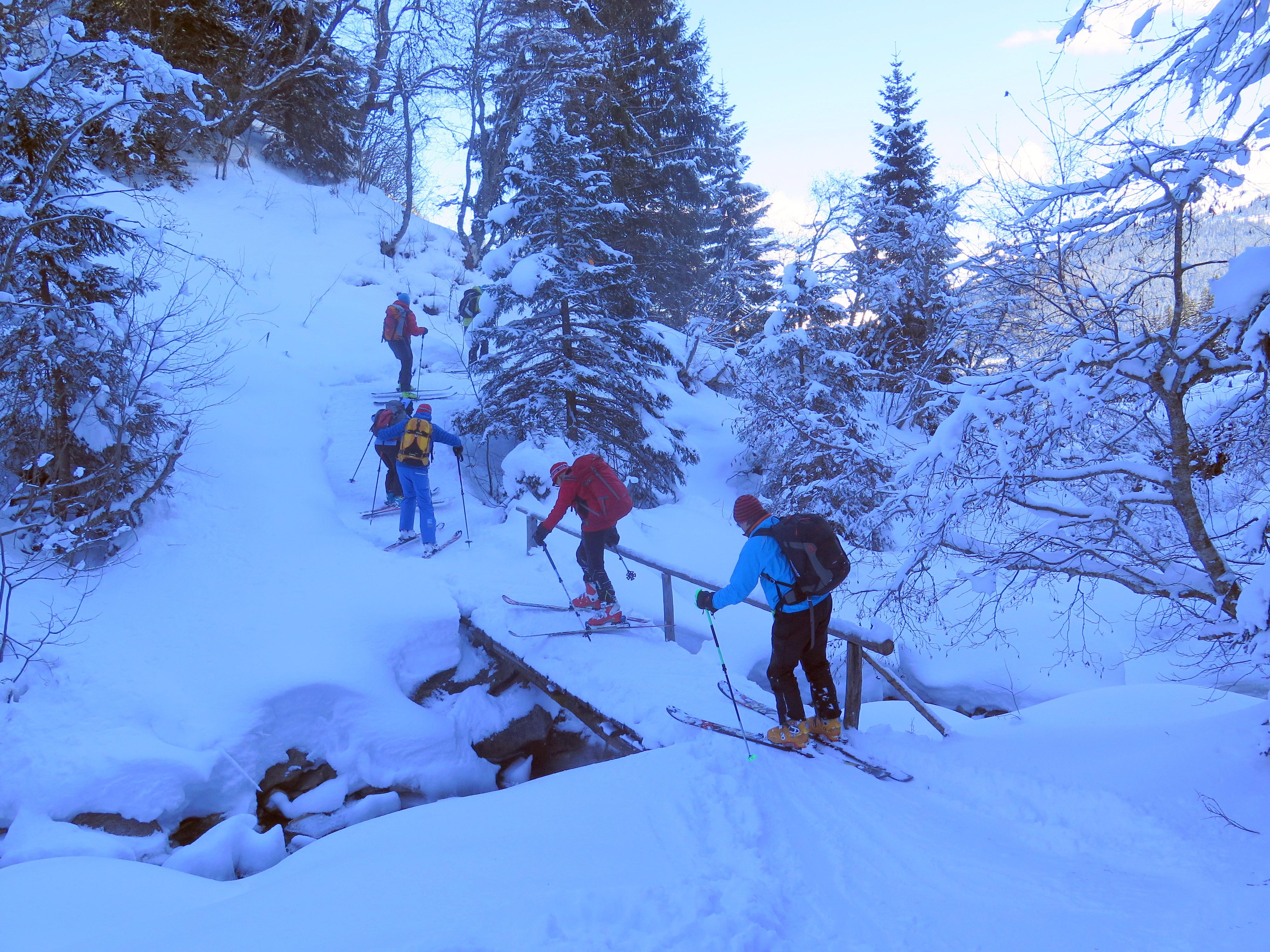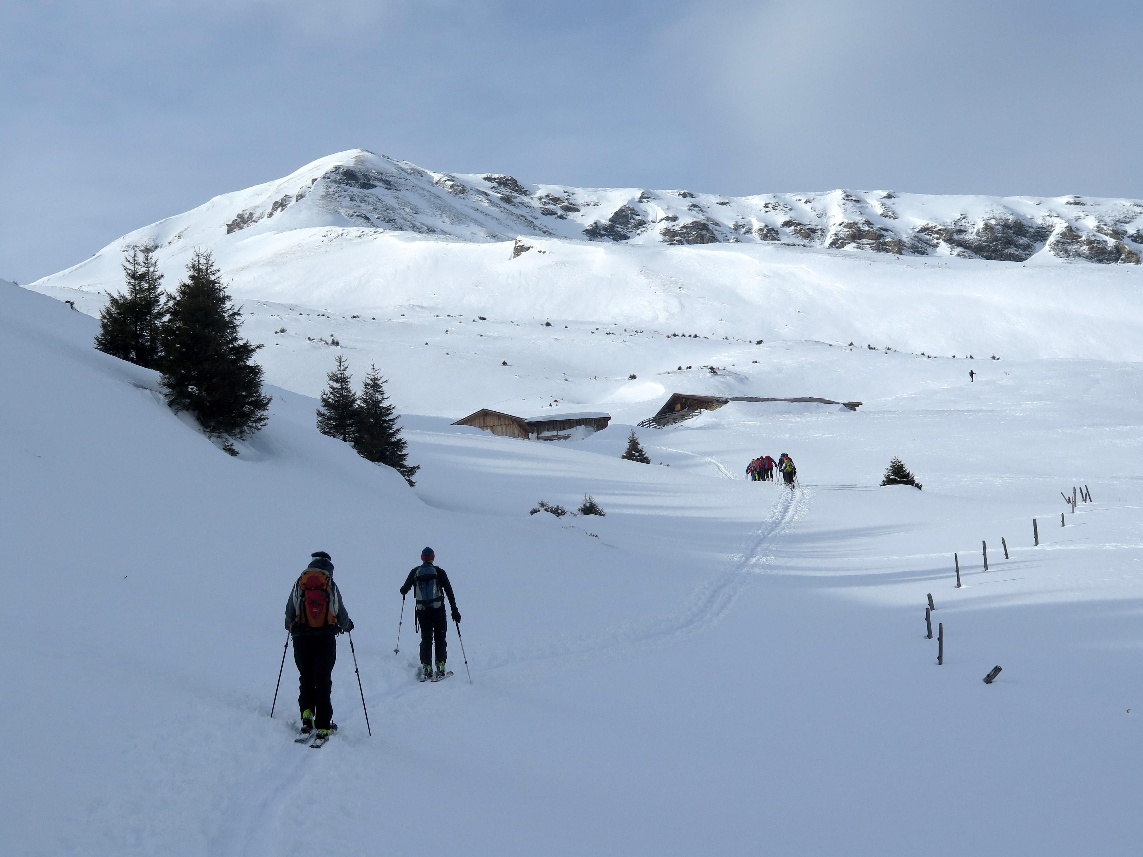 Vom Skizentrum Angertal über den Sommerweg durch den tief verschneiten Karteisenwald über die Gadauner Hochalmen zum Plateau beim Kreuz im Übergang zur Eckelgruben. Über den Ost-Rücken bis auf ca. 2300 m, wo wir bei zeitweise stürmischem Föhn eine gute Einfahrt ins Schwalbenkar nutzten. Abfahrt über schöne freie Hänge unterhalb der Almhütten bis in den Lafenbach-Graben. Sonnseitig zurück bis zu den Pisten hnunter ins Angertal.