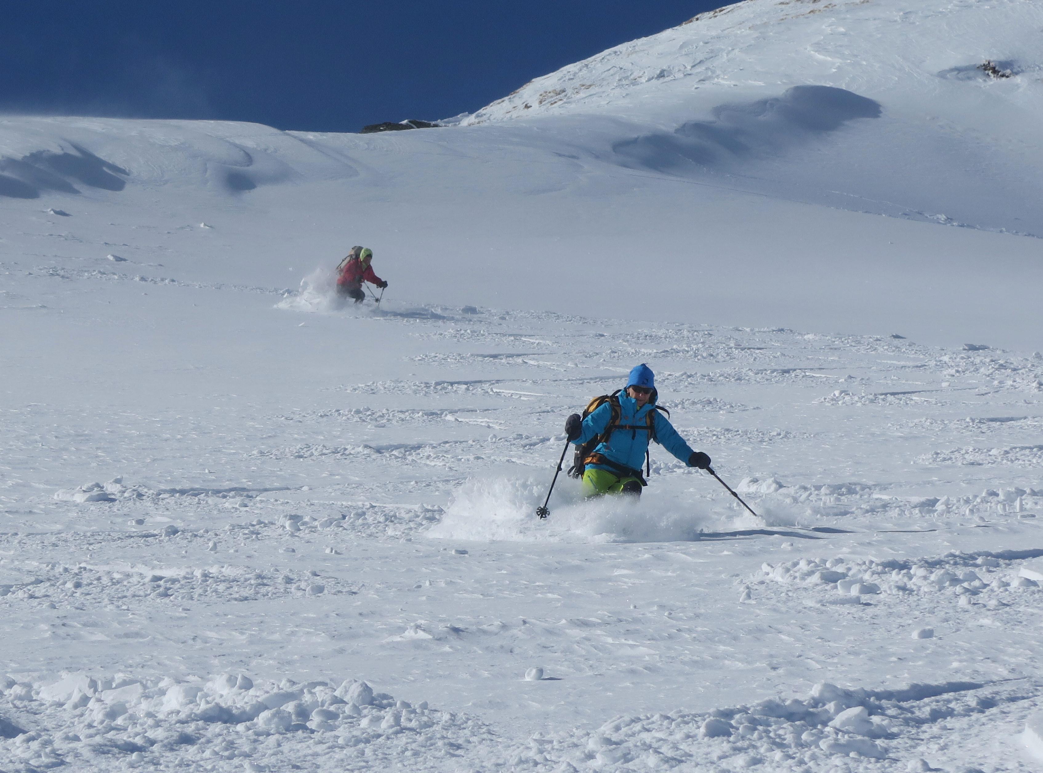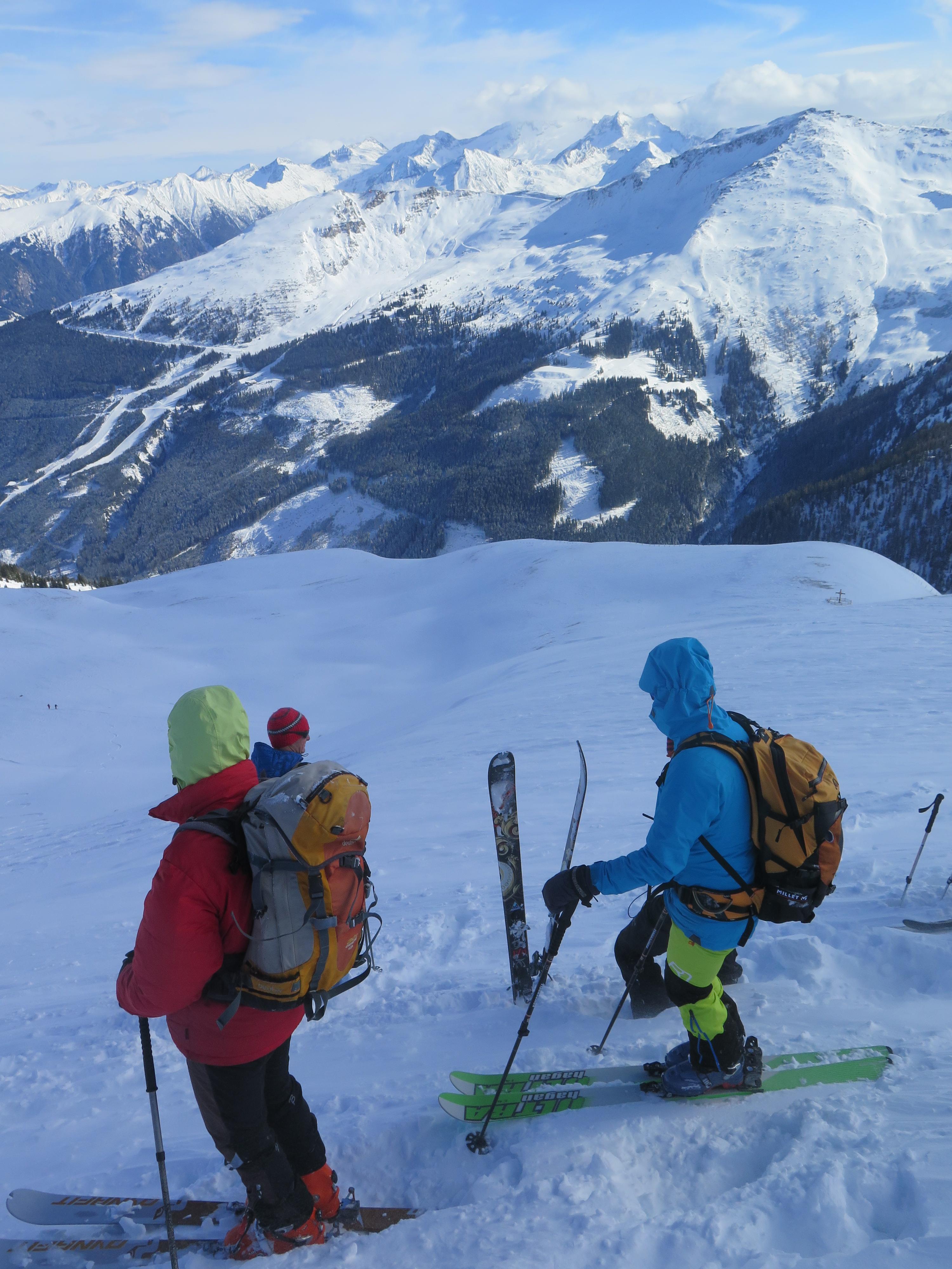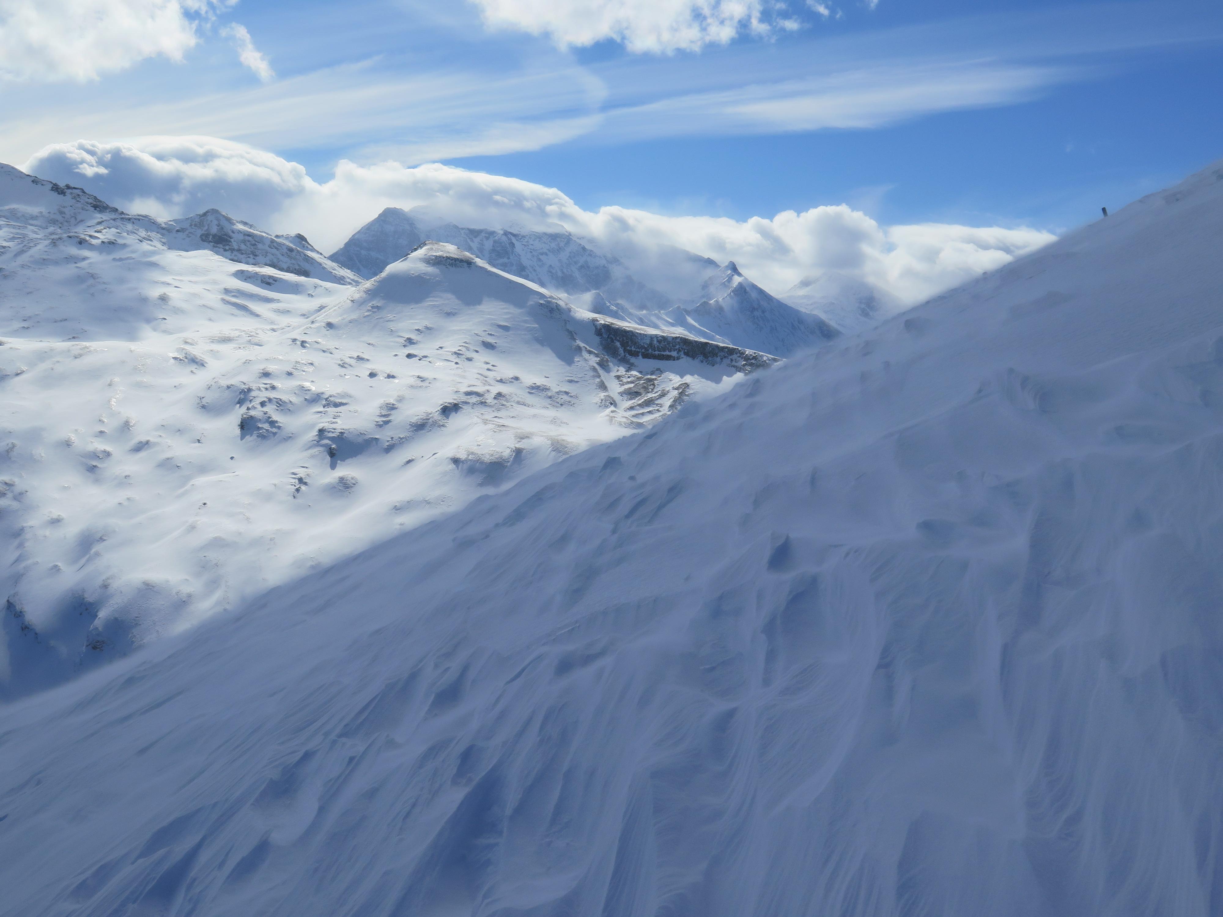 Oberhalb der Waldgrenze erhebliche Windverfrachtung, stark unterschiedliche Schneehöhen, exponiertes Gelände teilweise ganz ausgeweht. Entlang unserer Aufstiegsspur keine besonderen akuten Gefahrenzeichen wie Setzungsgeräusche o.ä. Die Einfahrt ins Schwalbenkar an mehreren Stellen problemlos möglich, allerdings verlangen die mächtigen Treibschneepakete im Übergang vom Ostrücken ins Kar den nötigen Respekt. Unterhalb der Gadauner Hochalmen noch schöne Hänge mit spannungsfreiem, gut gesetztem Pulver.