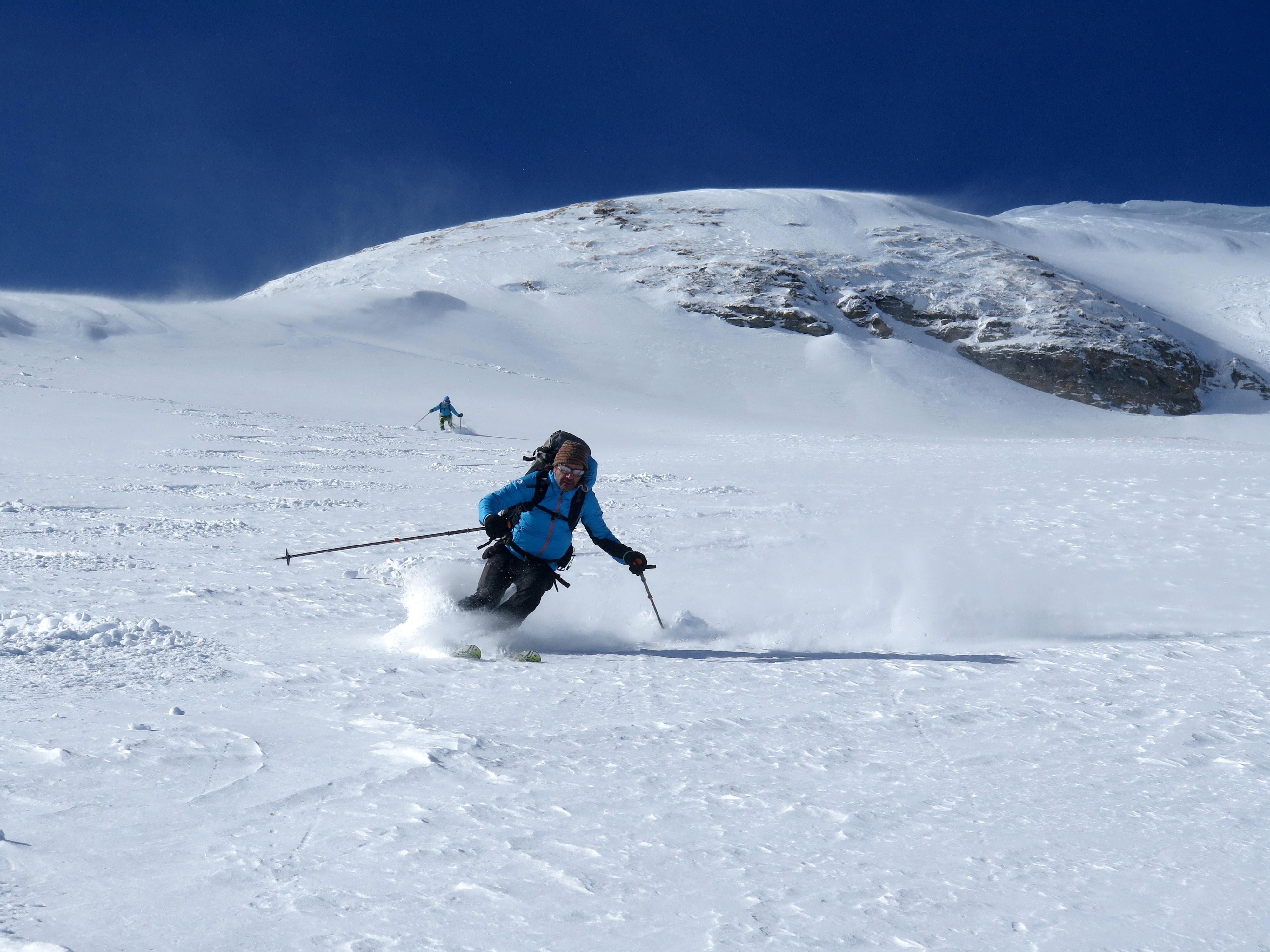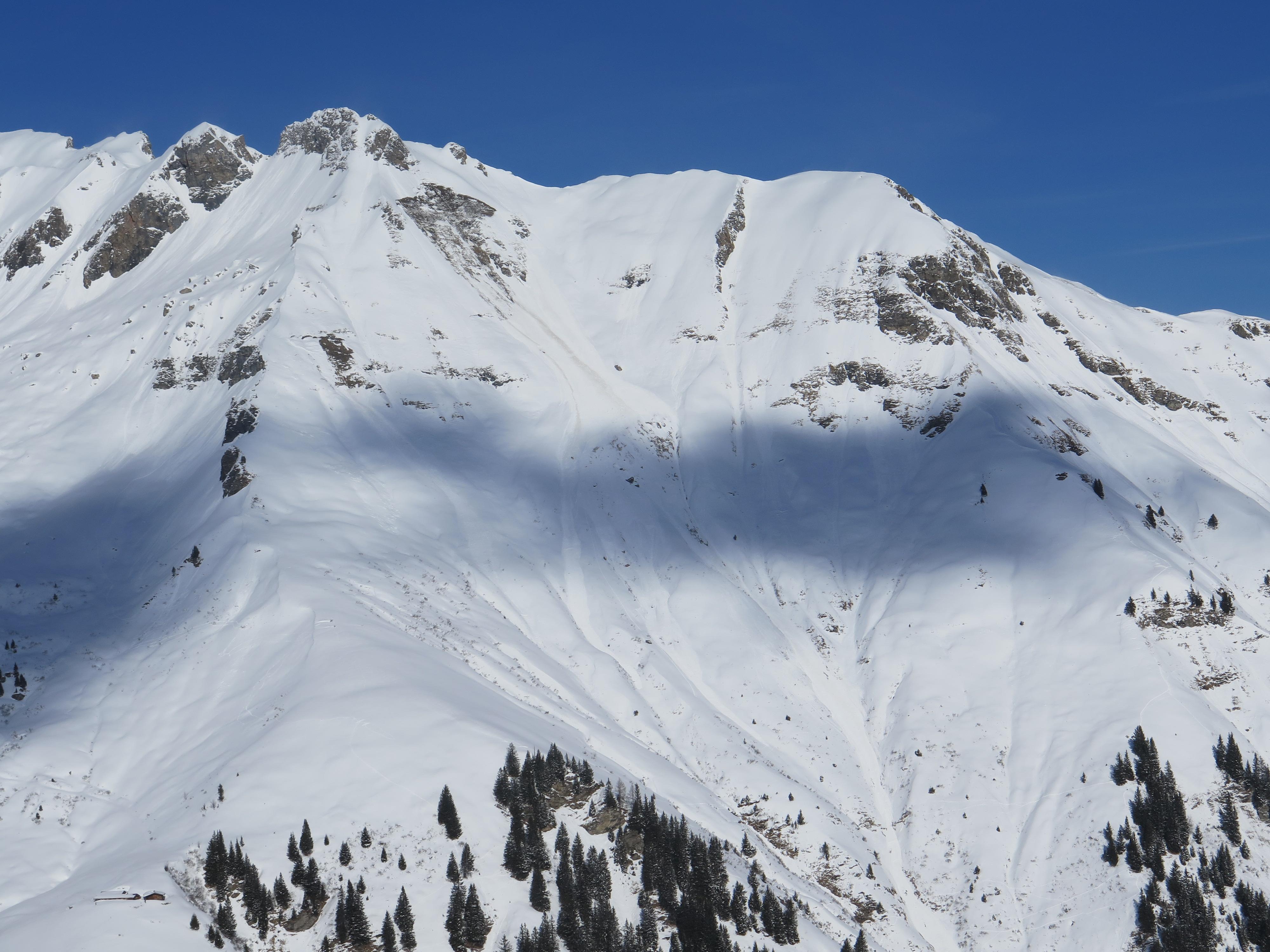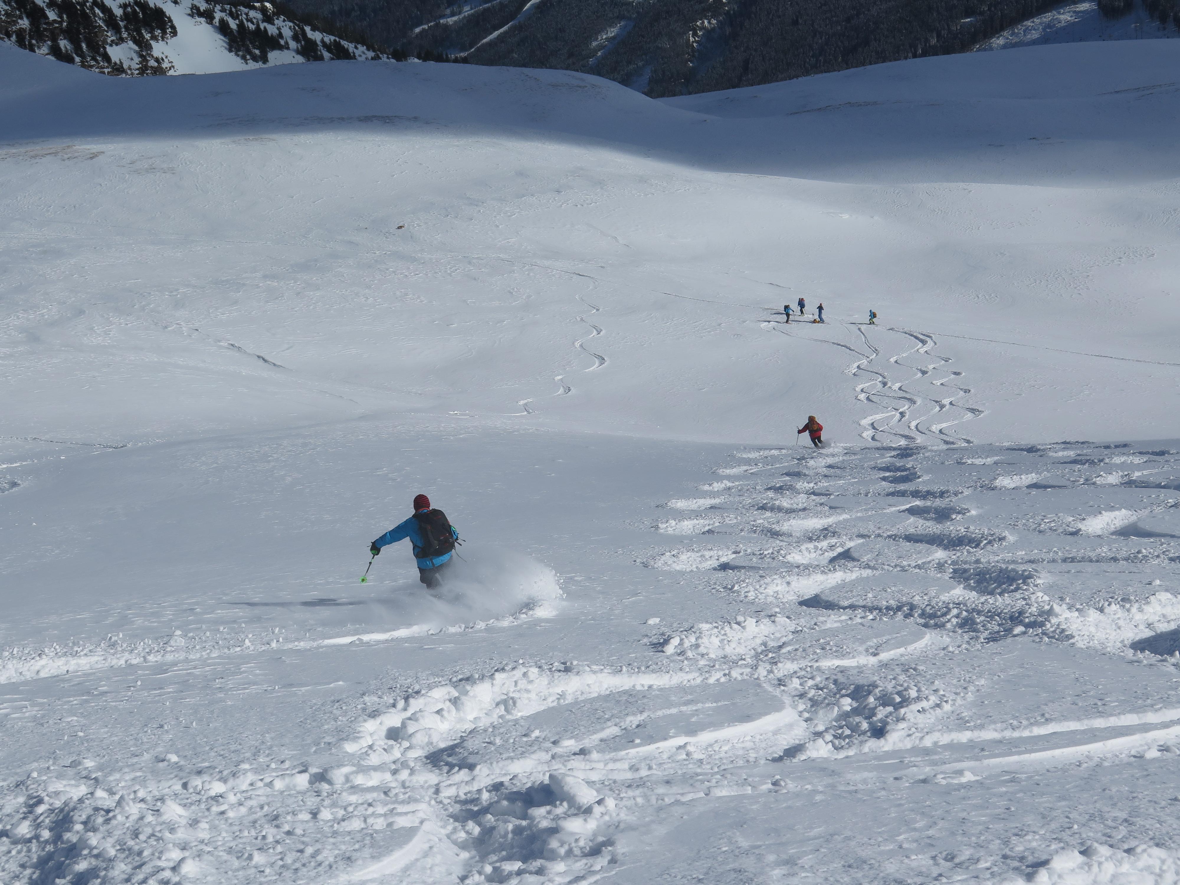 Oberhalb der Waldgrenze erhebliche Windverfrachtung, stark unterschiedliche Schneehöhen, exponiertes Gelände teilweise ganz ausgeweht. Entlang unserer Aufstiegsspur keine besonderen akuten Gefahrenzeichen wie Setzungsgeräusche o.ä. Die Einfahrt ins Schwalbenkar an mehreren Stellen problemlos möglich, allerdings verlangen die mächtigen Treibschneepakete im Übergang vom Ostrücken ins Kar den nötigen Respekt. Unterhalb der Gadauner Hochalmen noch schöne Hänge mit spannungsfreiem, gut gesetztem Pulver.