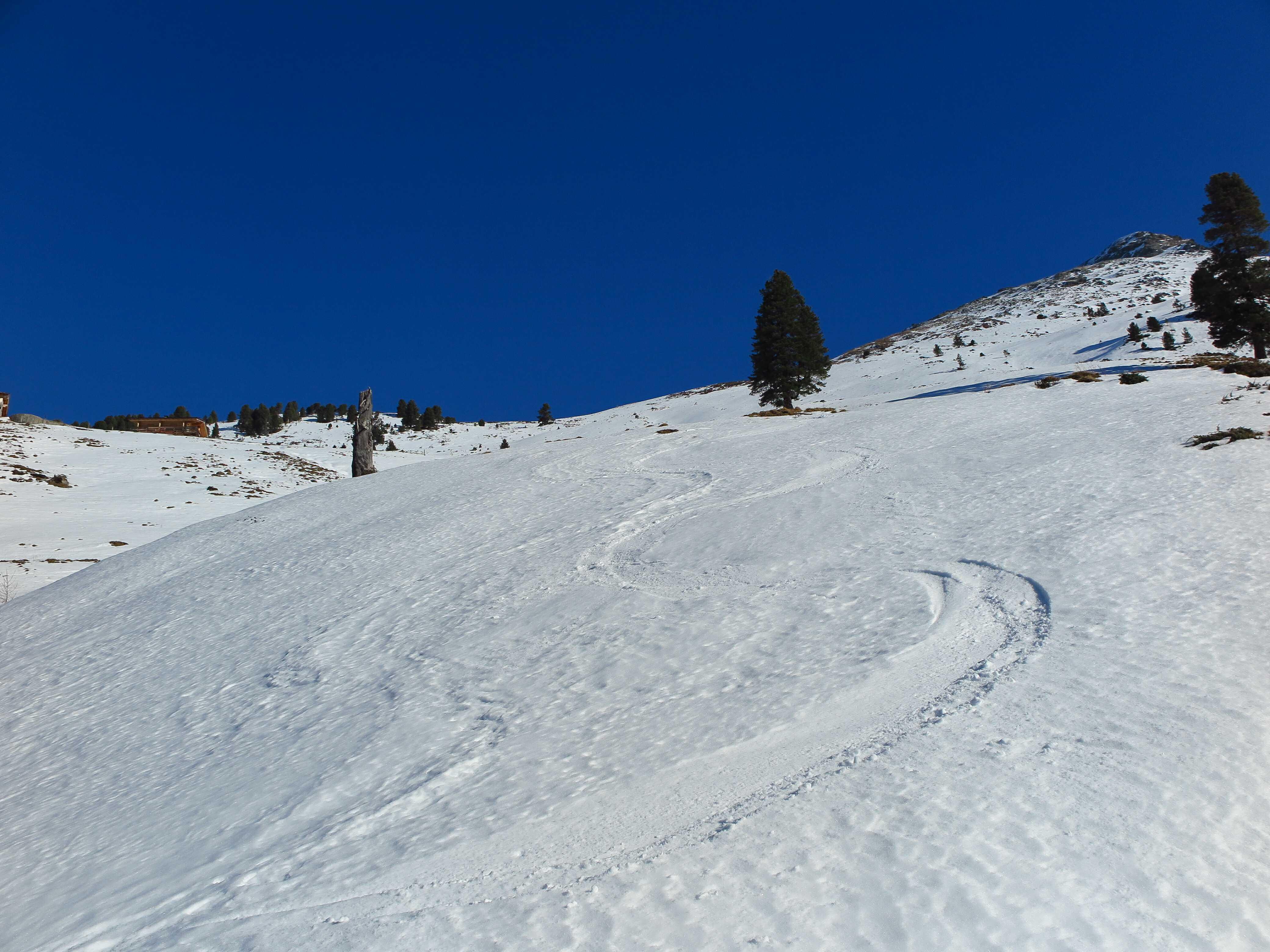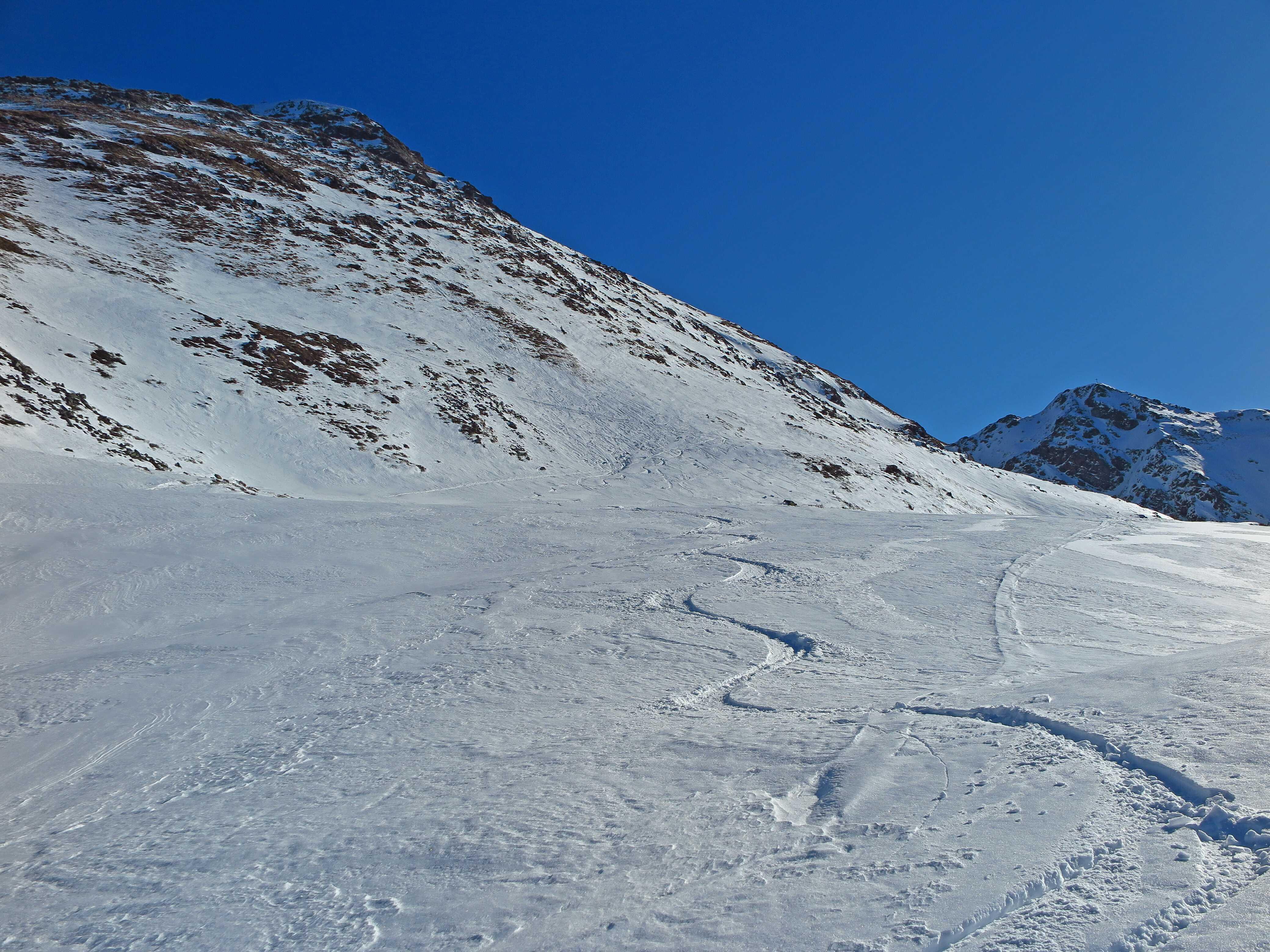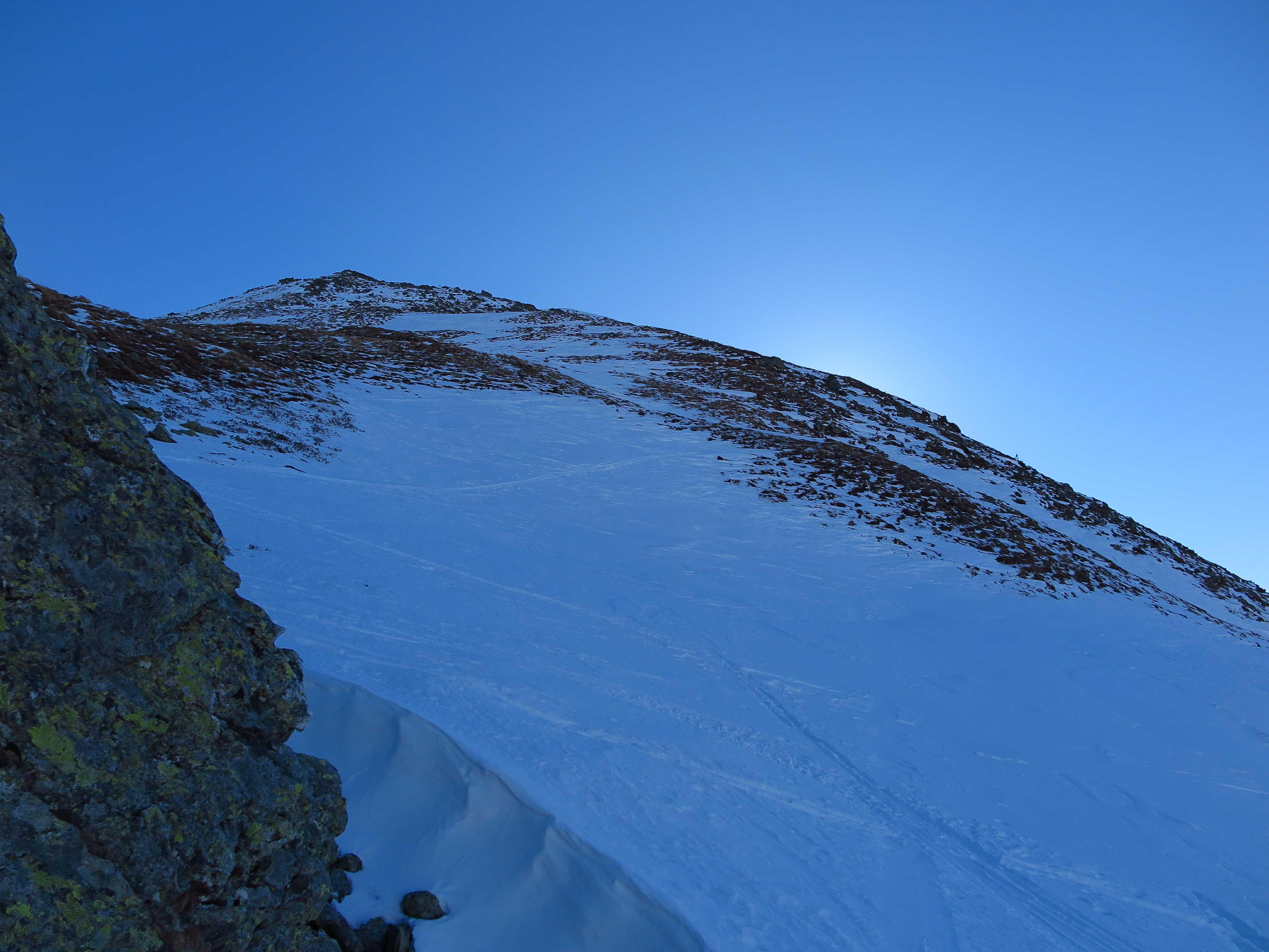 Schneelage: Ausreichend viel Schnee vom PP weg. Alles tragender Harsch, dadurch recht angenehm zu gehen. Oberhalb 1900m stellenweise abgelagerter Pulver. Fußweg ab Skidepot etwas mühsam, da man in den Schneefeldern immer bis zum Grund im Schwimmschnee einbrach. Gestern stieg jemand bis zum Gipfel mit Skiern auf, war wohl einfacher zu gehen, musste aber dann die Ski runtertragen, da für Abfahrt zu wenig Schneeauflage. Oben traumhafter Rundblick. Abfahrt ganz oben z.T. noch etwas Pulverauflage, dann tragender Harsch und Firn, keinerlei Untergrundkontakte. Ging wesentlich besser als der anfängliche Blick vom Tal aus es erwarten ließ.