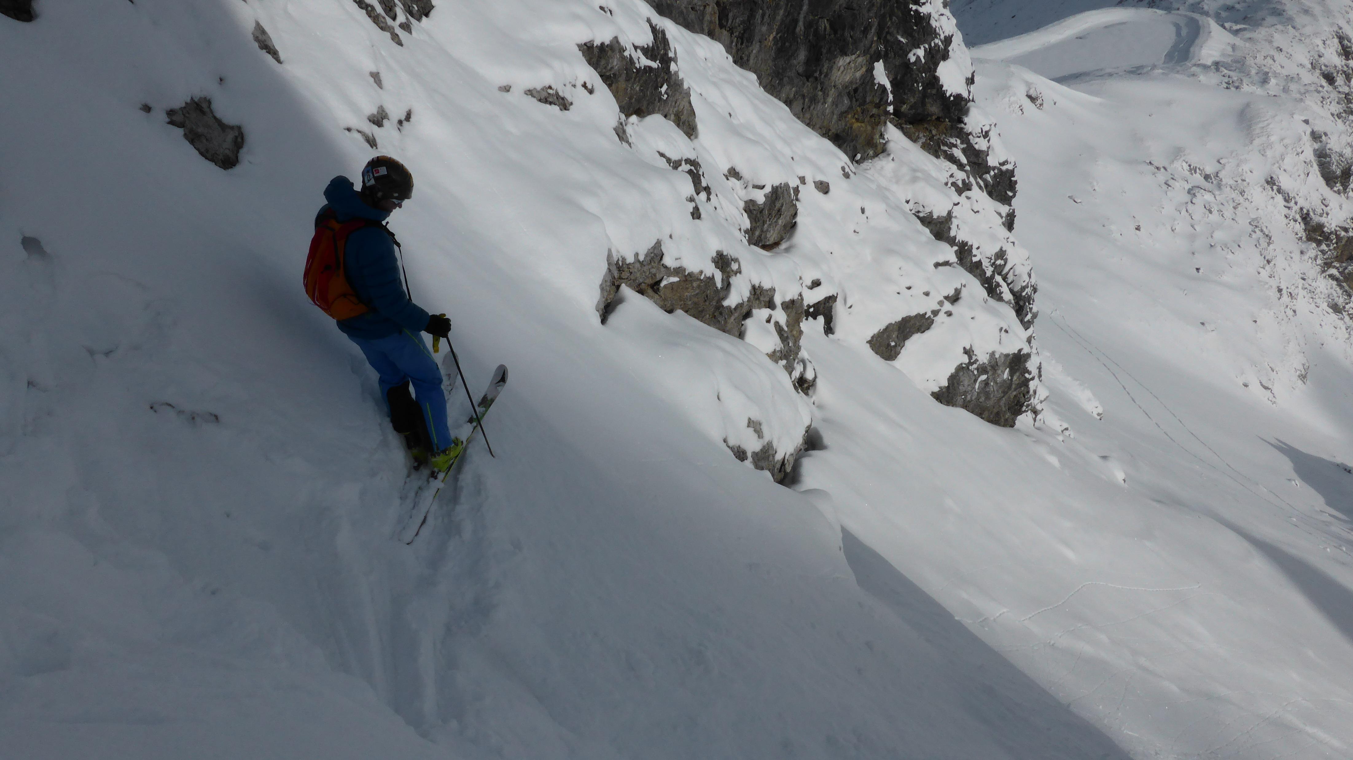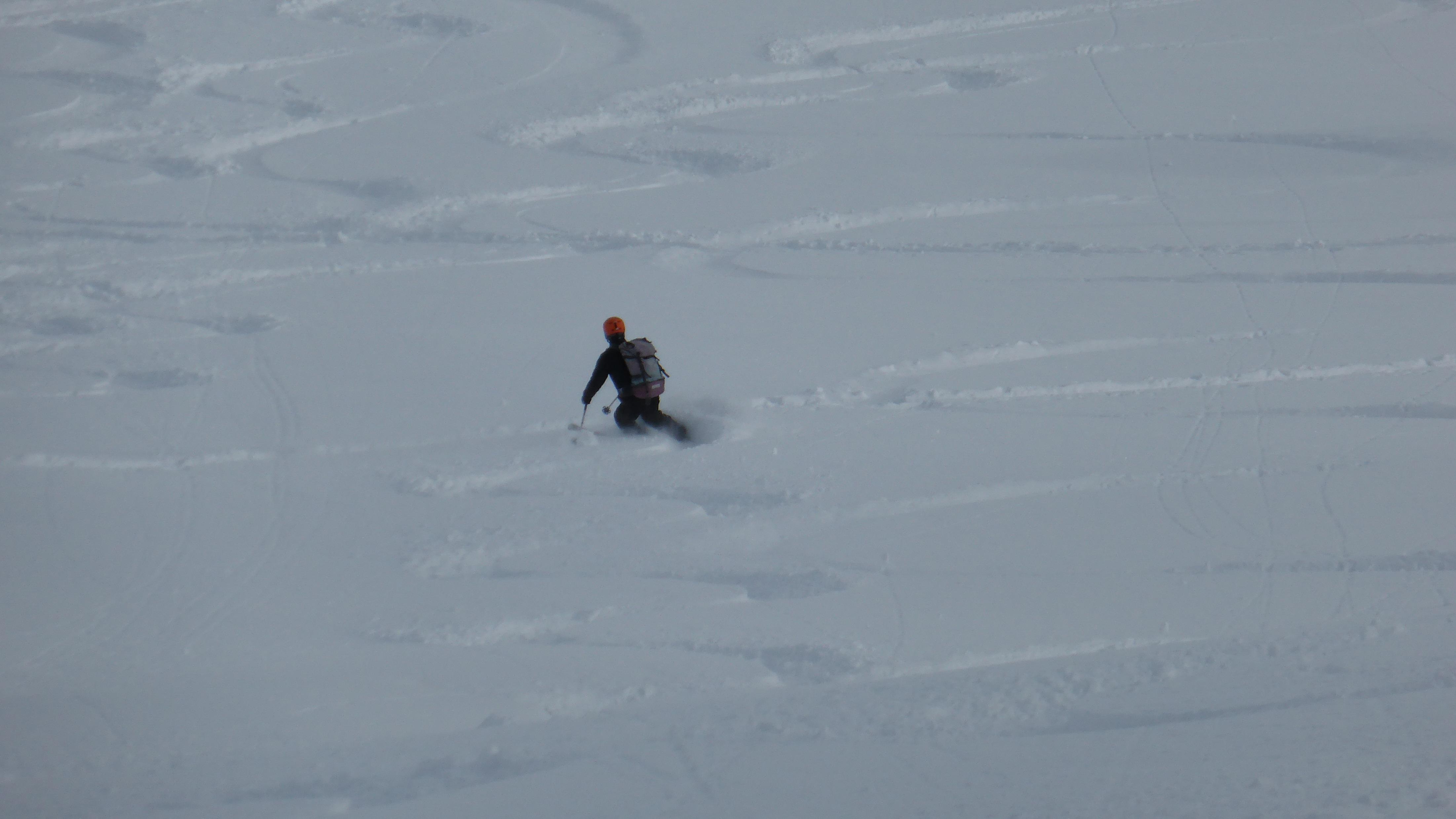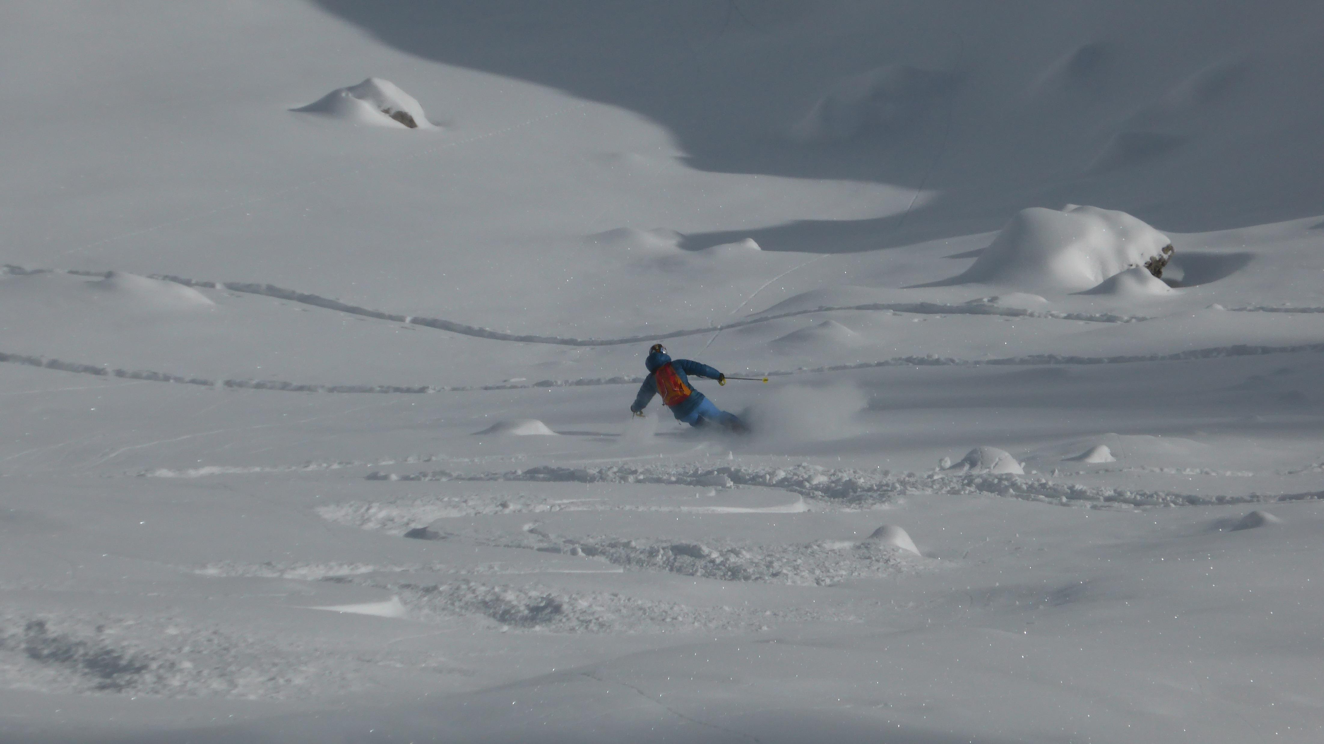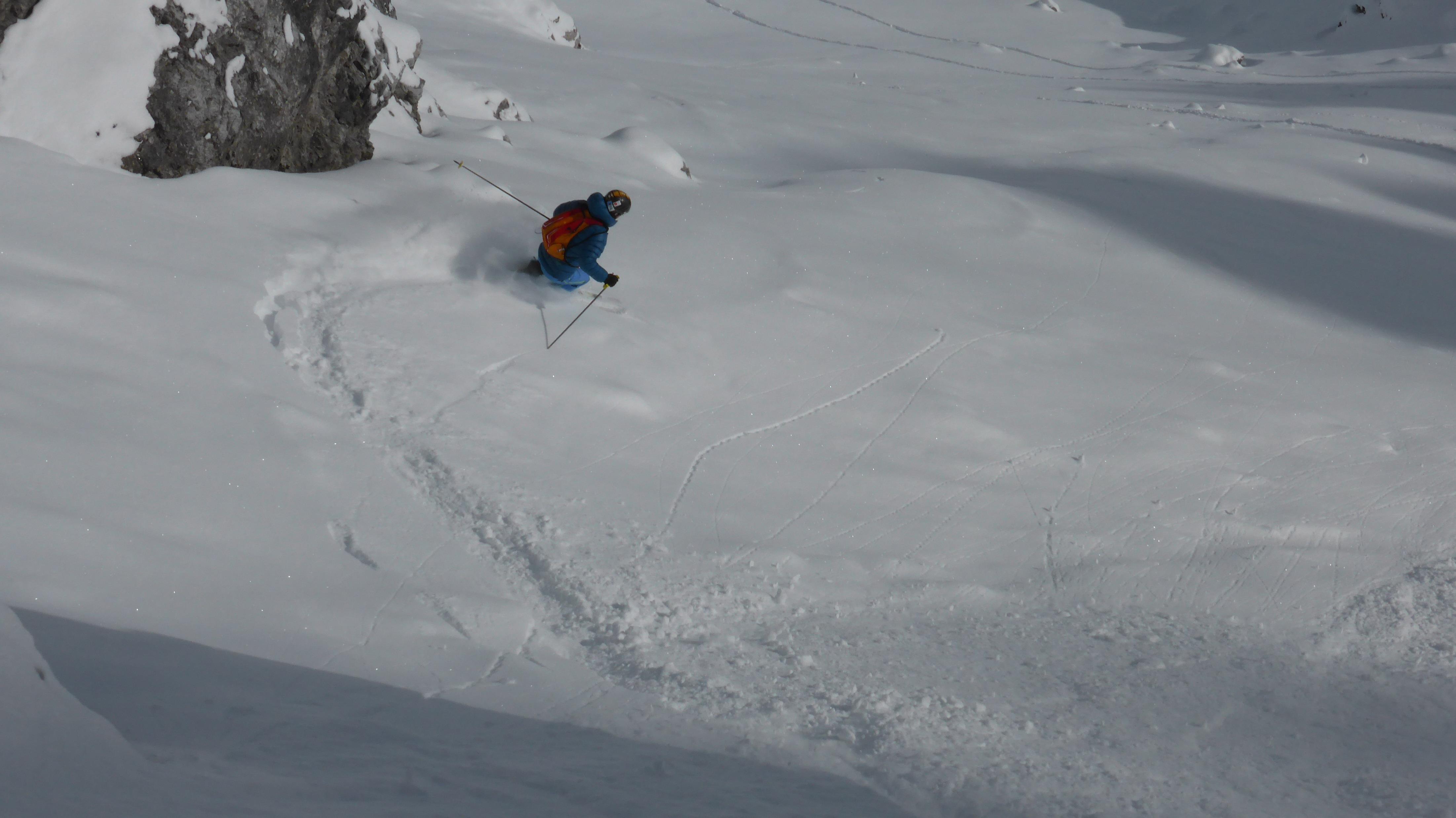 Der gestrige Neuschnee hat die alten Spuren, aber auch die "Minenfelder" verwischt - dementsprechend waren bei etwas Spürsinn perfekte "Powderbedingungen" zu finden, während ein paar Meter daneben die "Sharks" nur so gelauert haben...