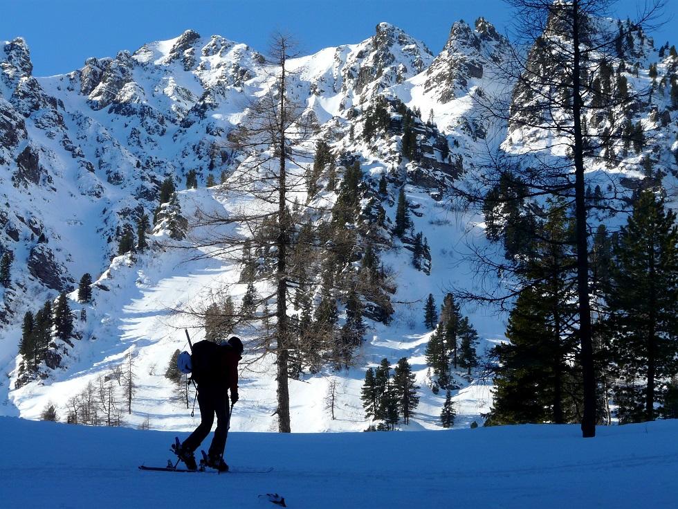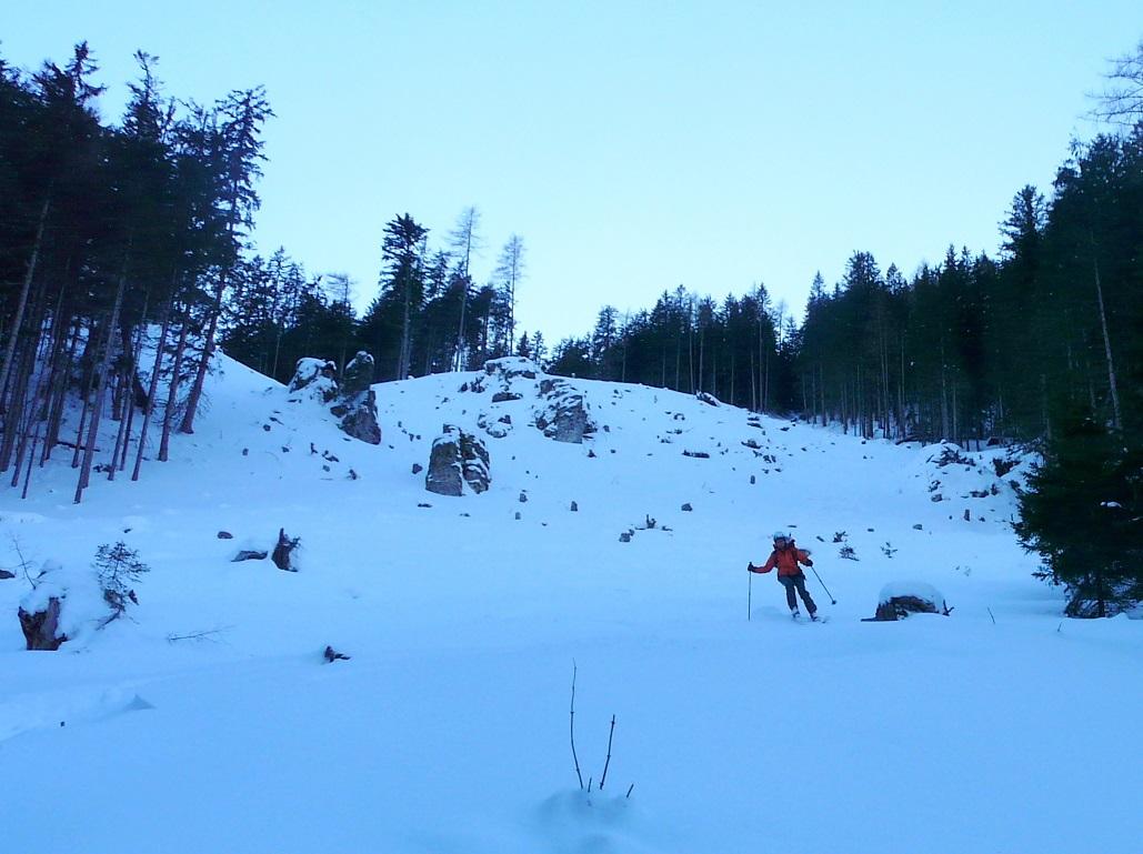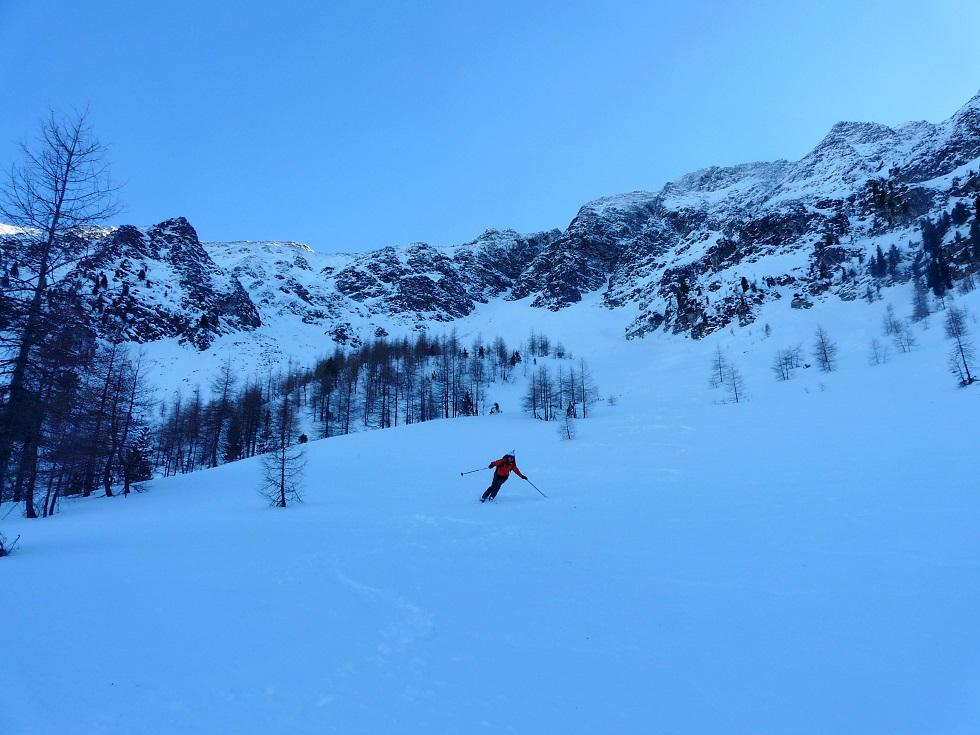 Meine Vorstellung, dass die Rinne und das Eberlkar recht geschützt ist und wir im Traumpulver da hinunterschwingen können erfüllt sich leider nicht. Ab den ersten Bäumen perfekten Pulver, lediglich in der steileren Waldabschnitten heissts aufpassen, da der Schnee, der von den Bäumen abgetaut ist für herrlichen Bruchharsch sorgt. Weit in Talnähe haben wir noch das Vergnügen einen großen Schlag abzufahren, ein Pulvertraum.