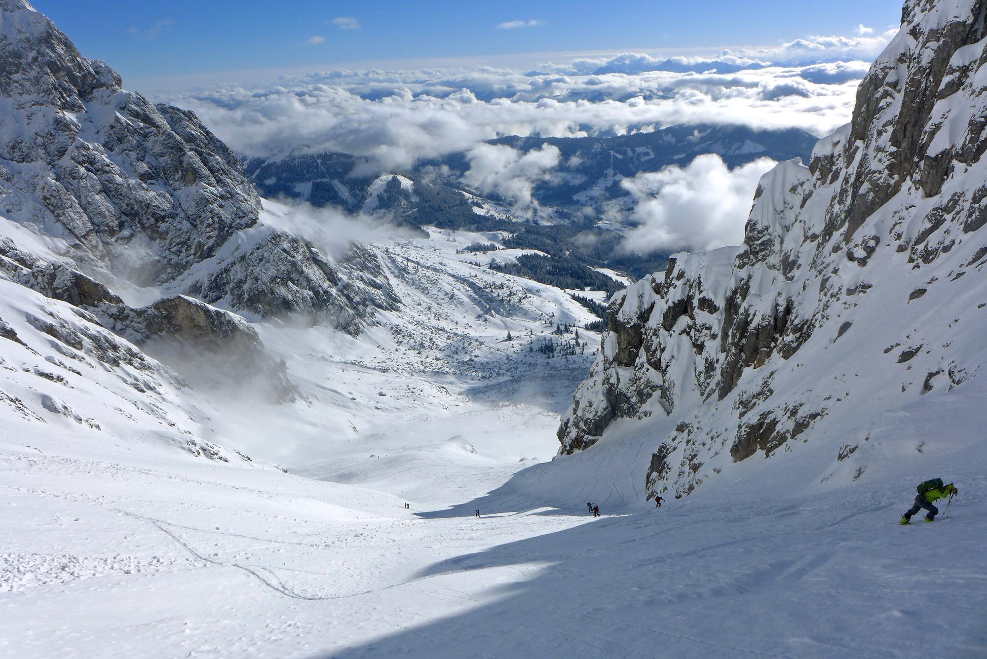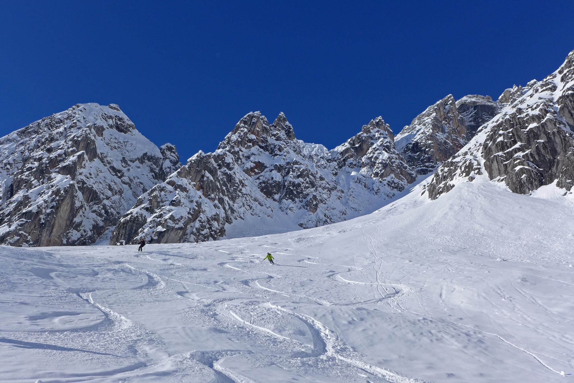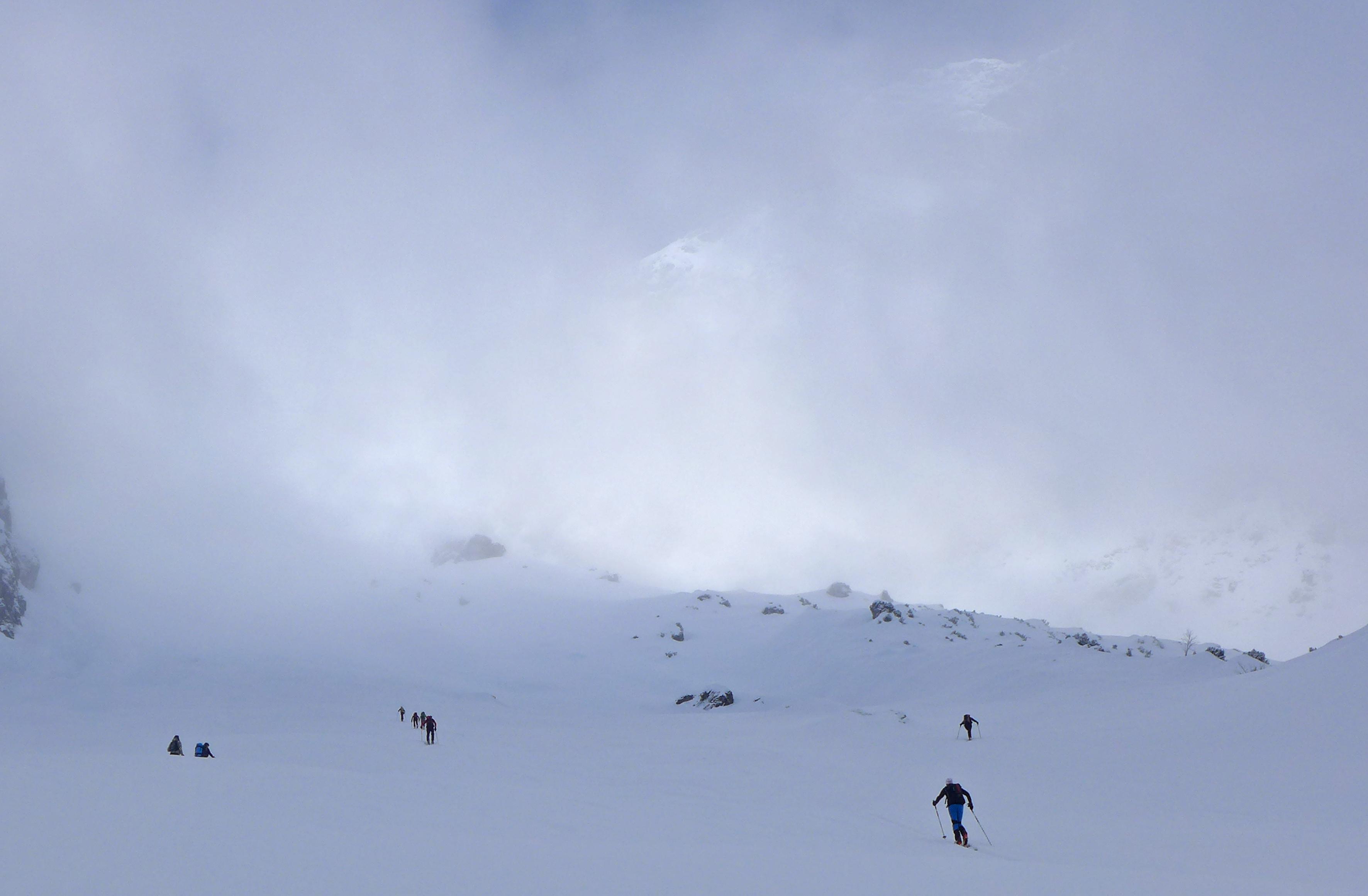 Herrliche Verhältnisse heute im Birgkar, anfangs dichter Nebel, so ab 10.00 Uhr herrlicher Sonnenschein, windstill und ca. 5 cm Pulverschnee vom Vortag auf massiver Unterlage.