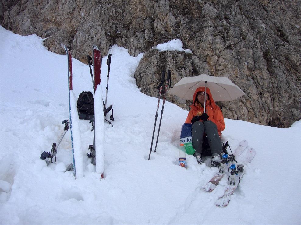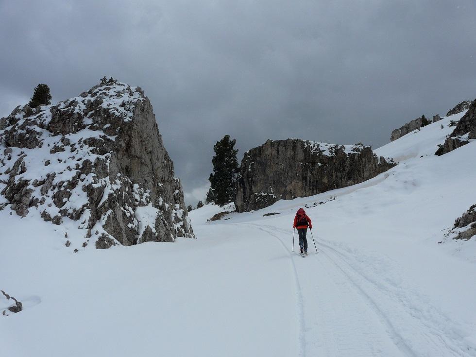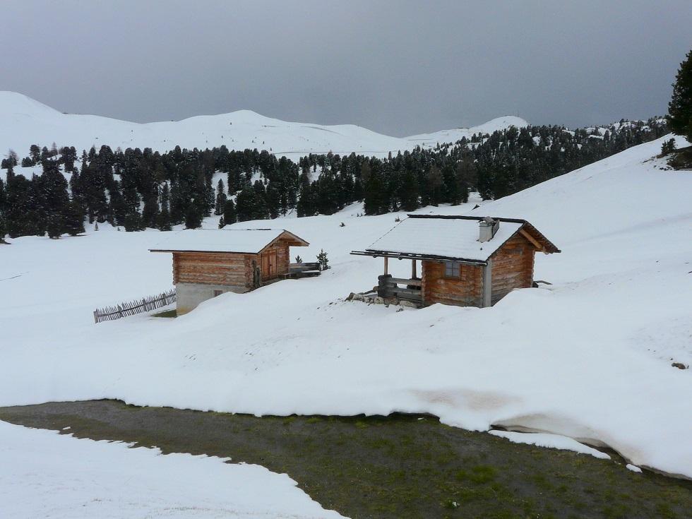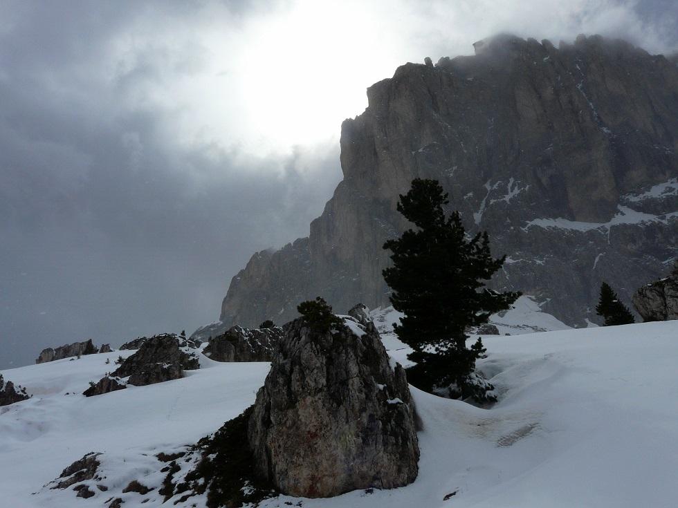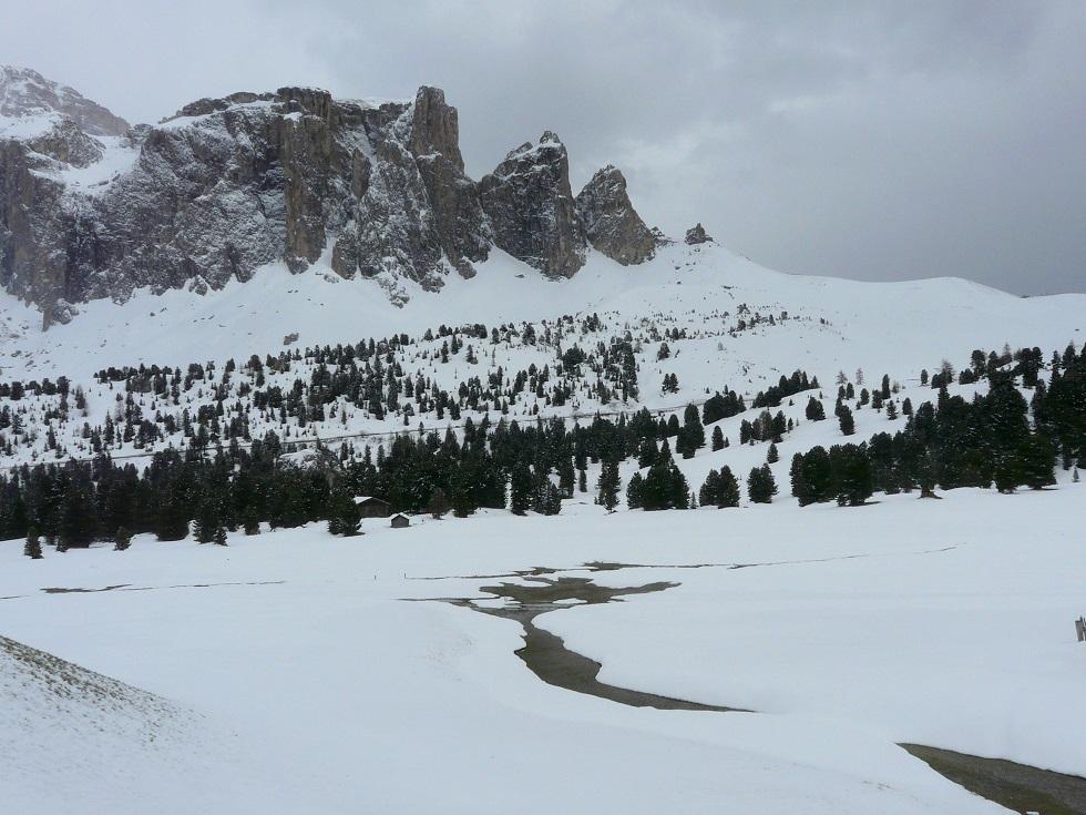 Fahrt ins Grödnertal und Abmarsch bei Plan de Gralba oberhalb von Wolkenstein. Wir sind überrascht wie wenig Schnee auch hier liegt, ohne Pisten ist kaum was zu machen. Über frisch verschneite Blumenwiesen (Krokus, Schlüsselblumen und Anemonen) gehen wir an einigen Hütten und einer Liftstation vorbei Richtung Sellajoch bzw. aufwärts zur Langkofelscharte. Abbruch (siehe Foto).