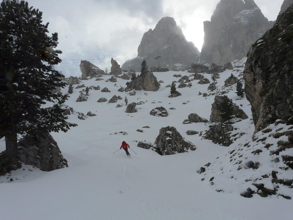 Abfahrt Slalom in felsdurchsetztem Gelände, retour über Pisten und kurzem Gegenanstieg bei Rif. Piz Seteur nach Plan de Gralba.