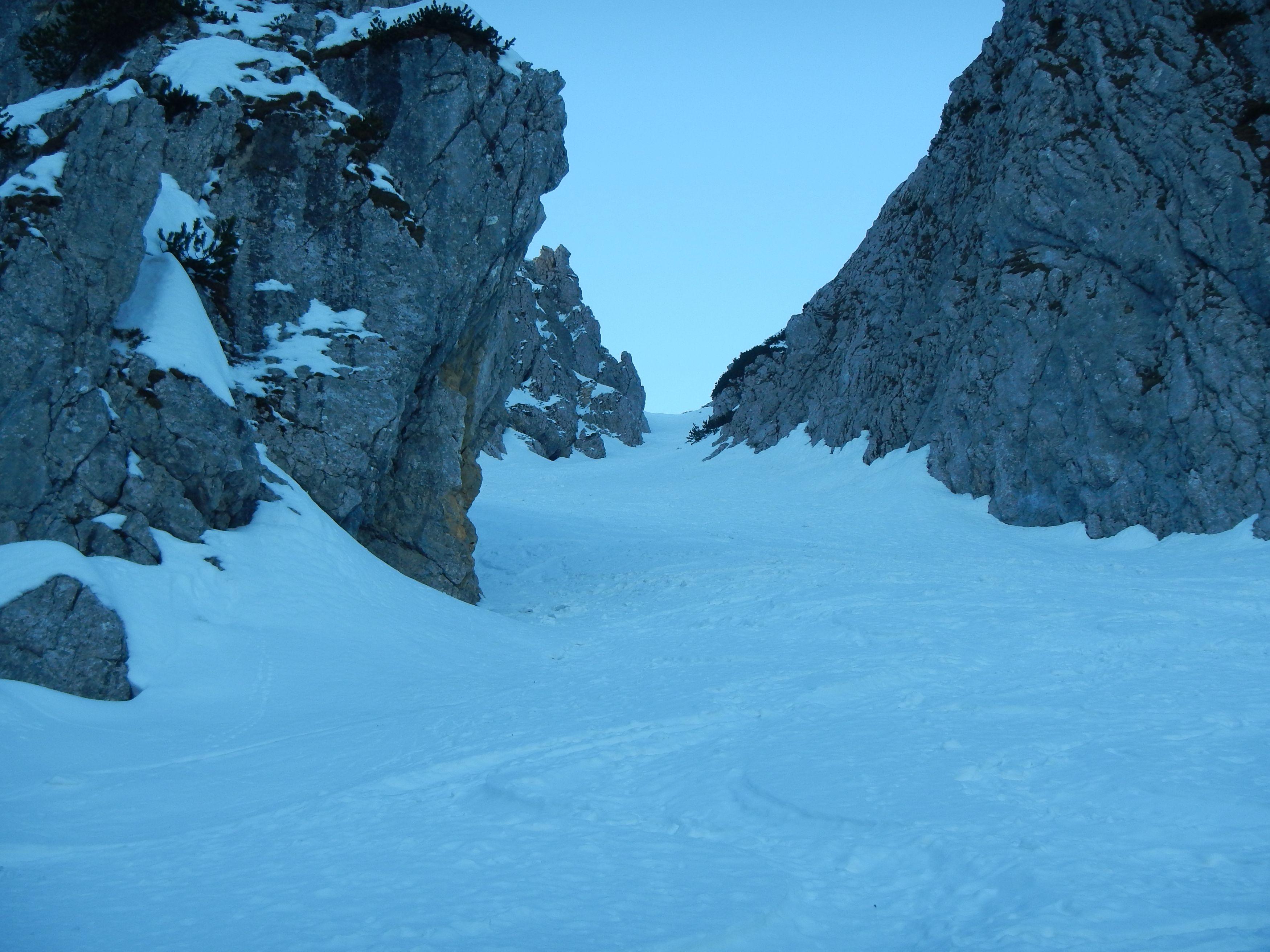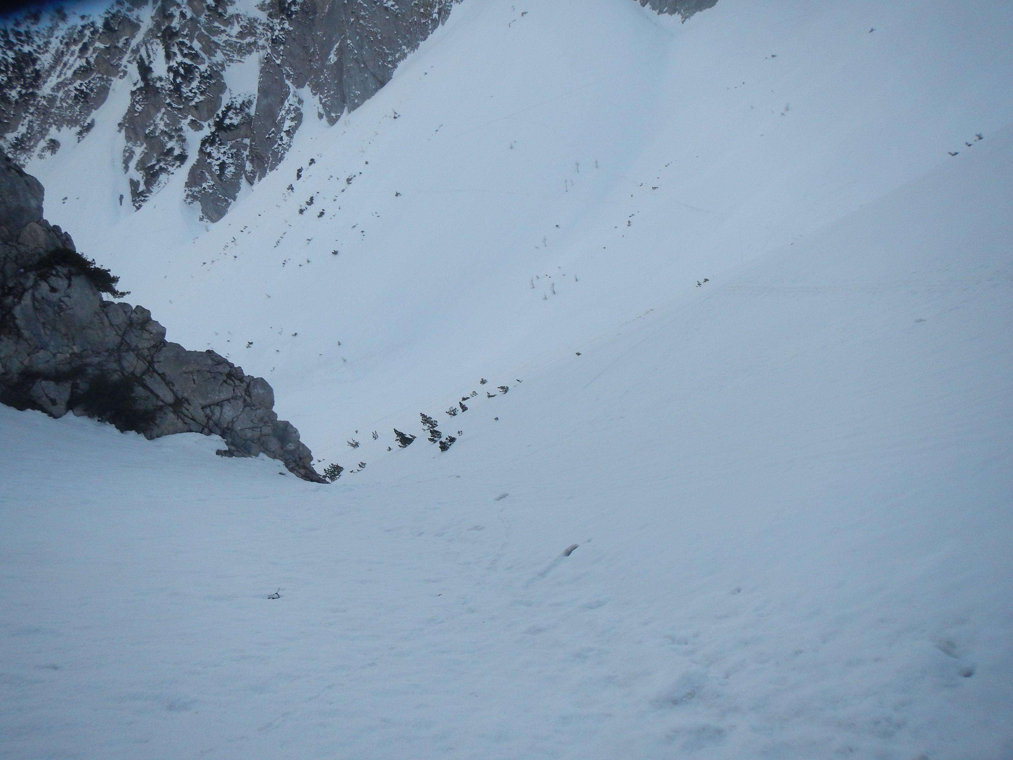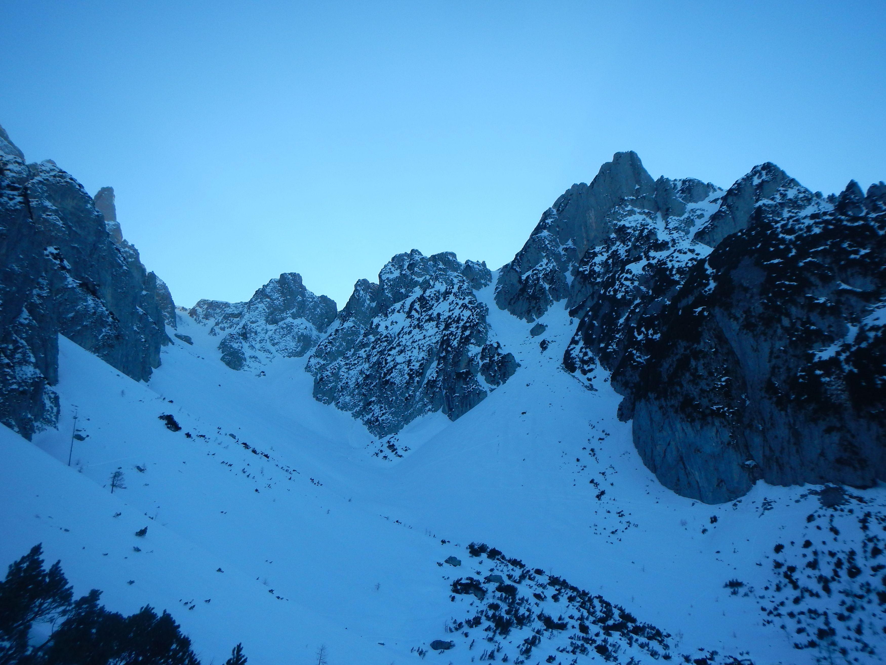 Verhältnisse: Beim Aufstieg waren die Schneeverhältnisse noch tief. Sobald aber die Sonne weg ist wird es harschig und hart. Harscheisen können beim Gosaukamm immer von Vorteil sein.