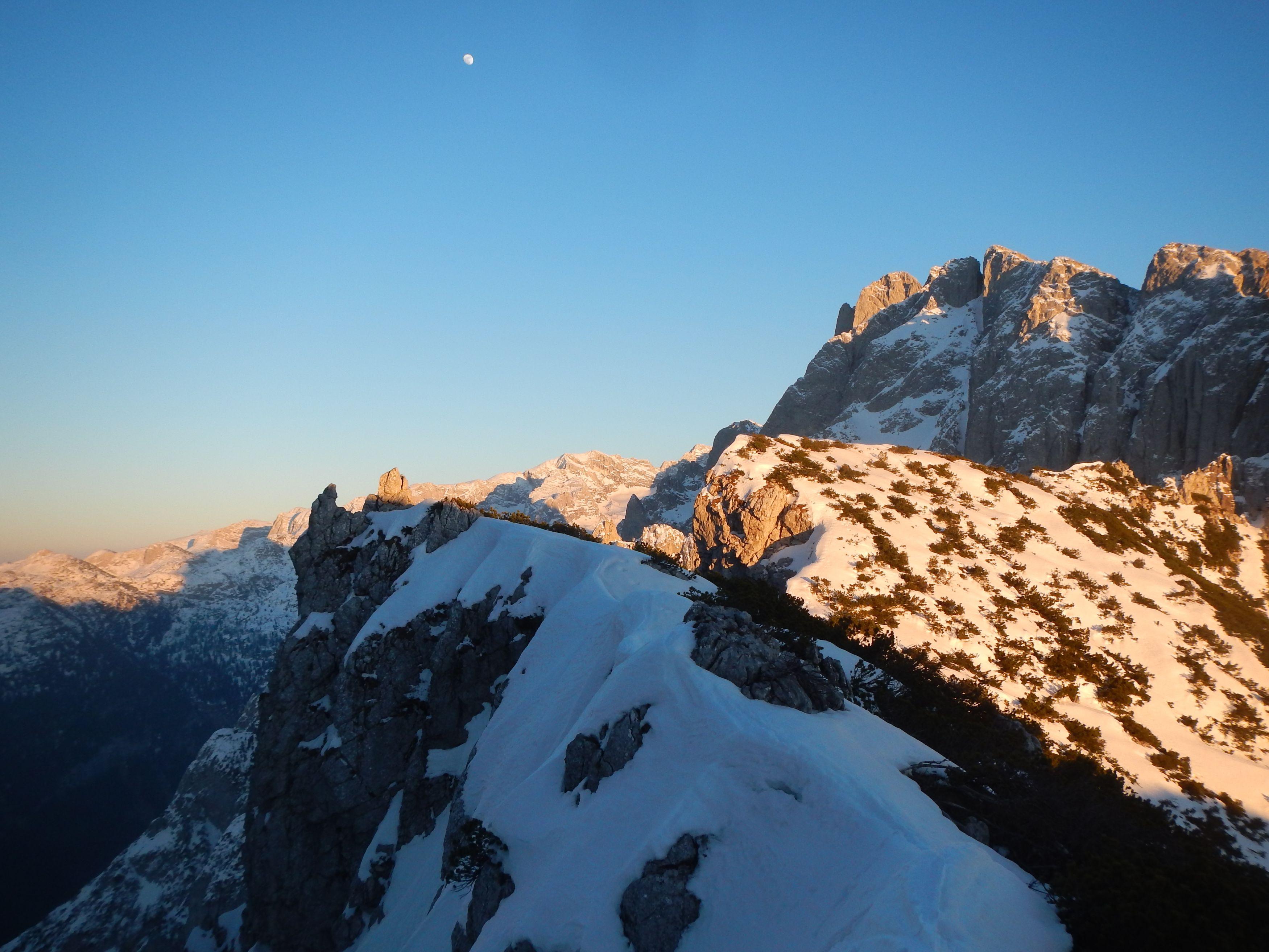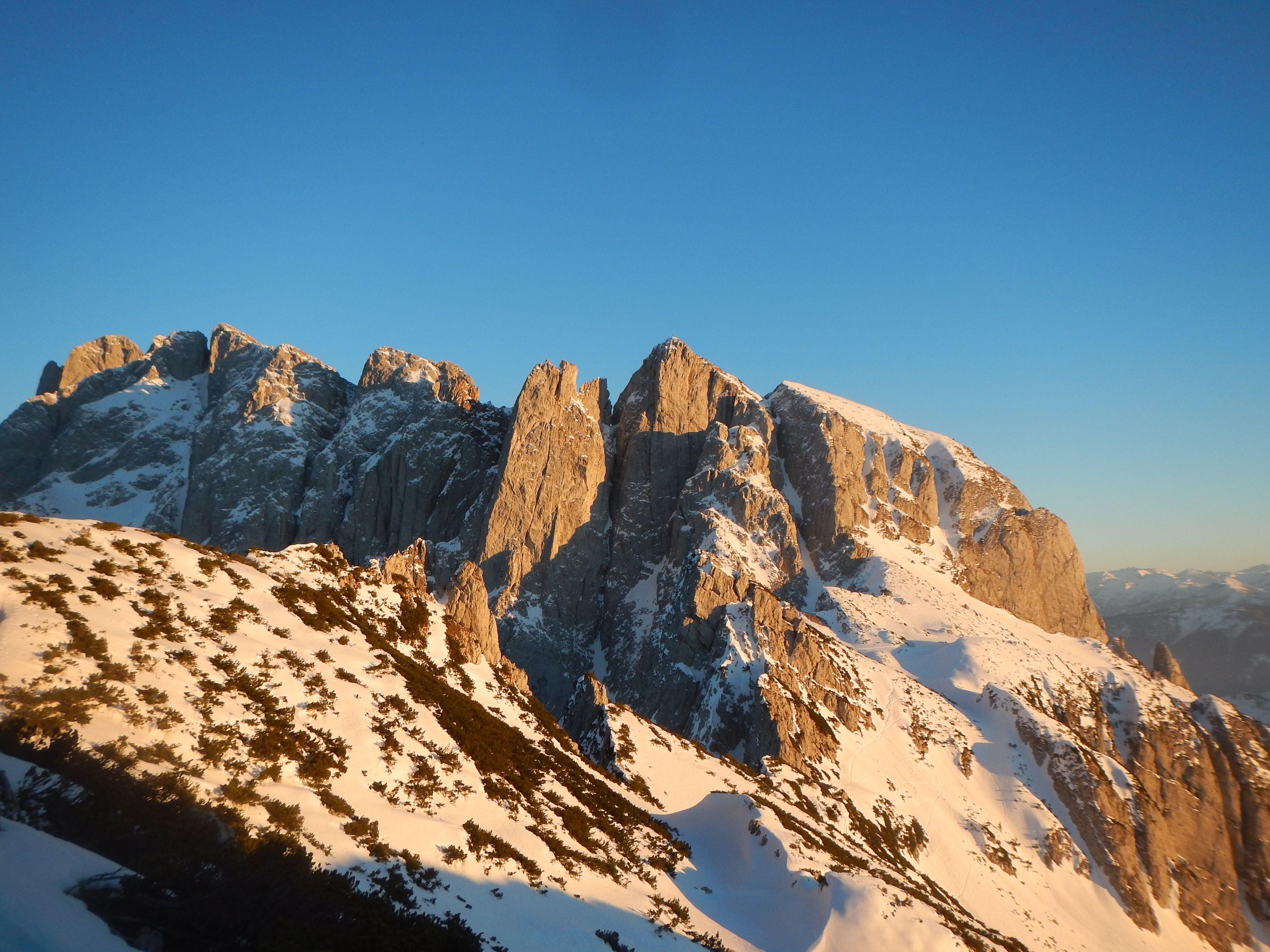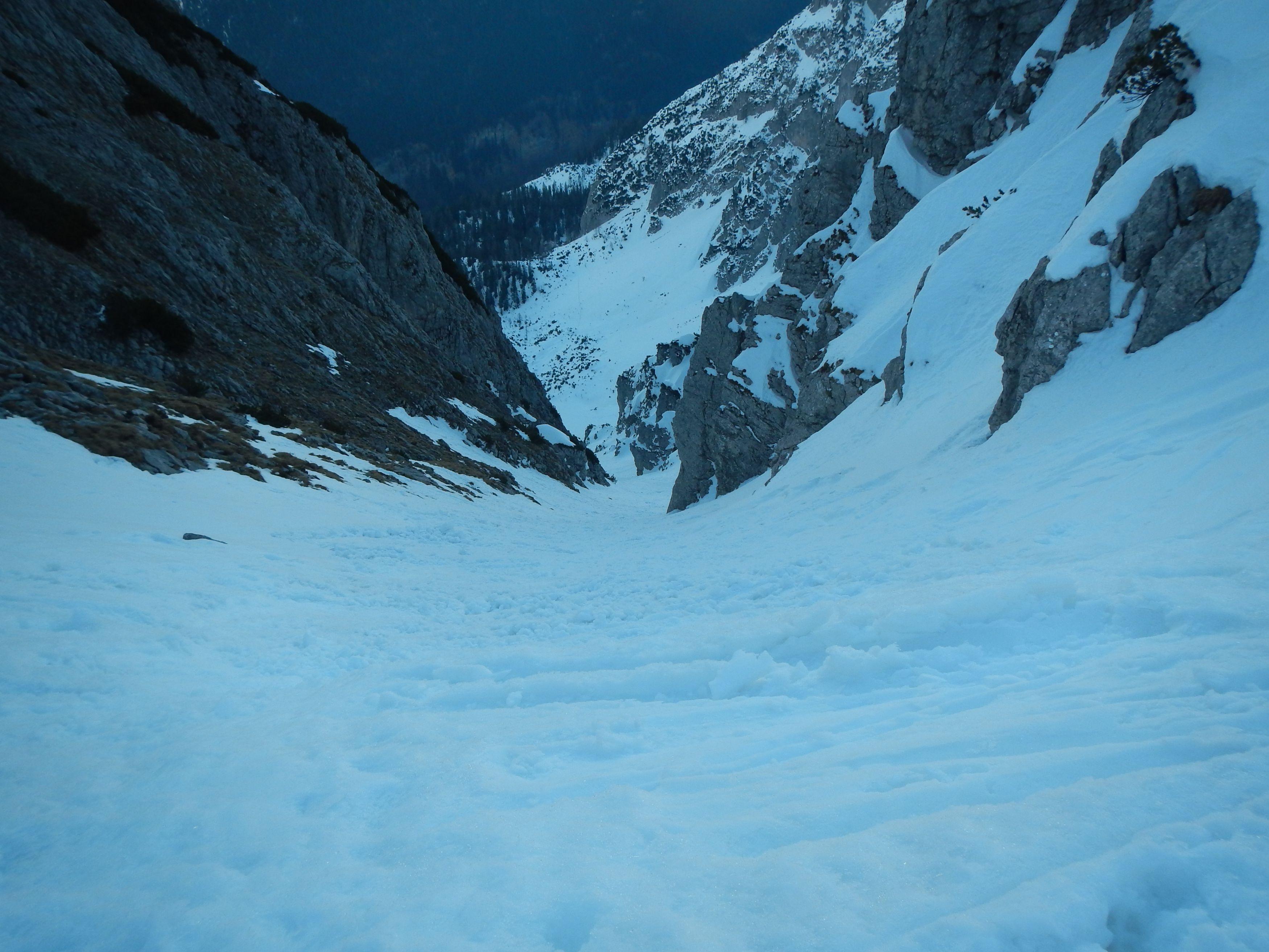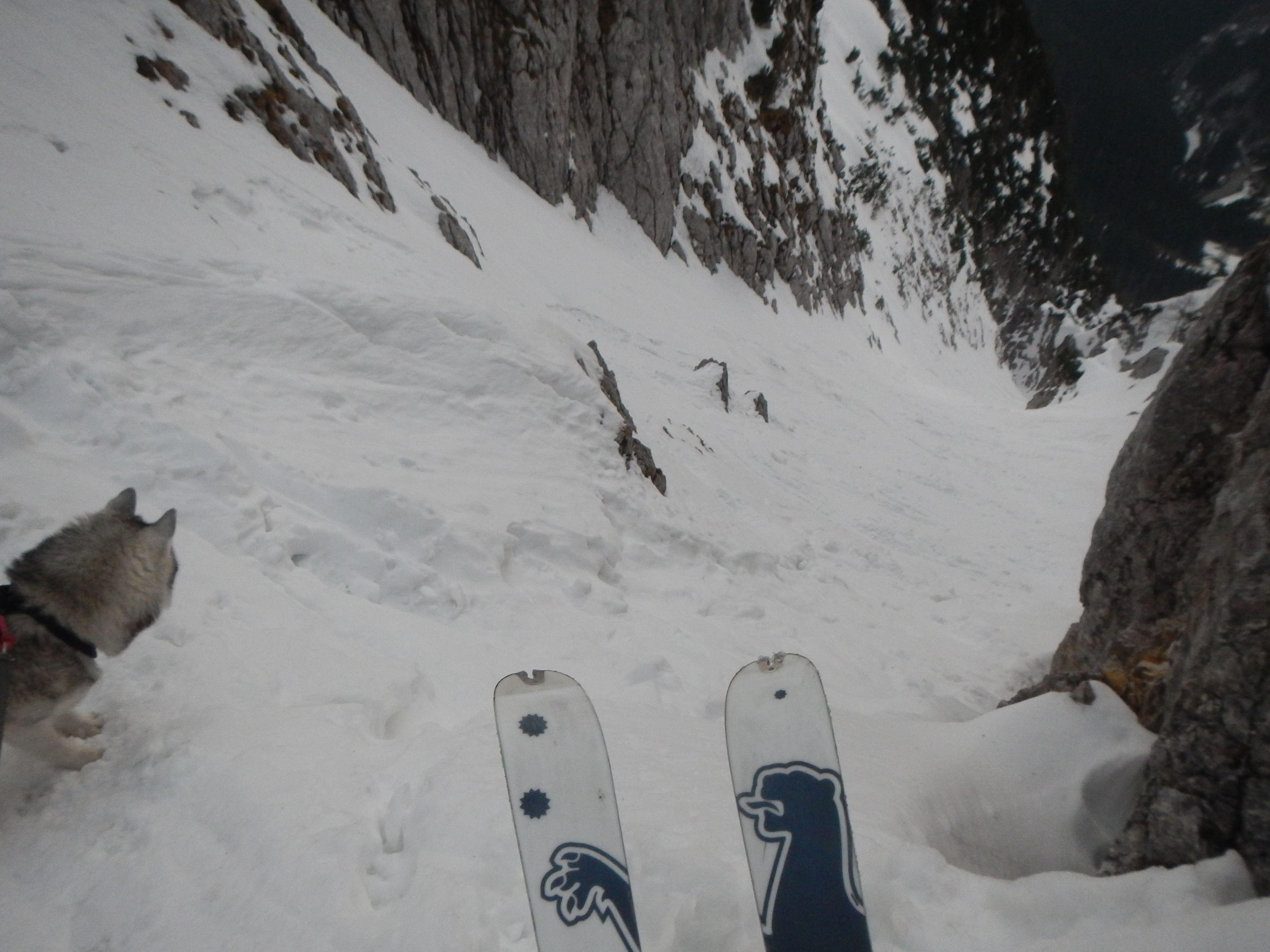 Verhältnisse: Beim Aufstieg waren die Schneeverhältnisse noch tief. Sobald aber die Sonne weg ist wird es harschig und hart. Harscheisen können beim Gosaukamm immer von Vorteil sein.