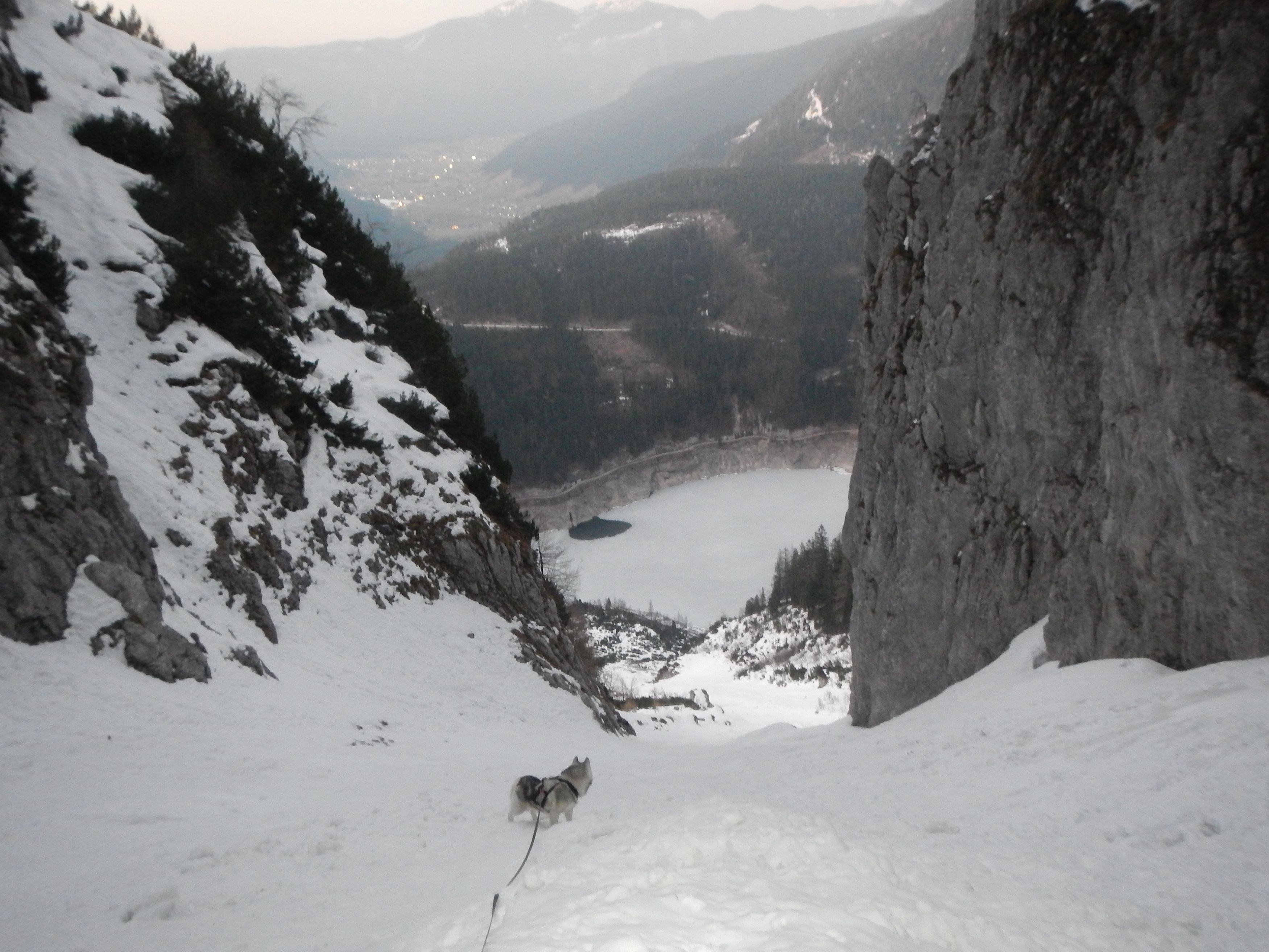 Freitag Nachmittag Start beim Voderen Gosausee Richtung Weitkar. Ziel war die Strichkogelrinne und anschließend die Abfahrt zum Gosausee über die Scharlingrinne. Die Abfahrt ist noch fast bis zum See machbar.