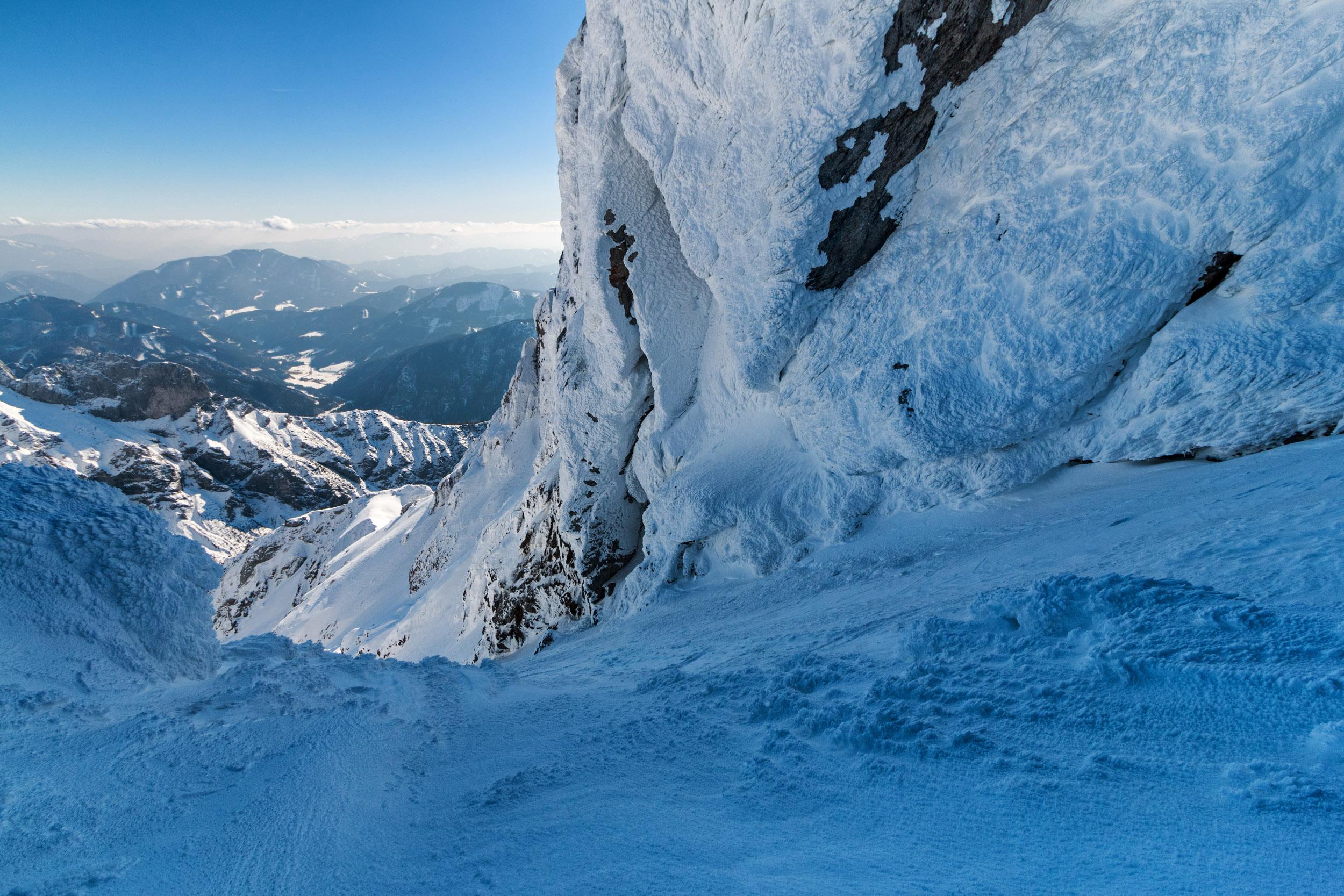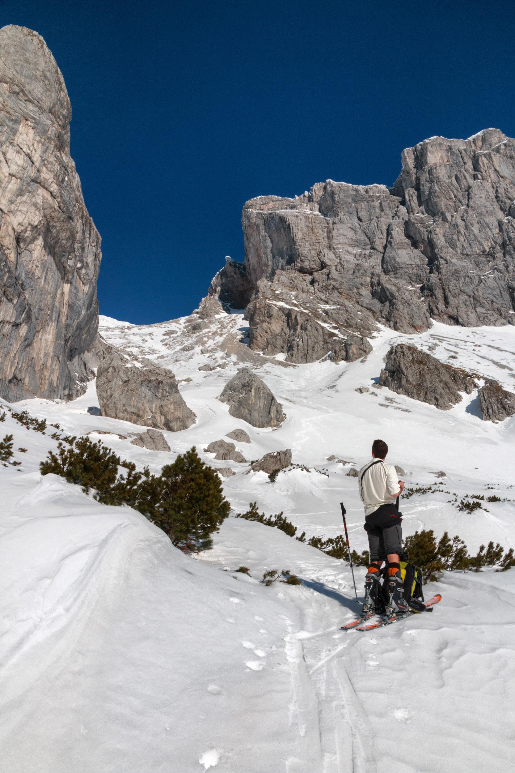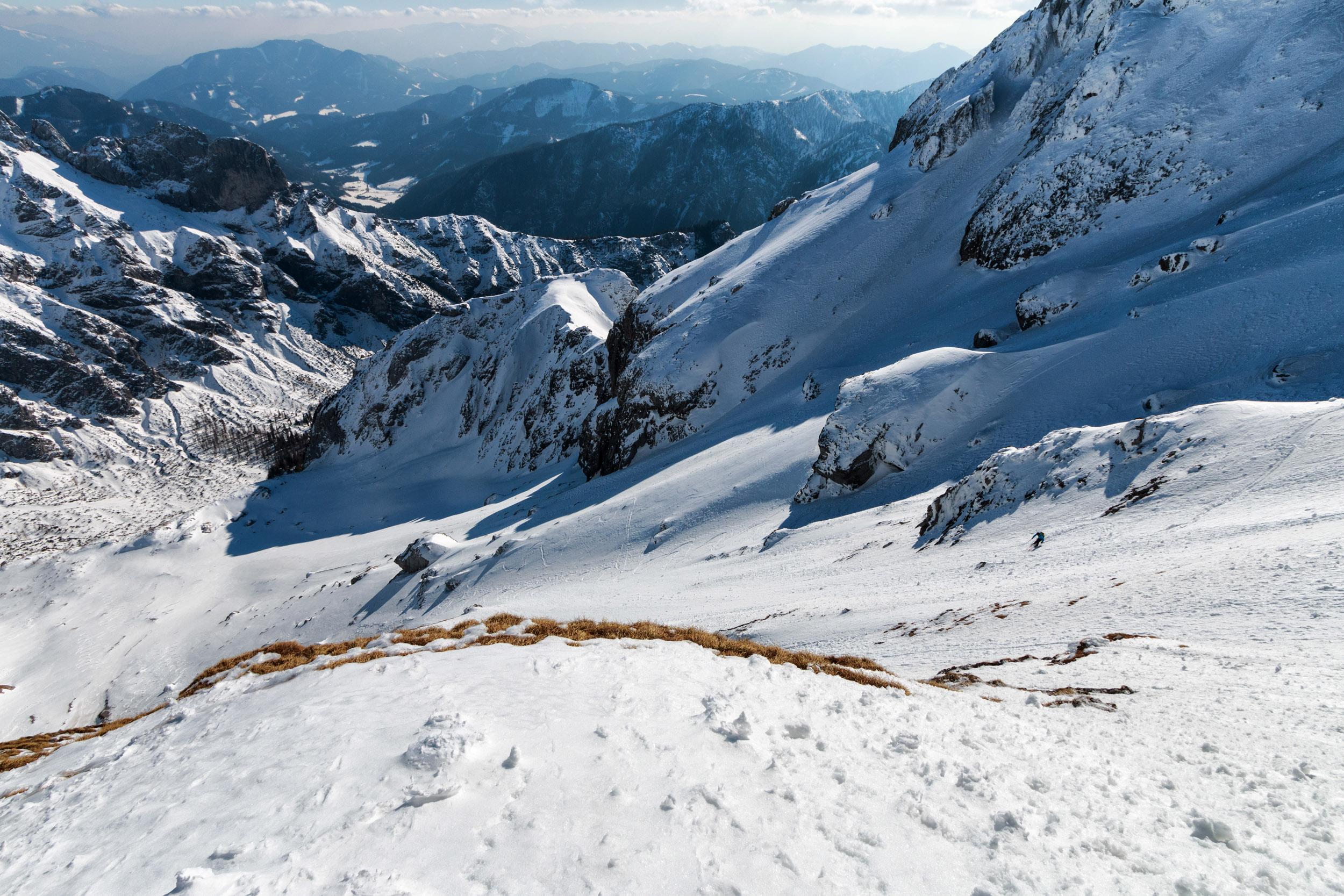 Vom GH Bodenbauer auf den Zagelkogel 2255 m. Hinauf gings durchs Rauchkar, im unteren Teil sehr mühsam weil extrem wenig Schnee, umgestürzte Bäume, Felsen, mehrmals abschnallen, etc. Dann Schnee vor allem nahe der Beilsteinwand, aber da sind von oben die Steine runtergepfiffen. Dann noch eine Nebelbank, danach aber alles wieder perfekt: Sonne, Fernsicht bis zum Dachstein, kaum Wind. Und, Überraschung: Im Zagelkar deutlich mehr Schnee als im Rauchkar, super zu fahren! Wir haben dann nicht die normale Einfahrt gewählt sondern eine Rinne weiter östlich, weil dort wars aufgefirnt statt eisig. Nur muss man rechtzeitig rausqueren, sonst Felswand.