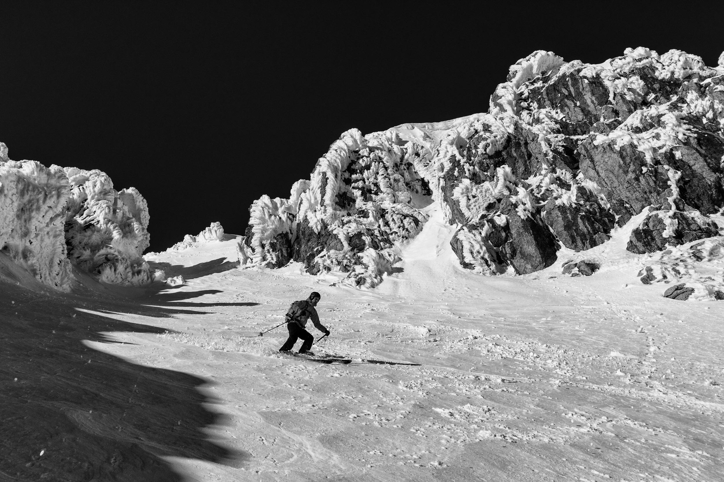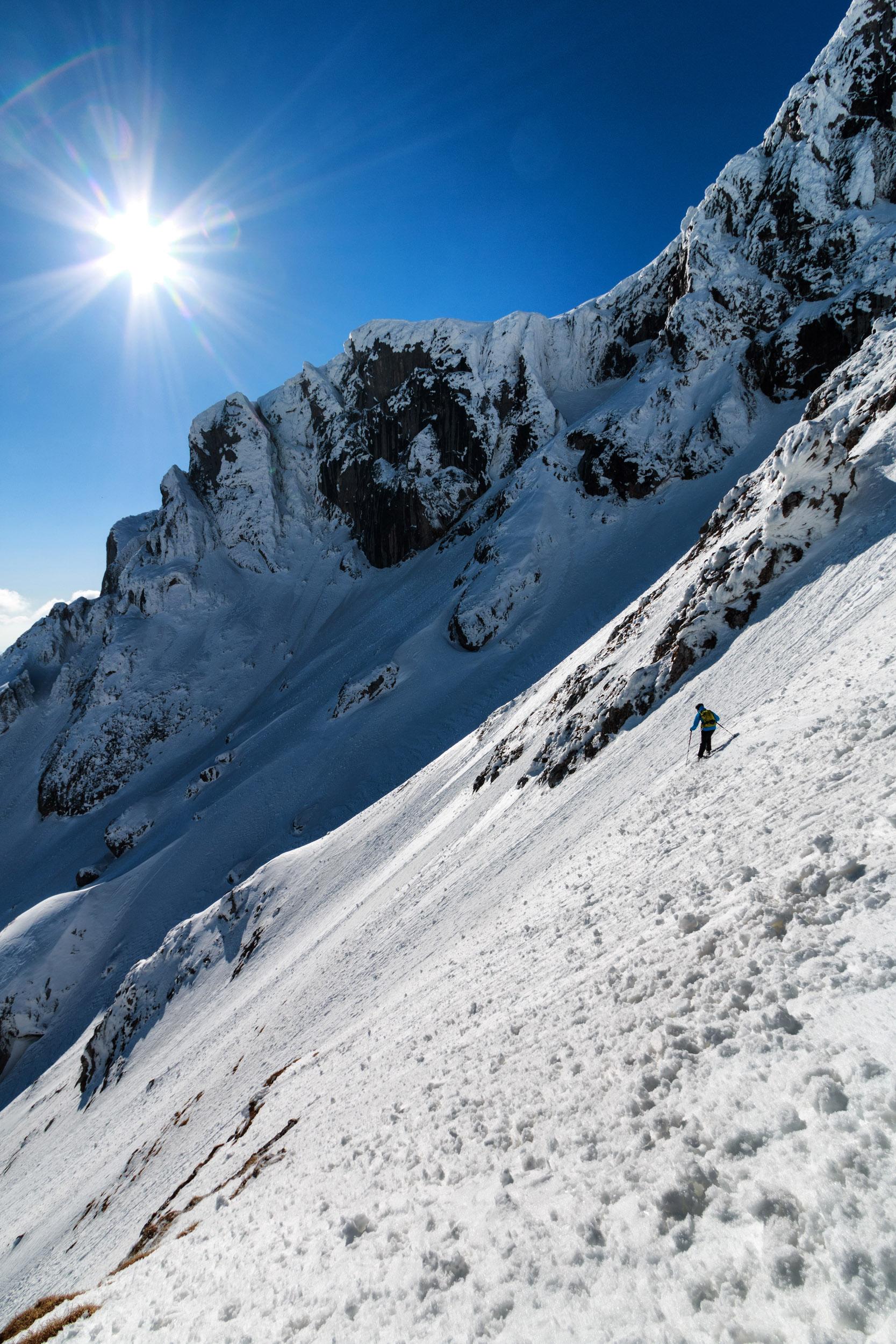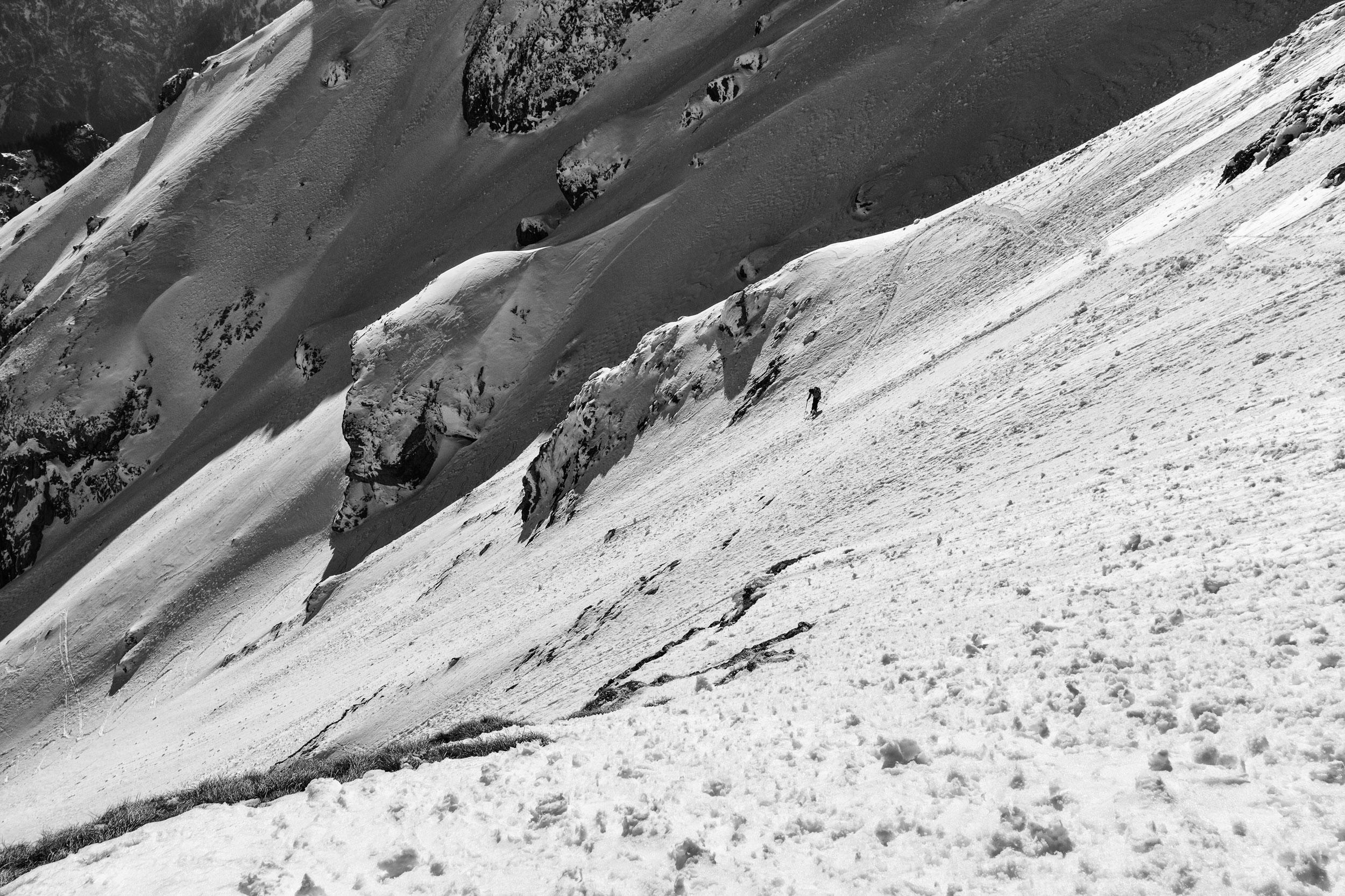 Vom GH Bodenbauer auf den Zagelkogel 2255 m. Hinauf gings durchs Rauchkar, im unteren Teil sehr mühsam weil extrem wenig Schnee, umgestürzte Bäume, Felsen, mehrmals abschnallen, etc. Dann Schnee vor allem nahe der Beilsteinwand, aber da sind von oben die Steine runtergepfiffen. Dann noch eine Nebelbank, danach aber alles wieder perfekt: Sonne, Fernsicht bis zum Dachstein, kaum Wind. Und, Überraschung: Im Zagelkar deutlich mehr Schnee als im Rauchkar, super zu fahren! Wir haben dann nicht die normale Einfahrt gewählt sondern eine Rinne weiter östlich, weil dort wars aufgefirnt statt eisig. Nur muss man rechtzeitig rausqueren, sonst Felswand.