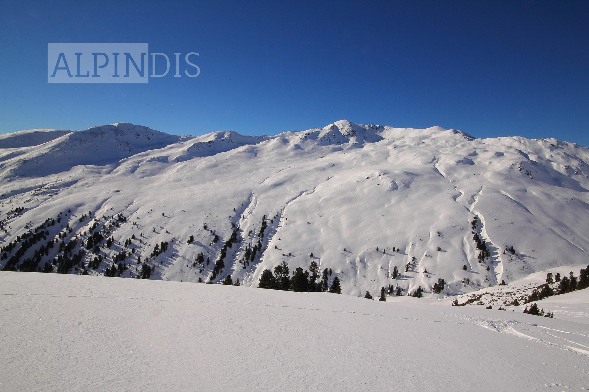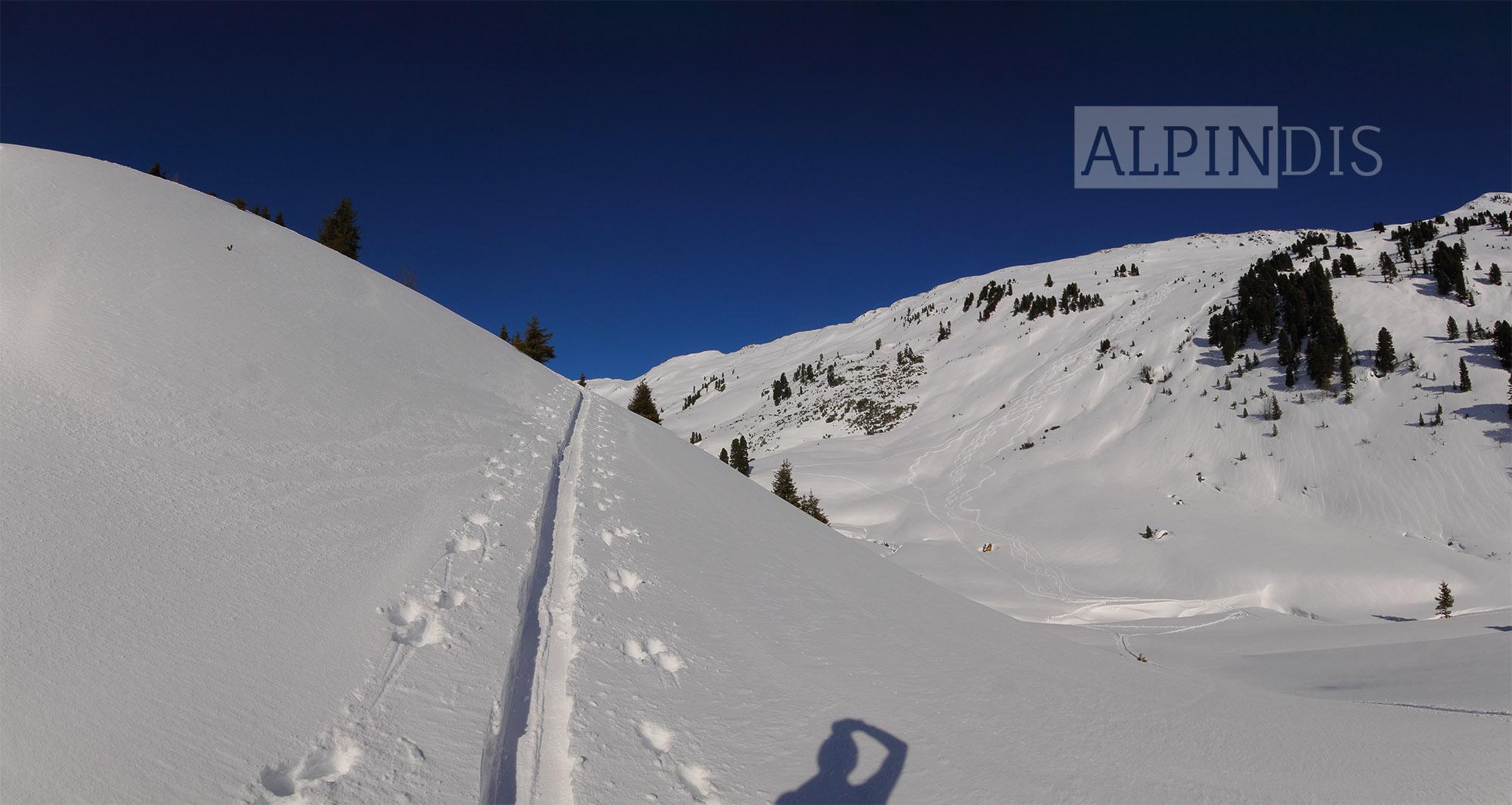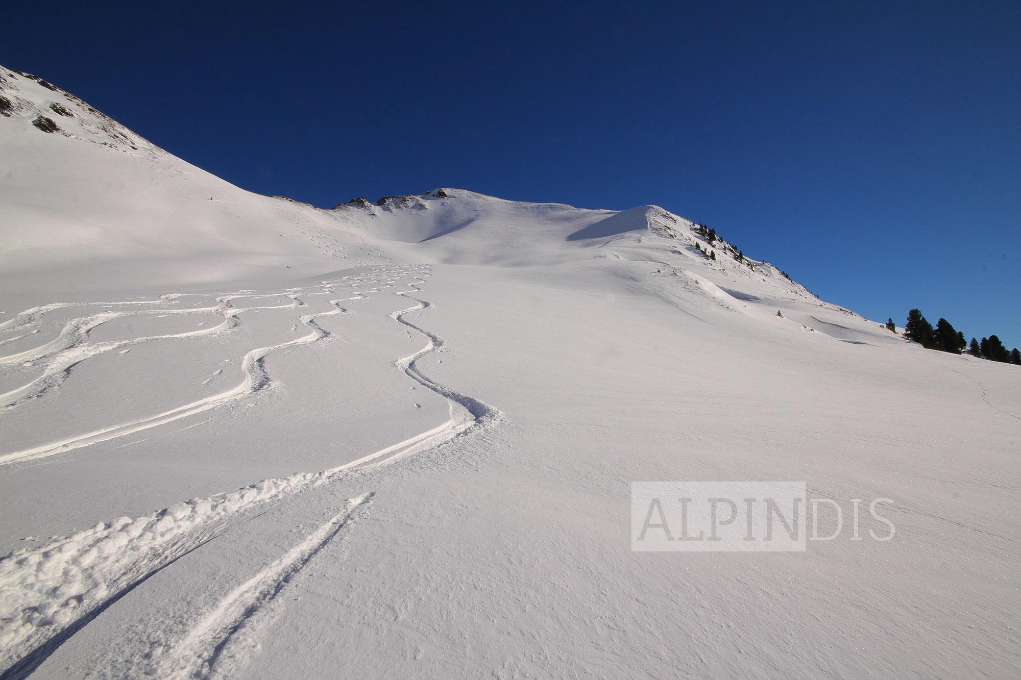 Schnee: Oberflächlich 10cm lockerer Pulverschnee, darunter in windgeschützten Bereichen noch lockerer Schnee, windexponiert Triebschnee. Unterhalb 1800m war unterm Pulver ein dünner Schmelzharschdeckel spürbar. An Südhängen wurde der Schnee schon etwas angefeuchtet, wird wahrscheinlich morgen in der Früh Bruchharsch werden (wenn es abkühlt). Der Pulverschnee von gestern auf heute wurde im Kammbereich vom West- bzw. Südwestwind bereits verweht und bildet kleinräumige Triebschneepakete im Nord bis Ostsektor.