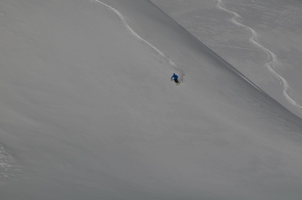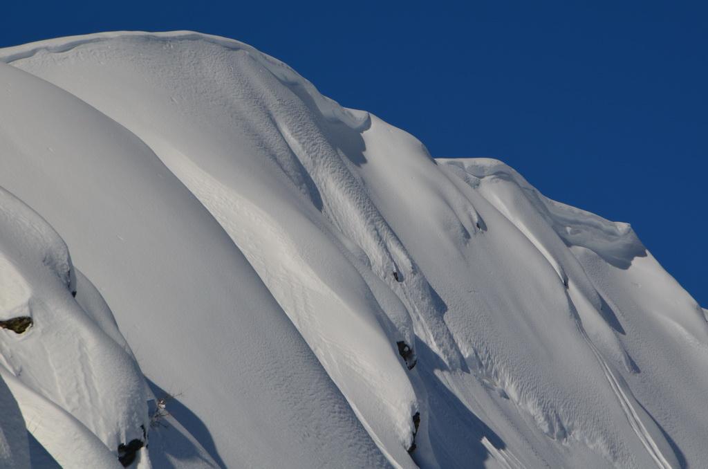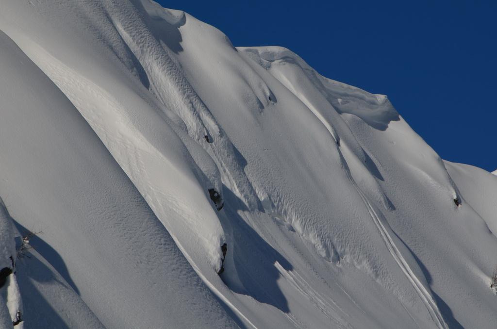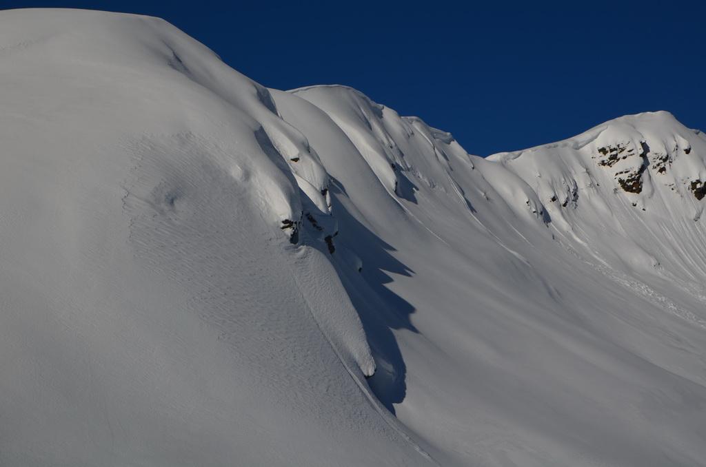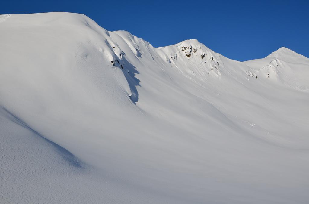 Auch heute haben wir wieder Lifthilfe in Anspruch genommen und eine perfekte Abfahrt vor Arbeitsbeginn genießen können. In Kammnähe konnte man die Windzeichen schon deutlich erkennen, allerdings hat sich die Schneedecke auch schon relativ gut gesetzt und gefestigt. In extrem steilen bzw. bekannt gefährdeten Bereichen waren auch einige alte Schneebretter bzw. weiter unten eine wirklich rießige Nasschneelawine ausmachbar. Aufgrund des letzten Neuschnees waren diese aber fürs Foto nicht wirklich erkennbar.