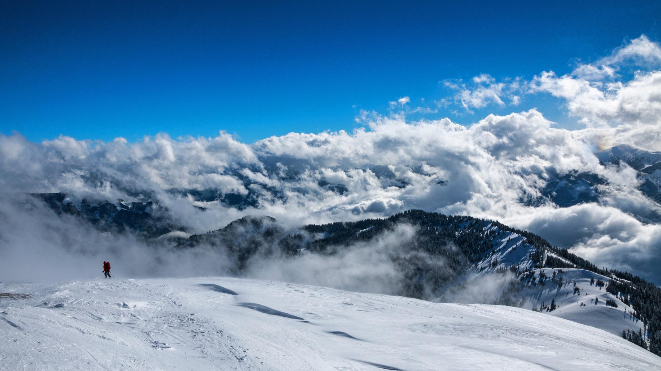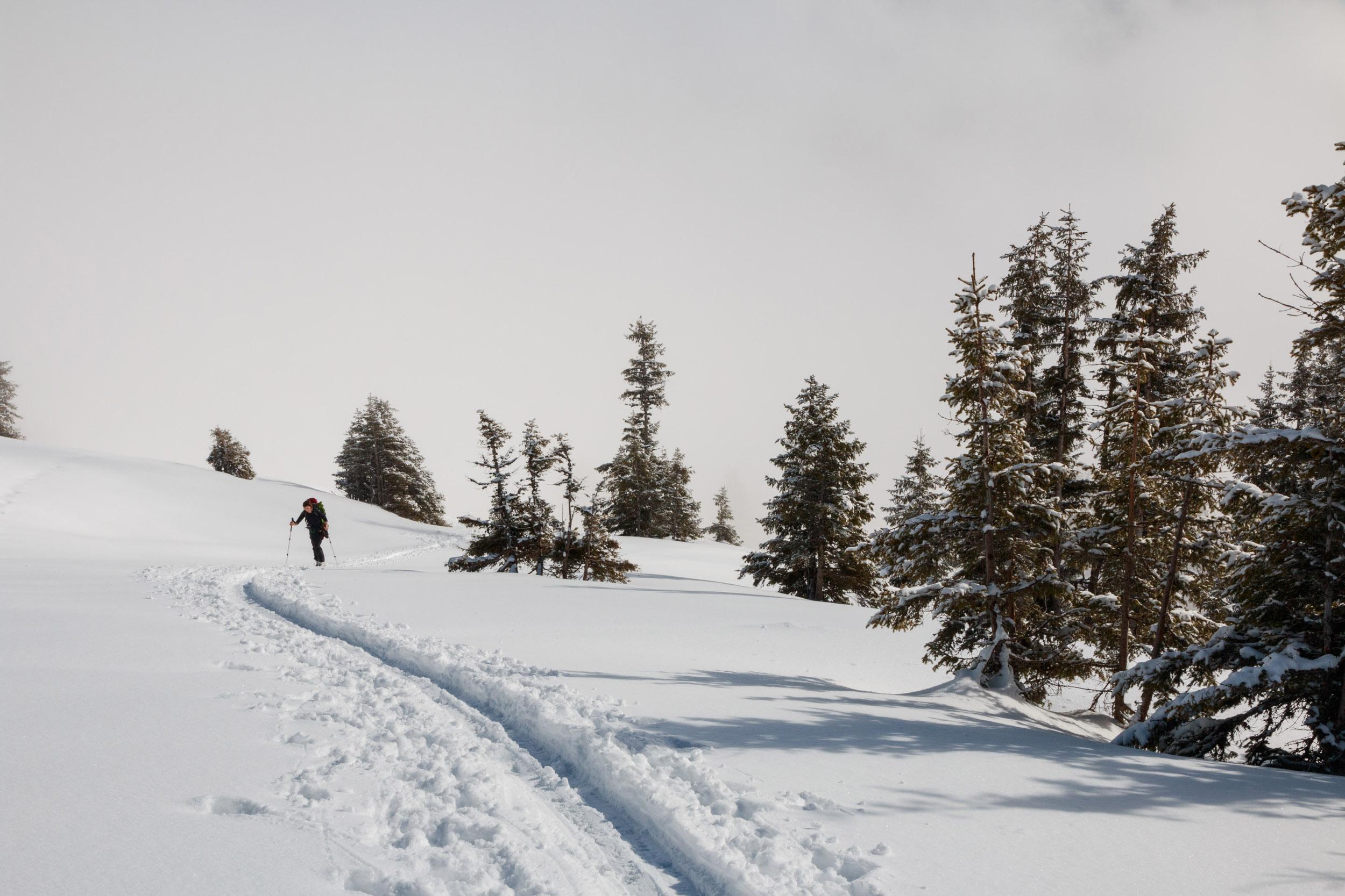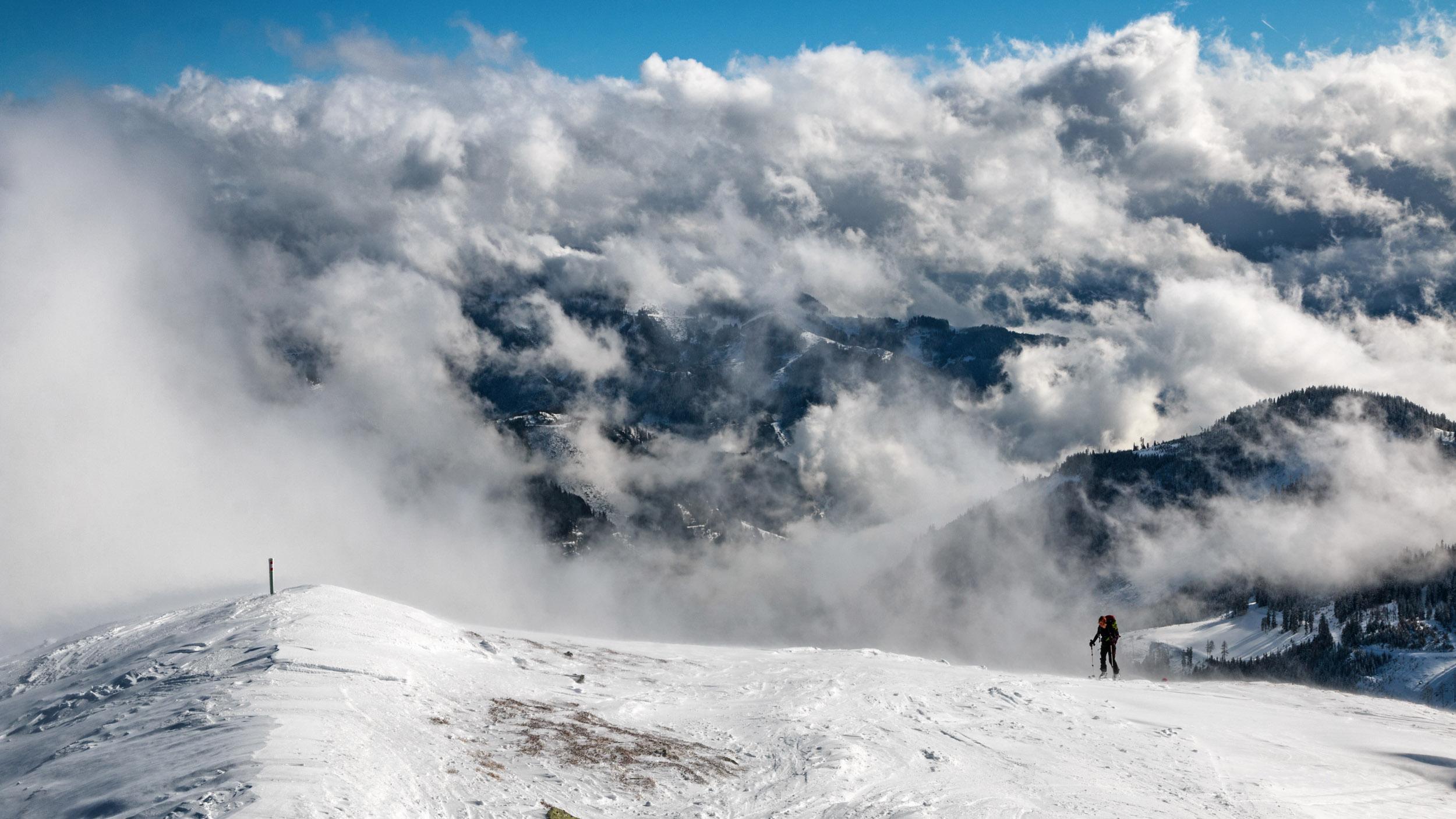 Ca. 10-15 cm frischer Pulverschnee auf kompakter Altschneedecke machten die Tour erstaunlich lohnend. Das Wetter hat auch mitgespielt, die sich rasend schnell verformenden Wolkenfetzen überm Schoberpass haben für gelegentlich durchziehende Nebelschwaden entschädigt. Weil so schön war, sind wir den Gipfelhang gleich nochmal rauf.
