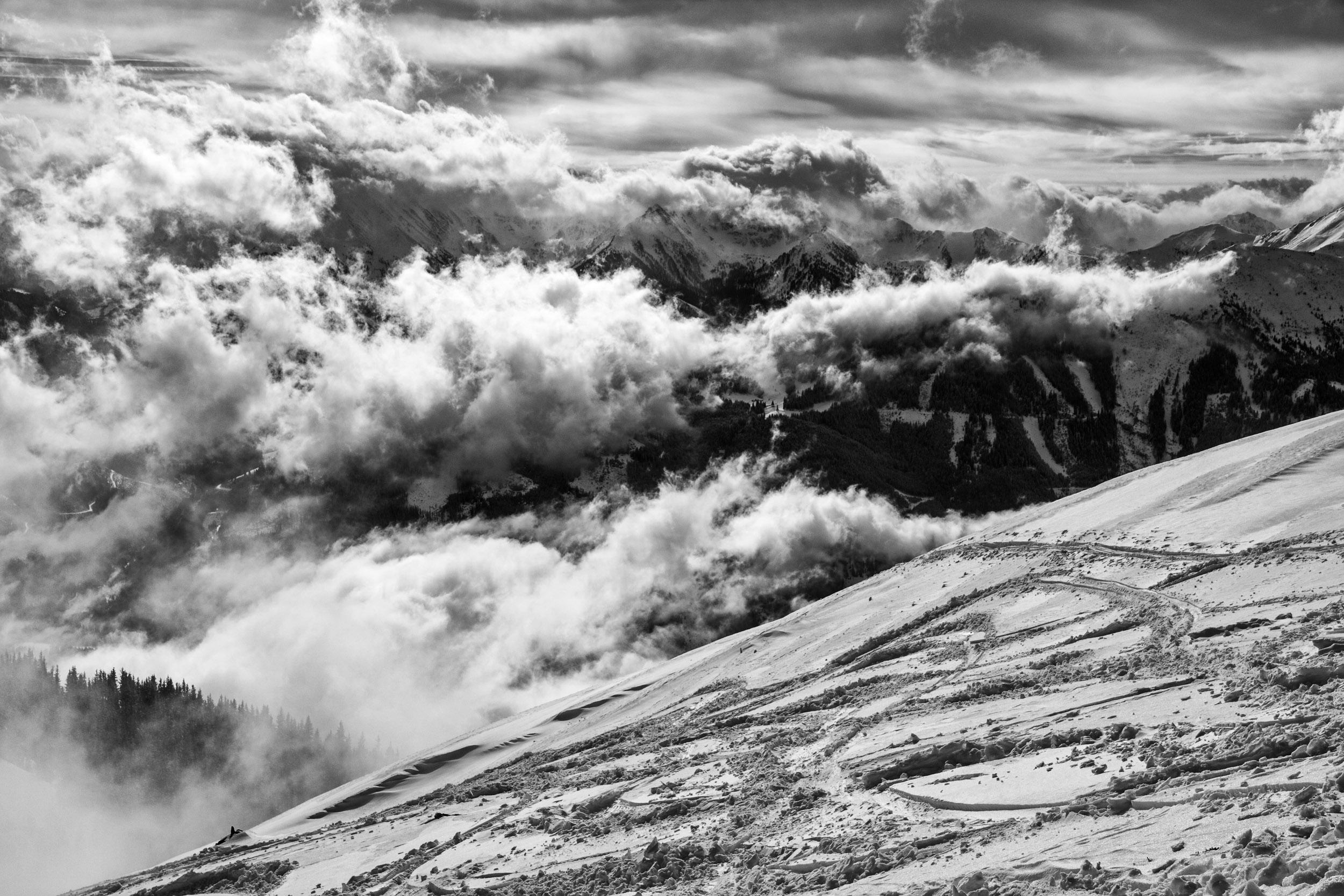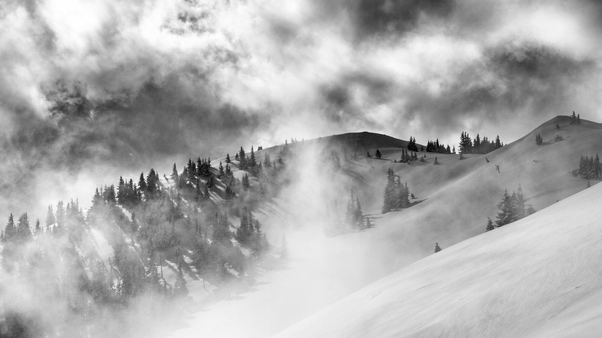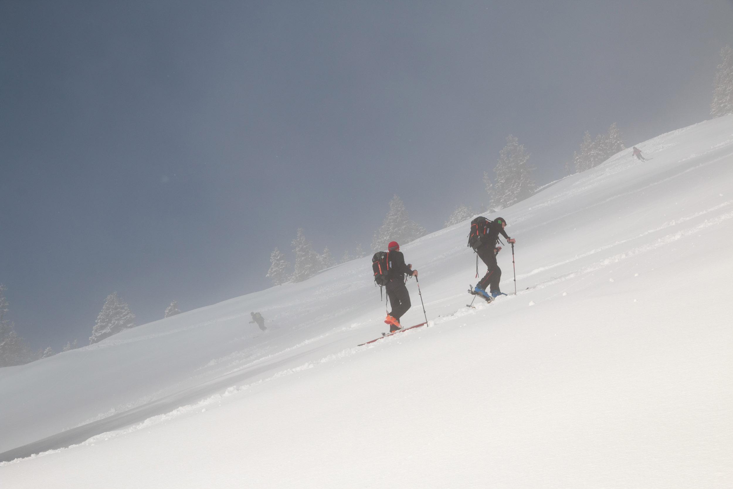 Ca. 10-15 cm frischer Pulverschnee auf kompakter Altschneedecke machten die Tour erstaunlich lohnend. Das Wetter hat auch mitgespielt, die sich rasend schnell verformenden Wolkenfetzen überm Schoberpass haben für gelegentlich durchziehende Nebelschwaden entschädigt. Weil so schön war, sind wir den Gipfelhang gleich nochmal rauf.