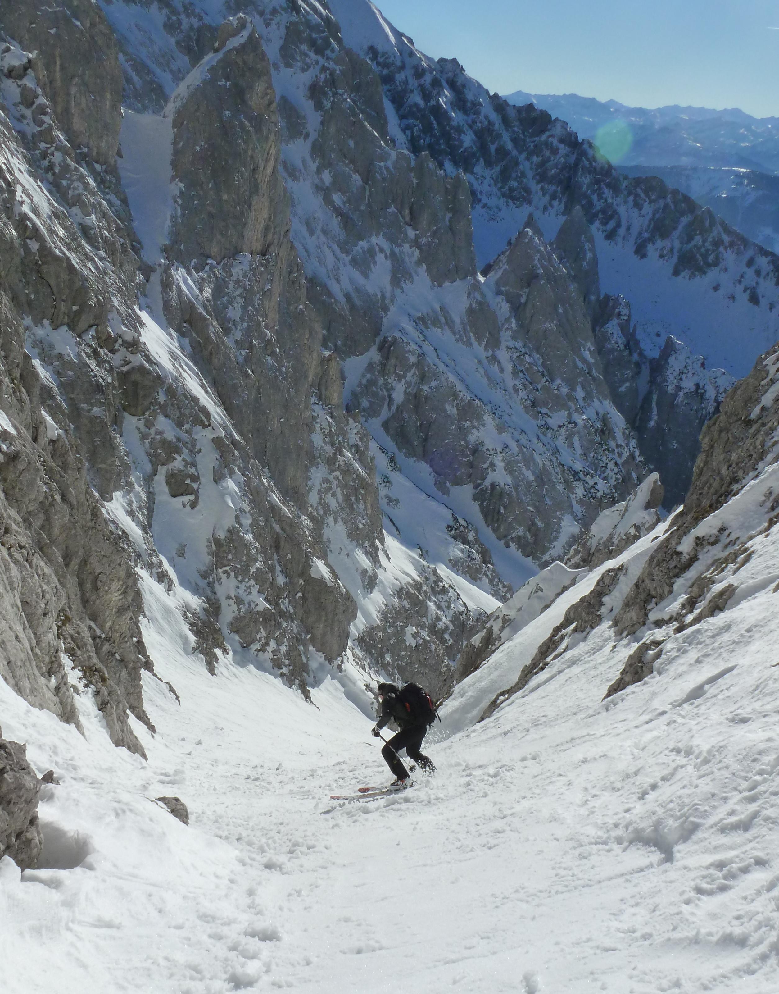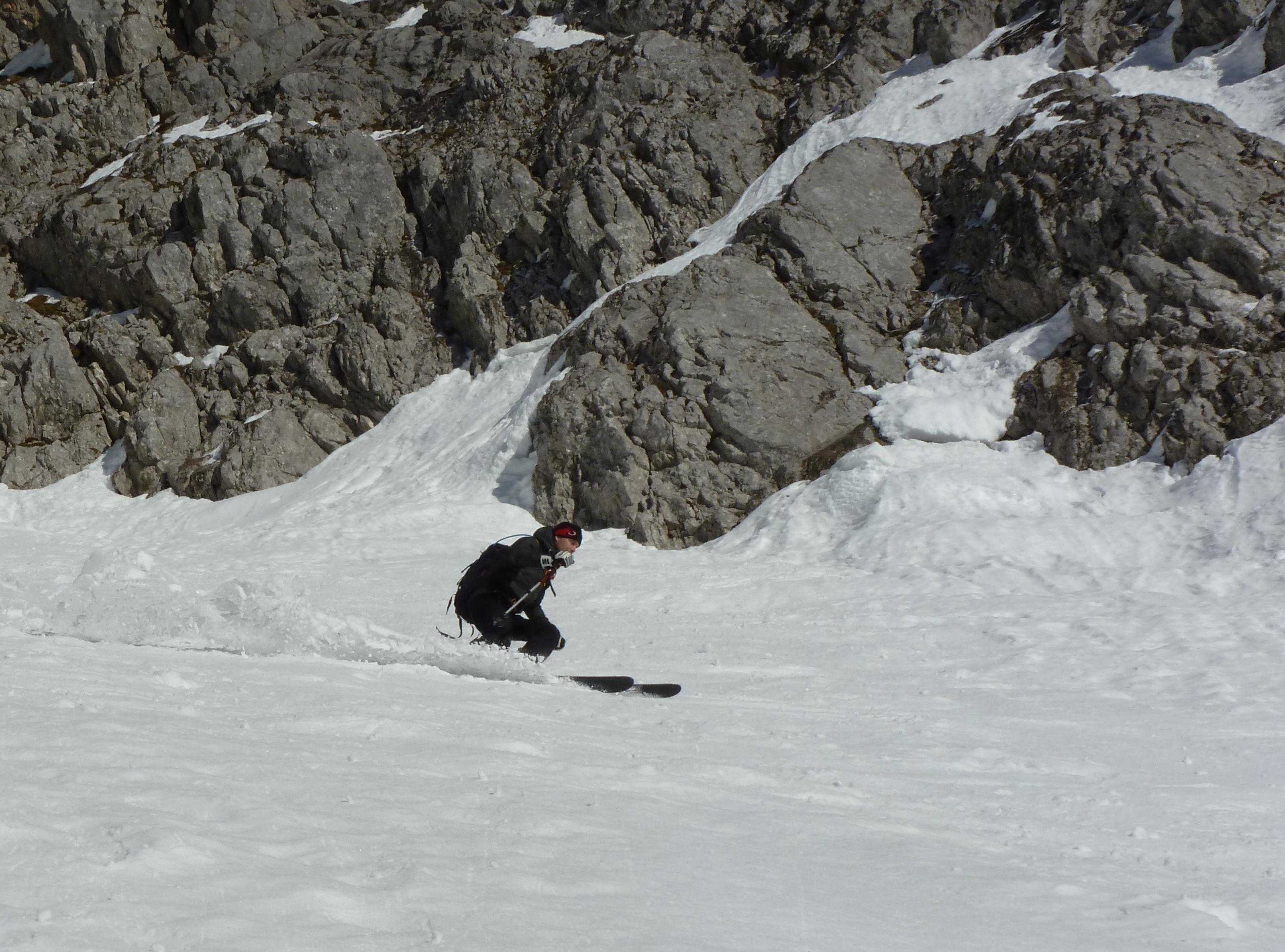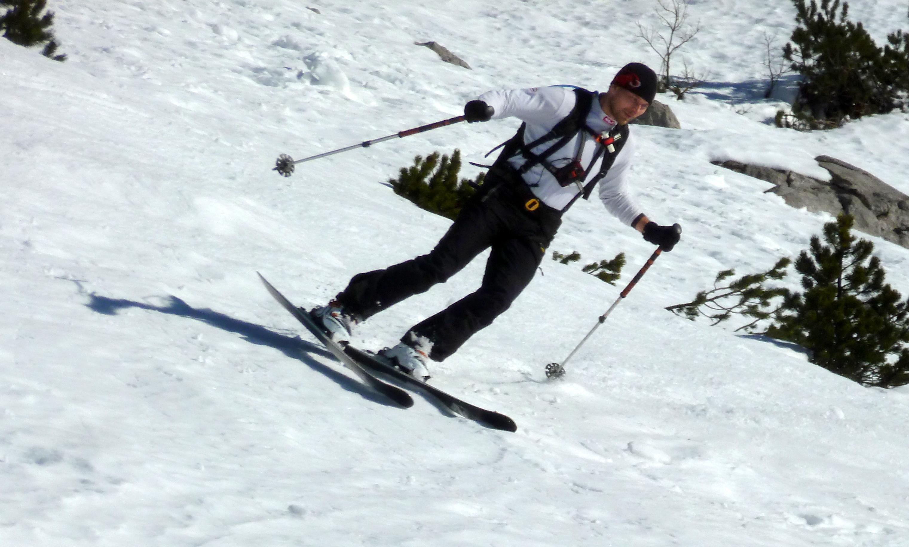 Bei besten Firnbedingungen sonnseitig unterwegs. Auch wenn der Latschengürtel eher abschreckend ausschaut, bieten sich doch genügend freie Passagen für eine brauchbare Linie im Anstieg wie in der Abfahrt. Die Auflage an Neuschnee - ca. ein Zentimeter - macht den Harsch griffig und im Firn schmiert´s umso schöner.