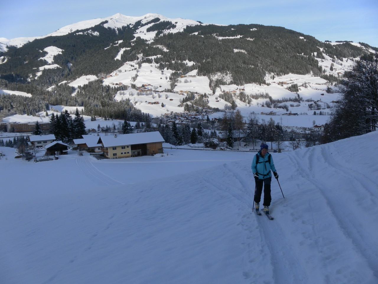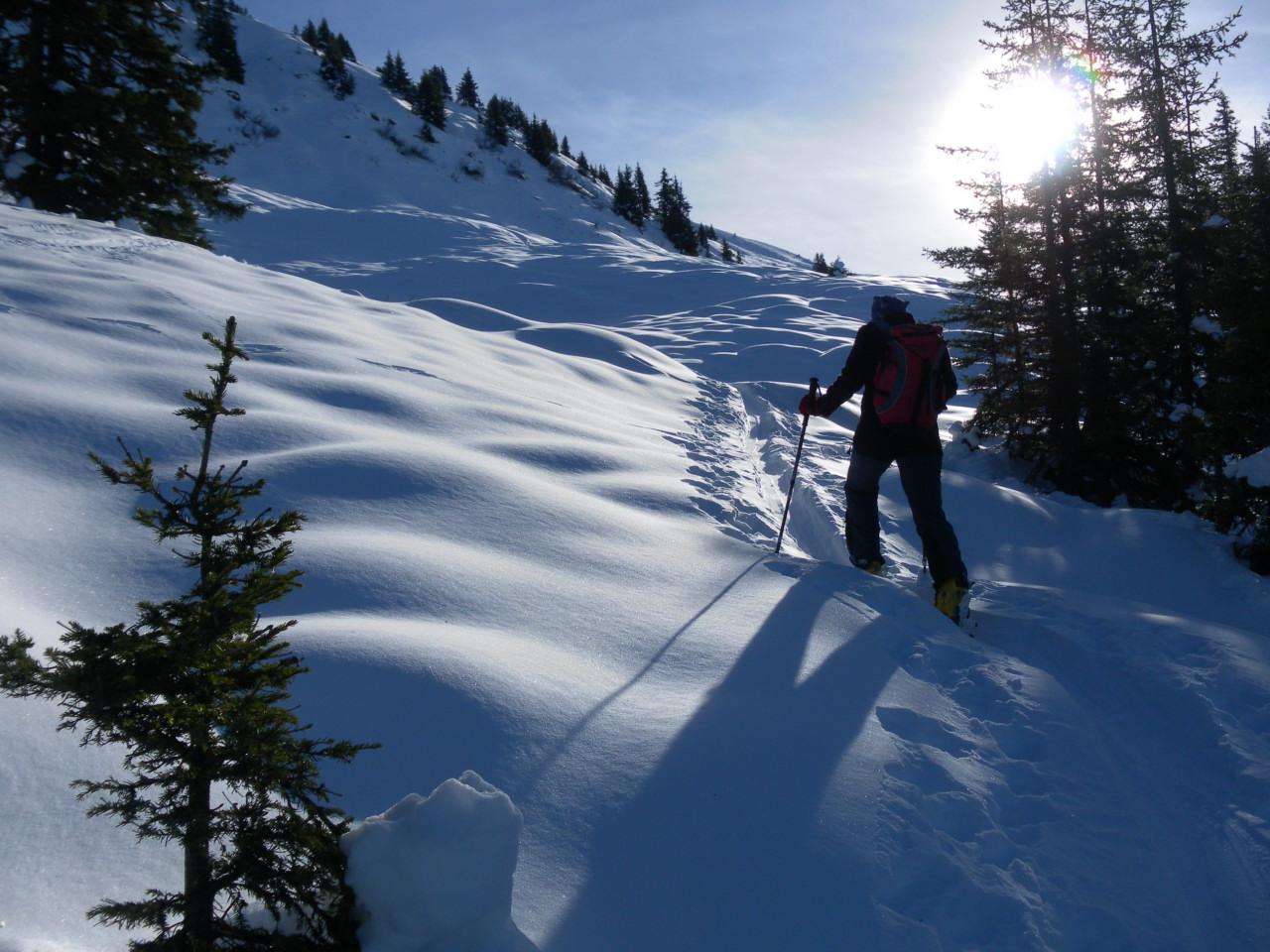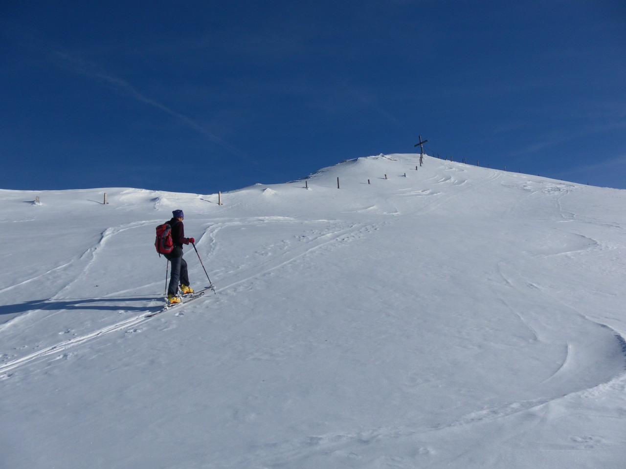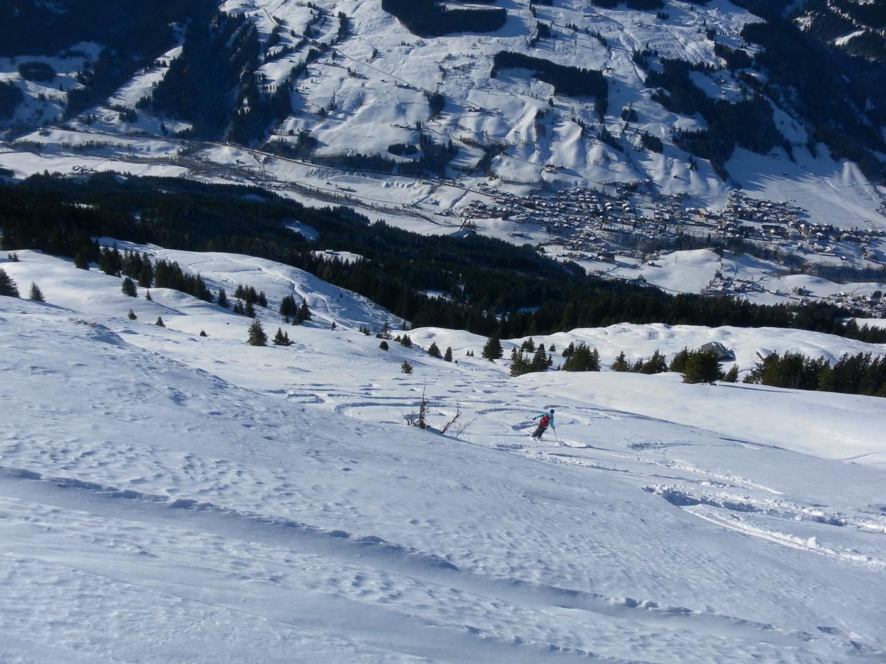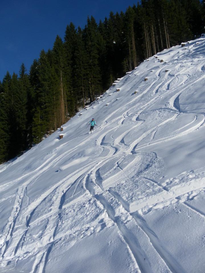 Von Jochberg-Taxen über die Wiesenhänge und den Nordwestgratrücken zum Großen Schütz. Vom Start weg ausreichend Pulverschnee, zuerst mit Rauhreifauflage, dann staubig und zuletzt nur leicht windbearbeitet. Es besteht jedoch noch keine gute Setzung. Daher gestaltet sich die Abfahrt eher unharmonisch: kurze tragende Passagen in Pulverfreude, häufig unverhofftes Durchsacken bis zum Gras/Strauchgrund.