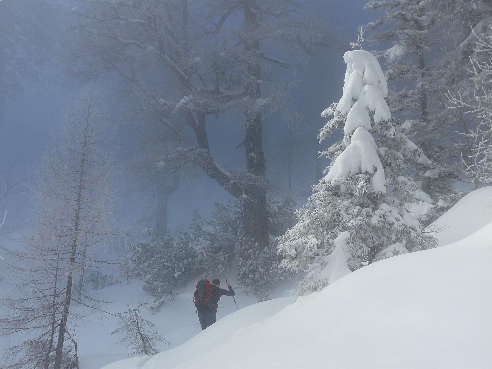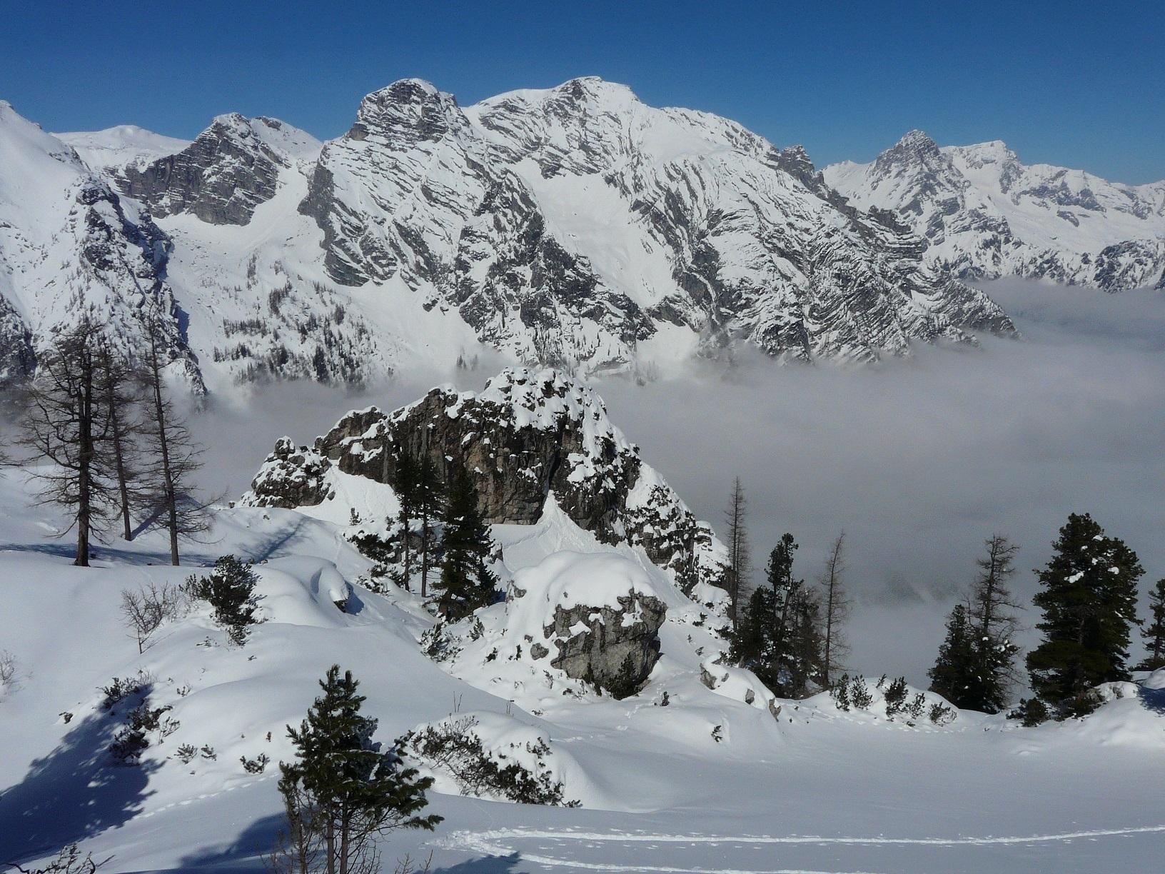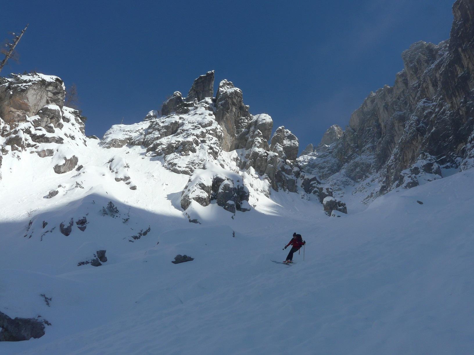 Hervorragende Verhältnisse am Birnhorn. Nur im untersten Viertel der Waldstufe müssen die Ski getragen werden. Darüber dann jede Menge Schnee. Im Lärchenwald sogar gesetzter Pulver, je nach Exposition bei der Abfahrt schon leicht angefeuchtet. Im Ebersbergkar haben Wind und Wärme den Schnee behandelt, zur Mittagszeit aber sehr gut zu fahren. Ich habs auf den Punkt erwischt, nachmittags wirds bei Sonnenschein sicher schwer und nass.