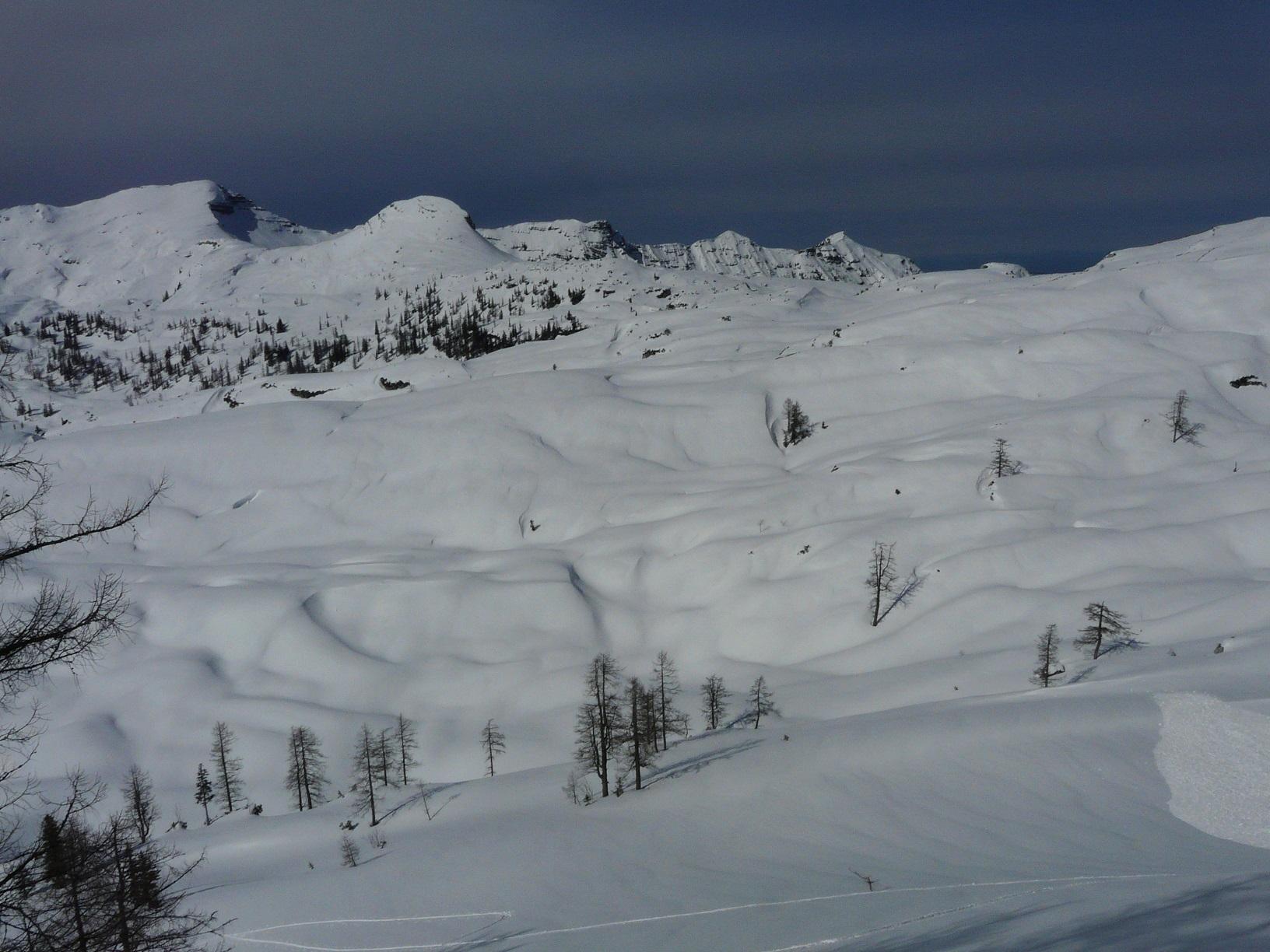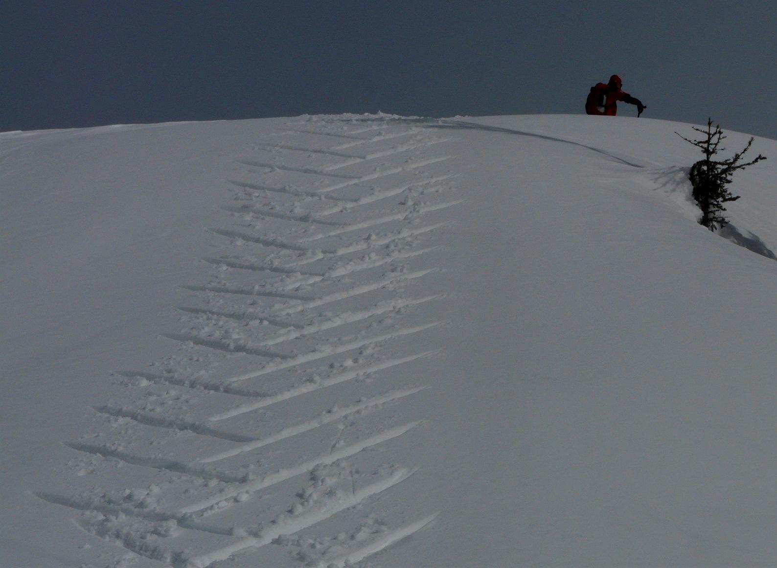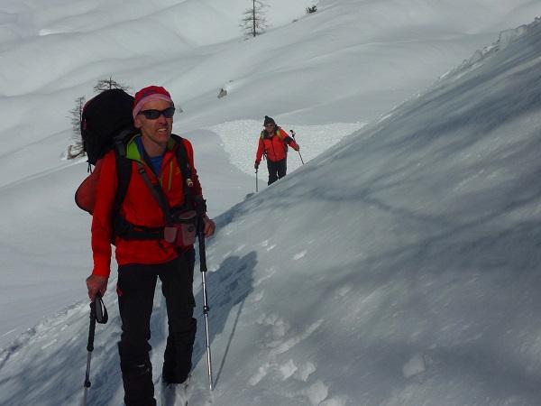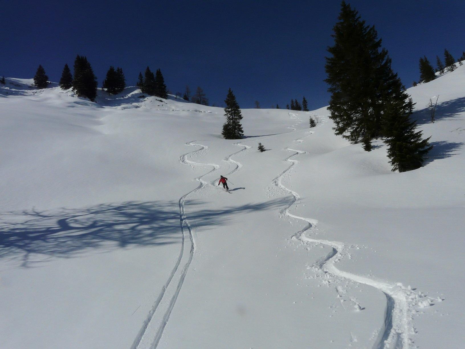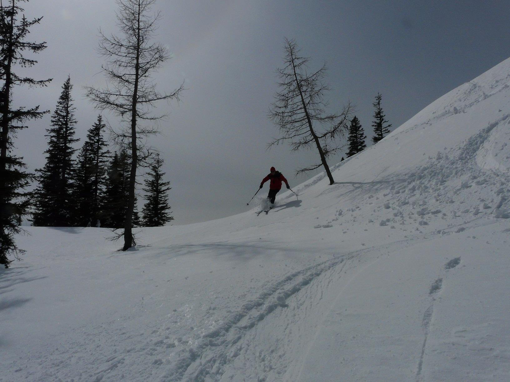 Schneebedingungen: Anstieg anfangs harschig, dann pulvrig, häufig eingeweht - Abfahrten: oberer Abschnitt Schrotthang (Süd) Firn, dann gesetzter Pulver, Freithofleiten nordseitig herrlicher Pulver - allerdings große Schneebrettgefahr, mehr oder weniger absichtlich Schneebrett ausgelöst
