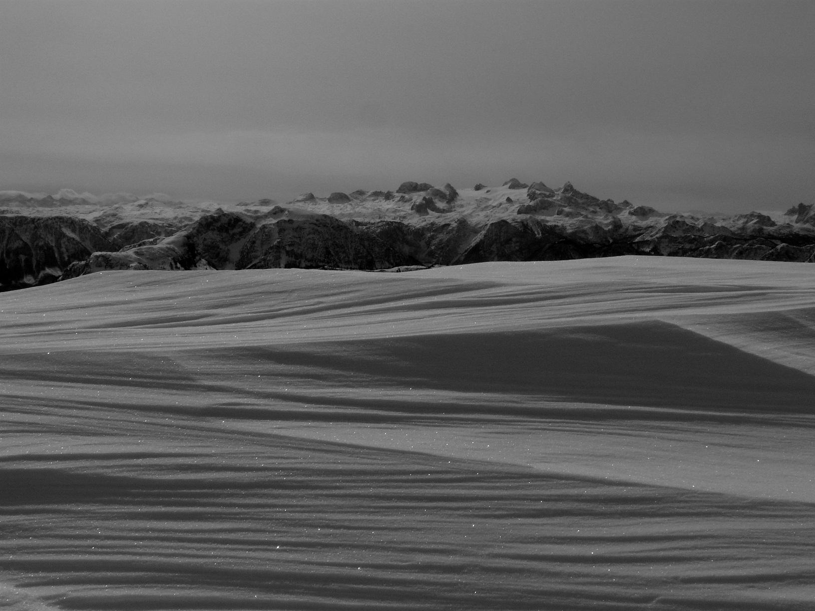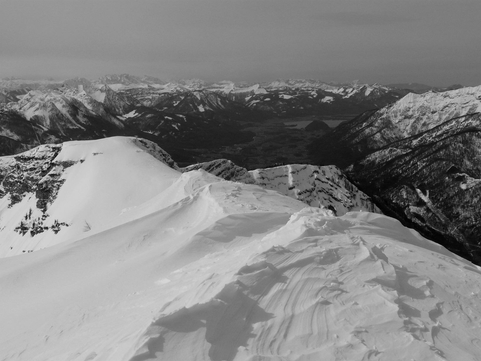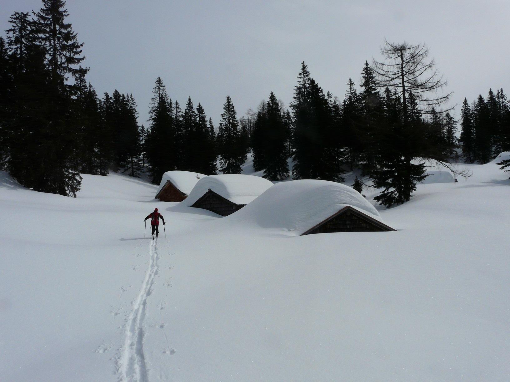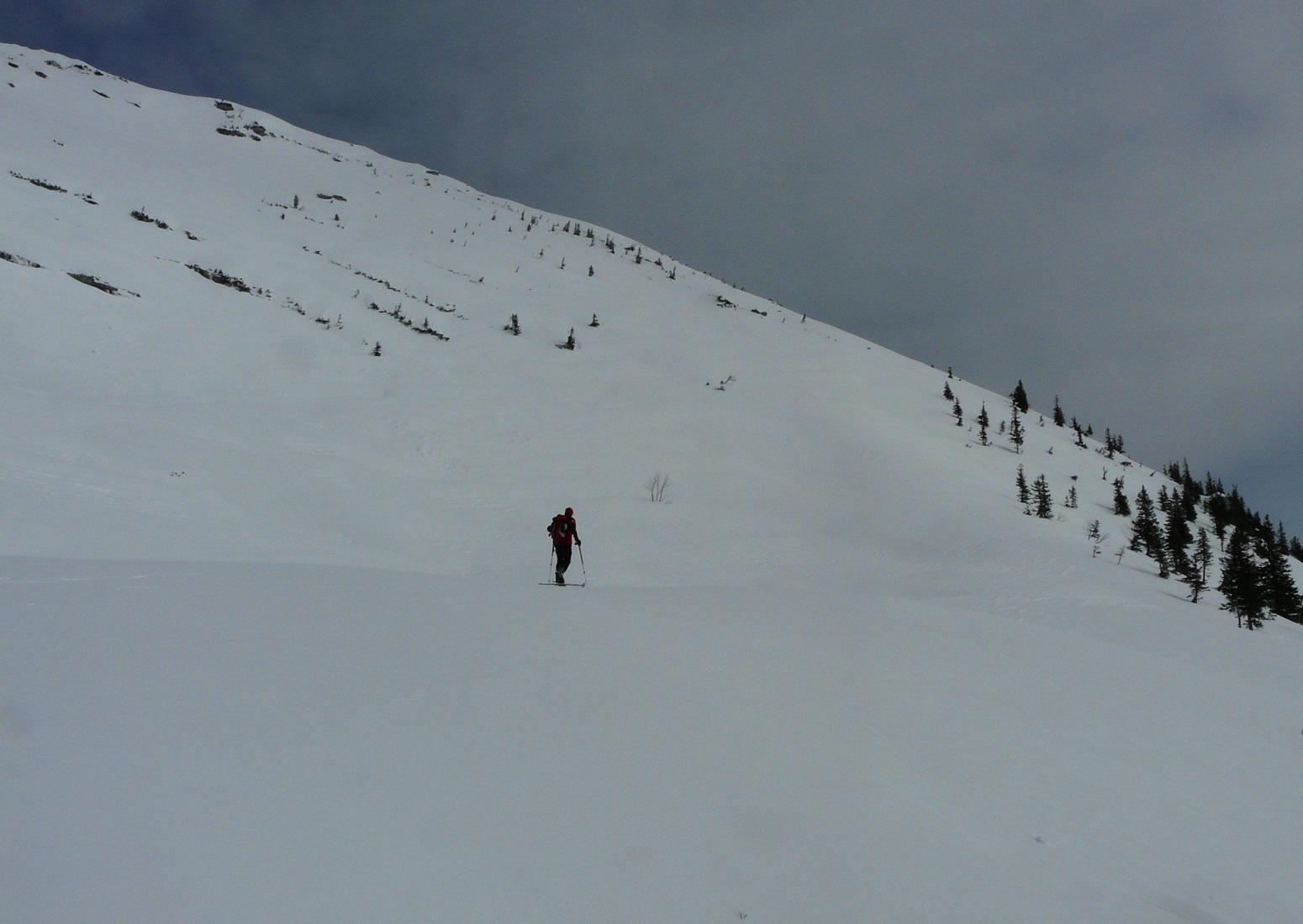 Schneebedingungen: Anstieg anfangs harschig, dann pulvrig, häufig eingeweht - Abfahrten: oberer Abschnitt Schrotthang (Süd) Firn, dann gesetzter Pulver, Freithofleiten nordseitig herrlicher Pulver - allerdings große Schneebrettgefahr, mehr oder weniger absichtlich Schneebrett ausgelöst