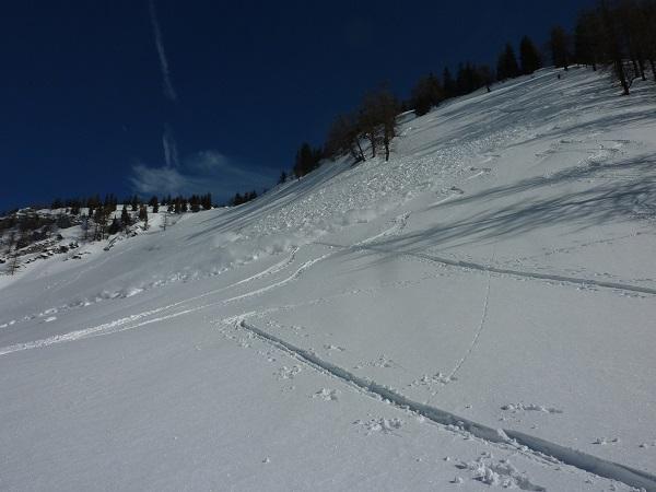 (Anriss war erkennbar), weitere Abfahrt aufgrund südwestseitiger Ausrichtung angewärmt, unter 1.000m zunehmend sulzig, aber gut zu fahren.
