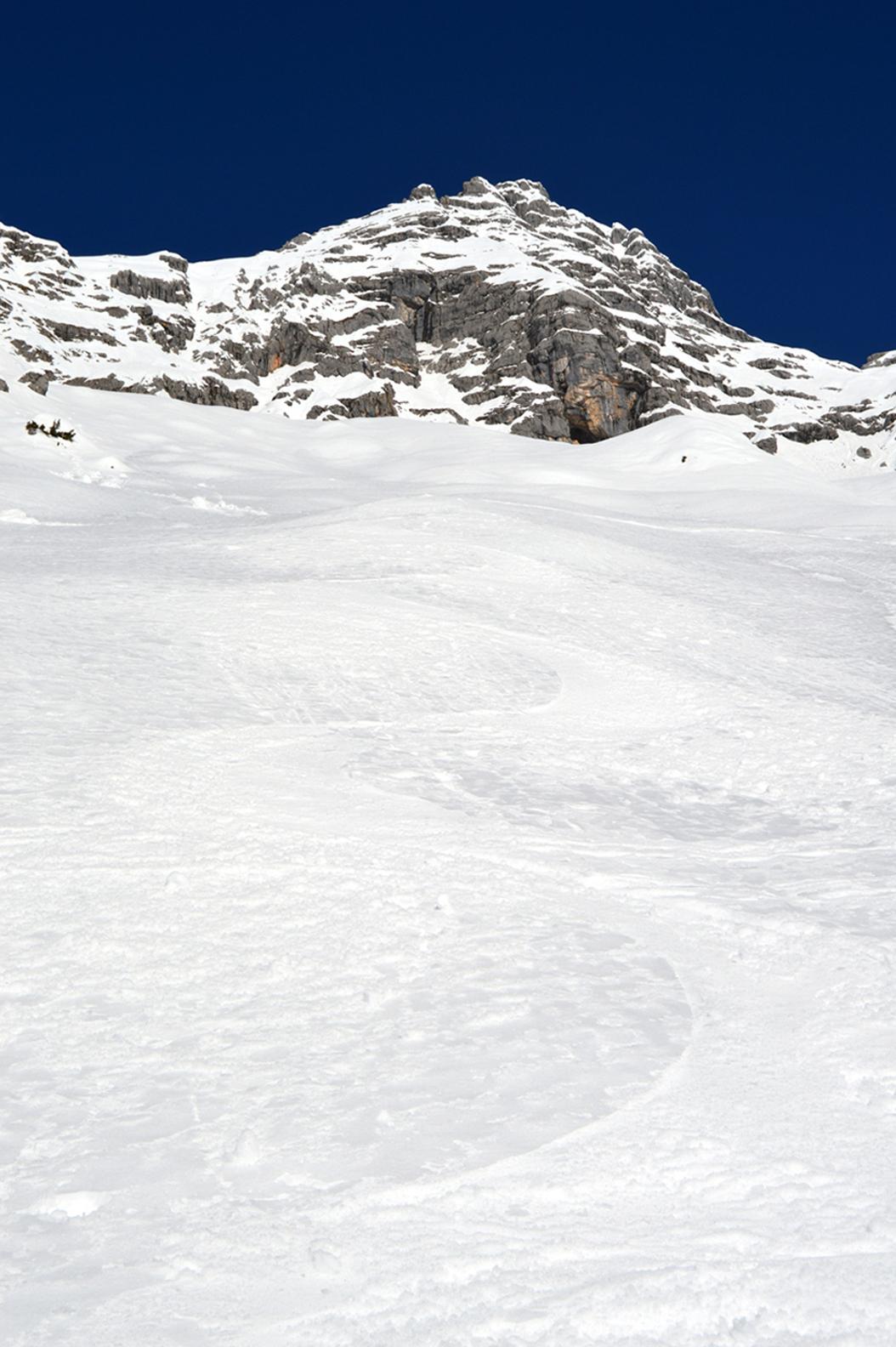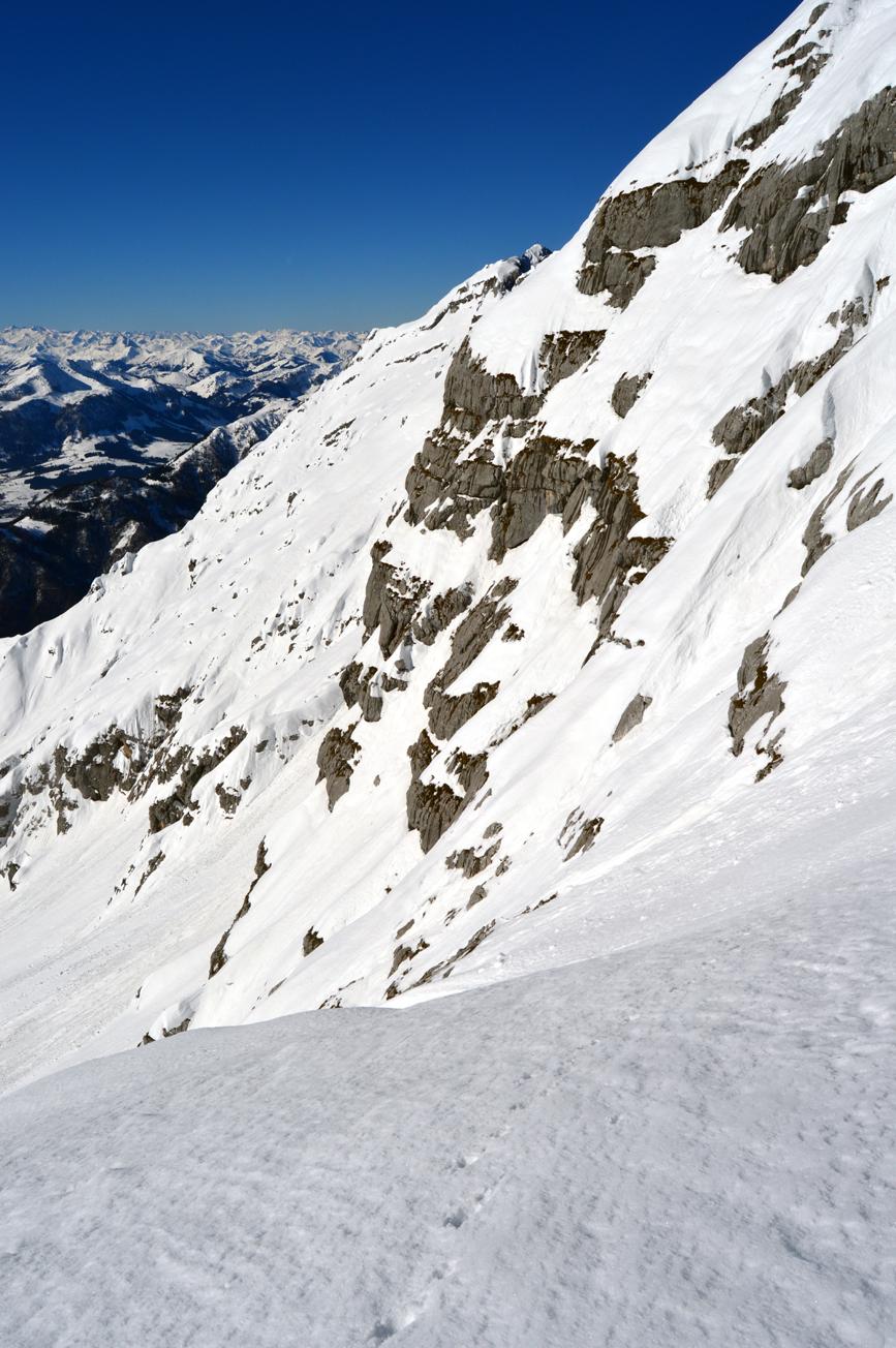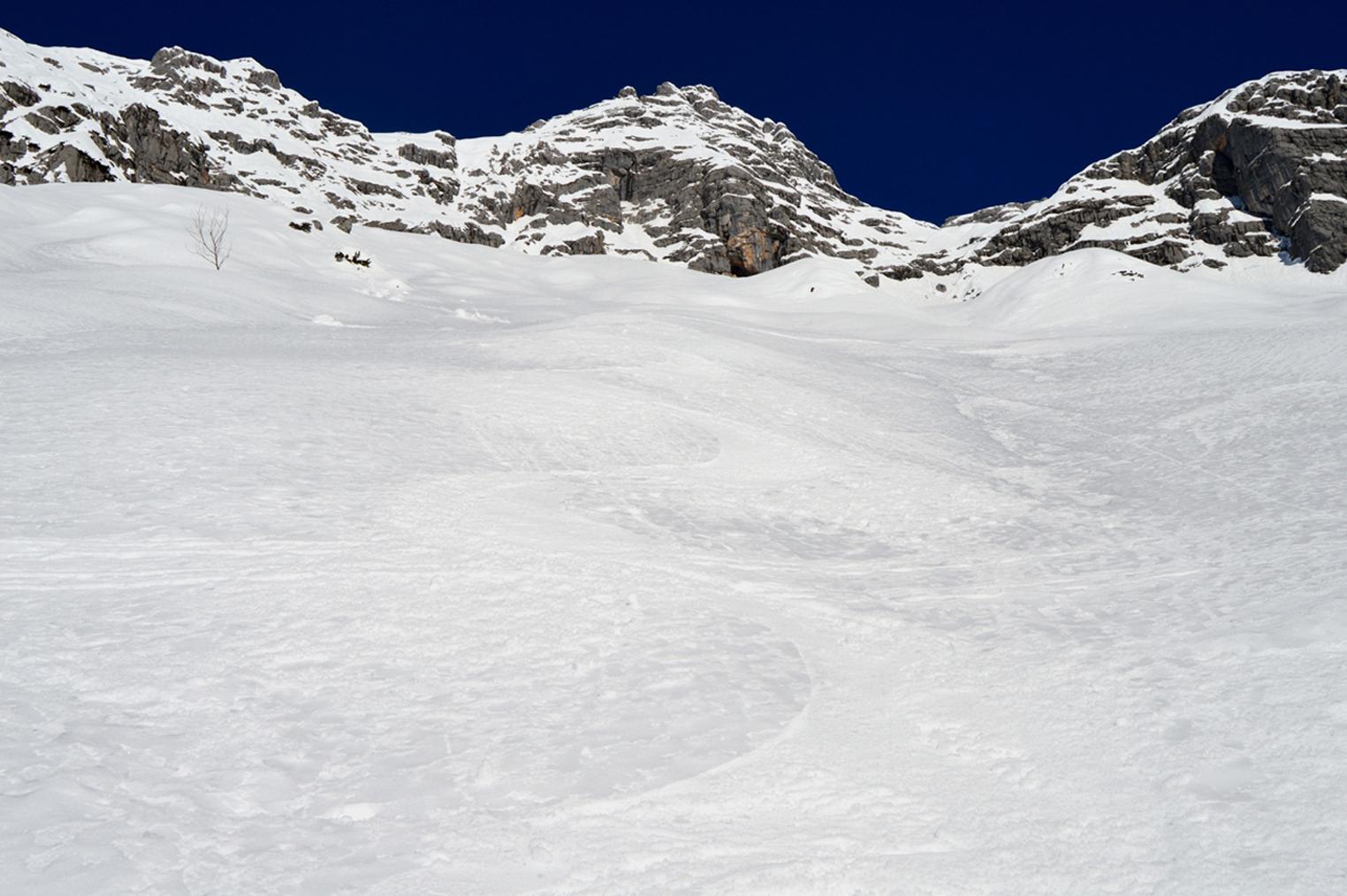 Vielleicht die perfekteste Abfahrtslinie in den Loferer Steinbergen (45° steil - bei der Querung aus dem Klapperloch deutlich steiler!)
