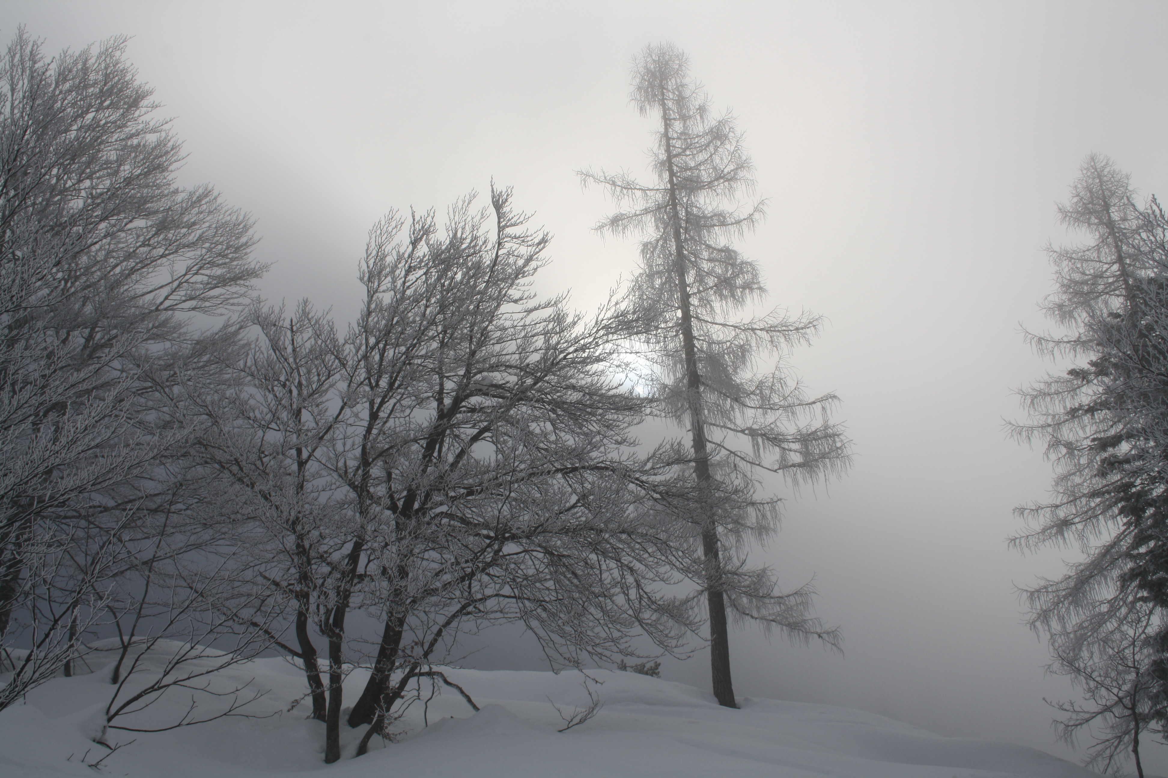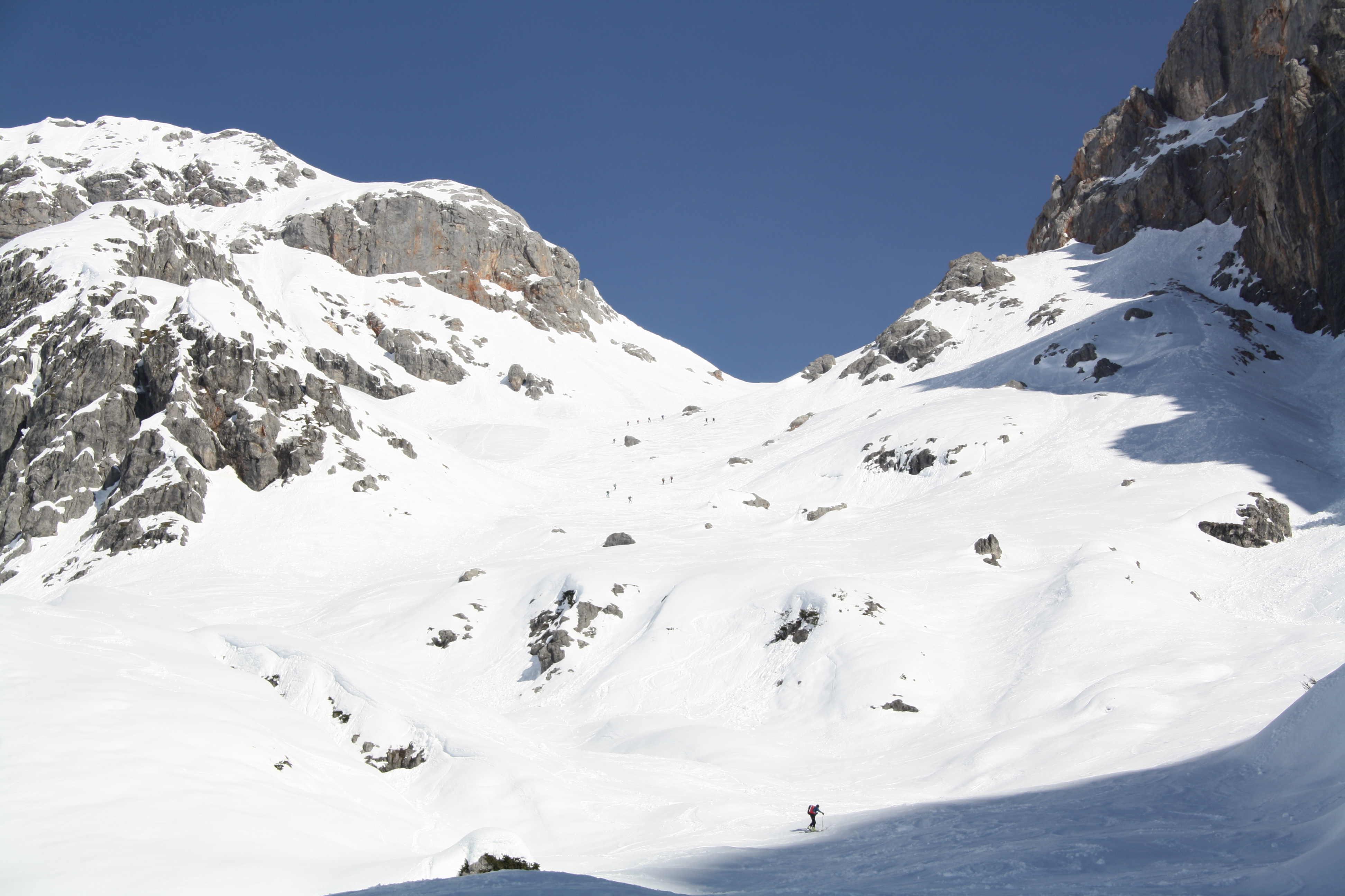 der Harschdeckel ist noch zu dünn für schönen Firn. Im Steilen wars gut zu fahren - wenn man die richtigen Stellen gefunden hat. War ein Mittelding zwischen tiefen Firn und Sulz. Am Rücken oberhalb der Alm Bruchharsch (der Nebel hatte sich zu lange gehalten).
