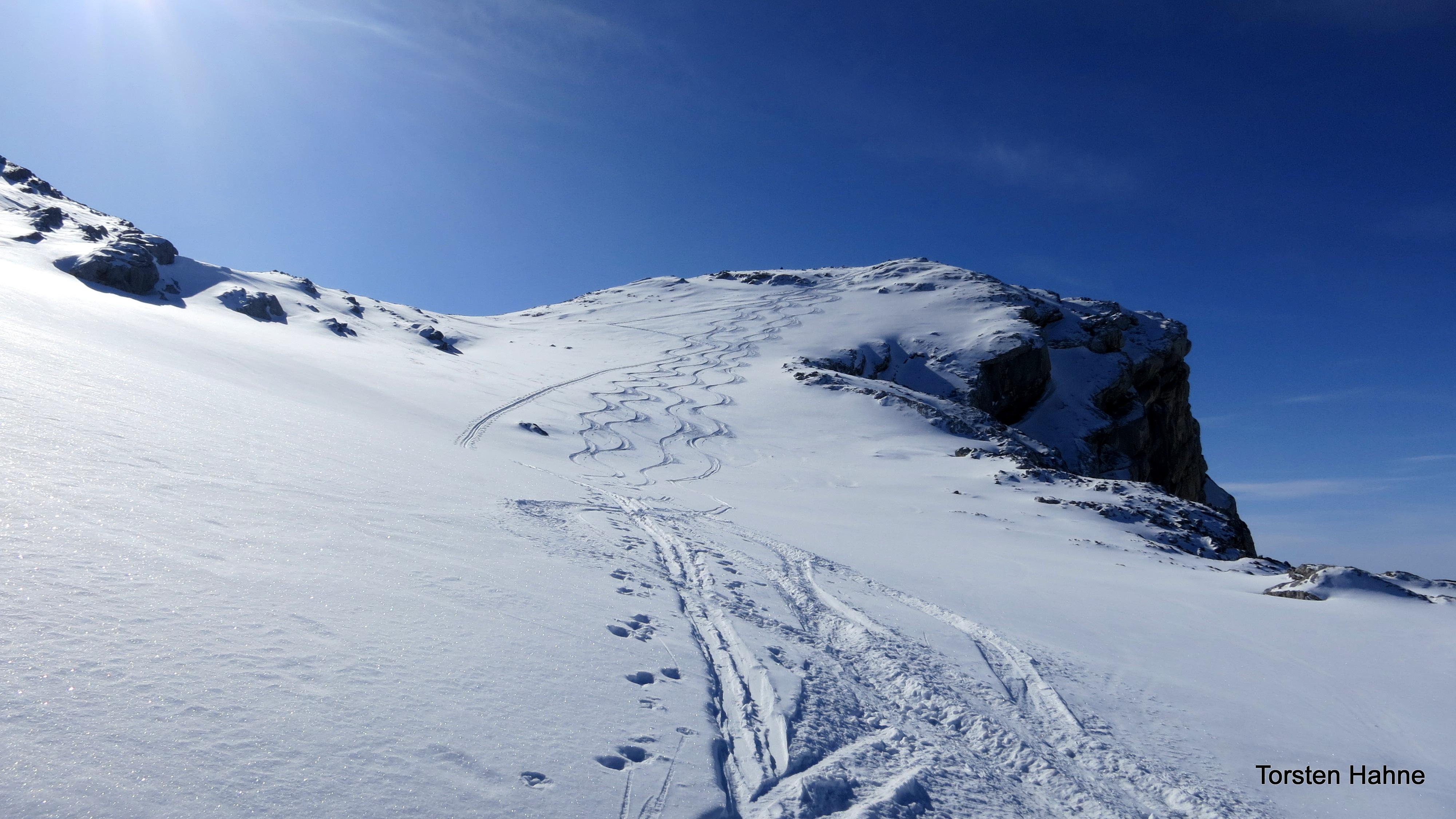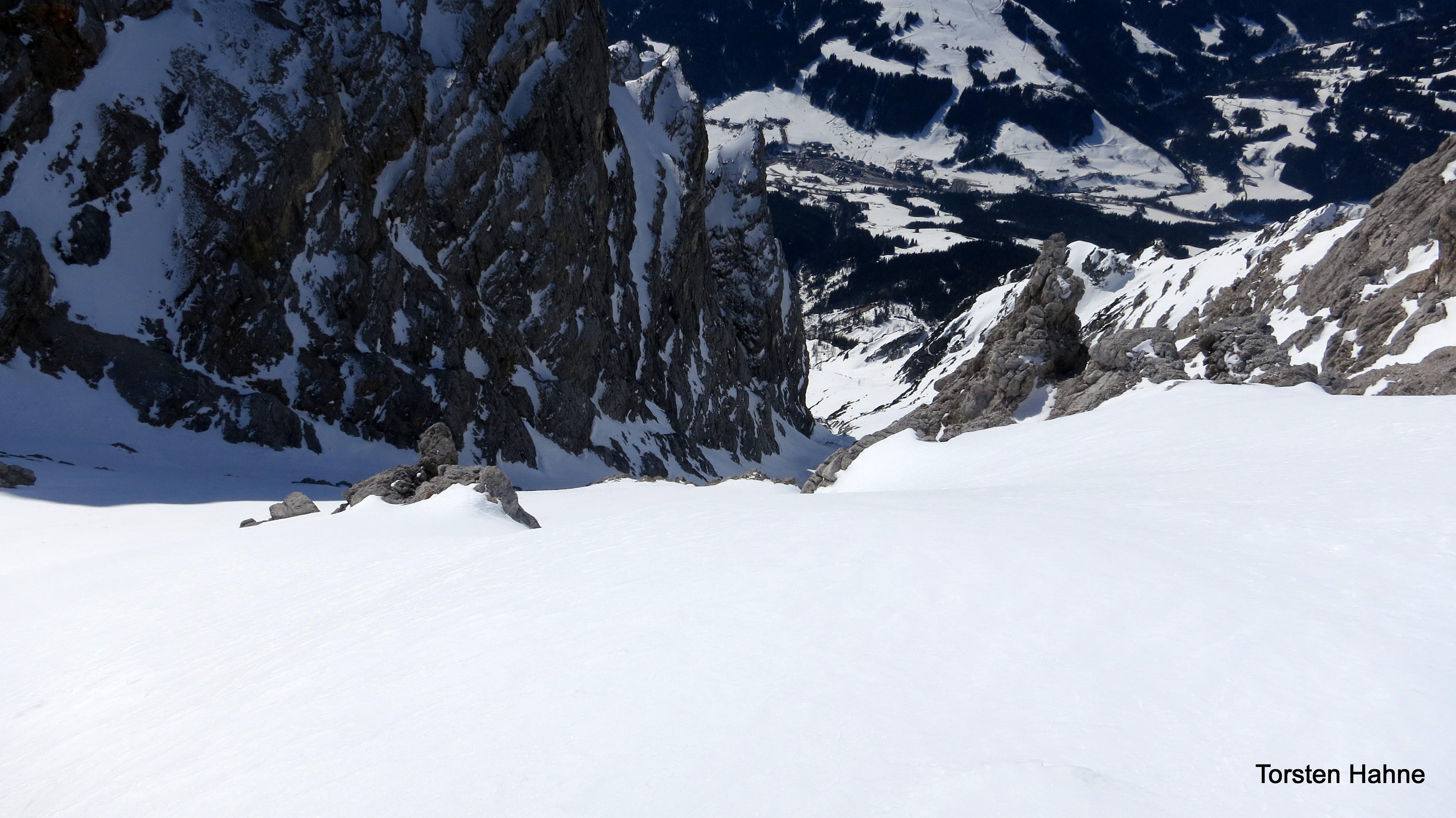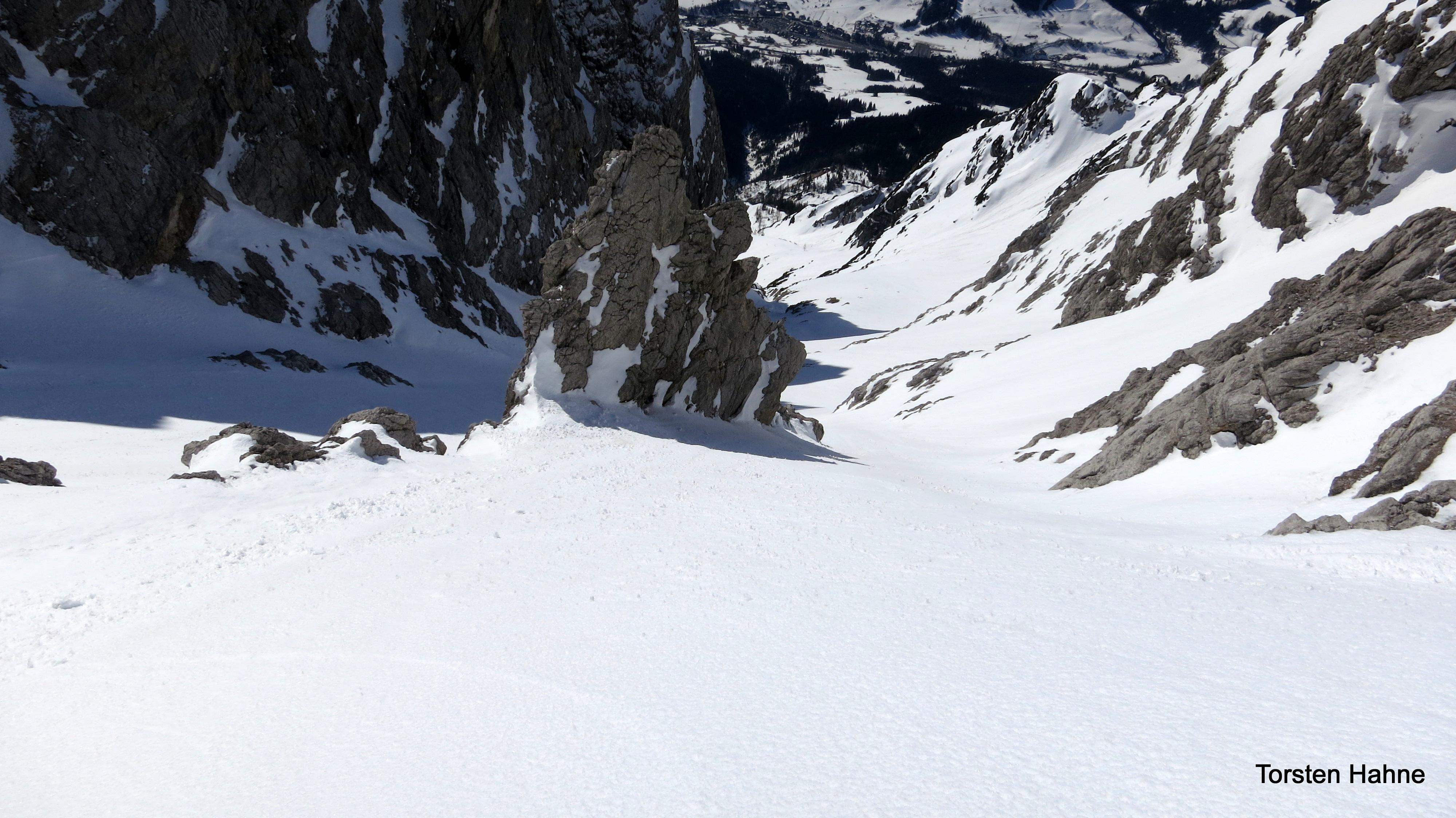 Gute Bedingungen im Ritzenkar. Noch reicht die geschlossene Schneedecke bis zum Parkplatz. Abfahrt bei bestem Firn um kurz nach 10 Uhr. Im obersten Teil muss man sich um diese Uhrzeit in Abfahrtsrichtung rechts halten (steile Rinne hinter einem Felsturm), da der östliche obere Teil des Kares noch im Schatten liegt und sehr hart ist.