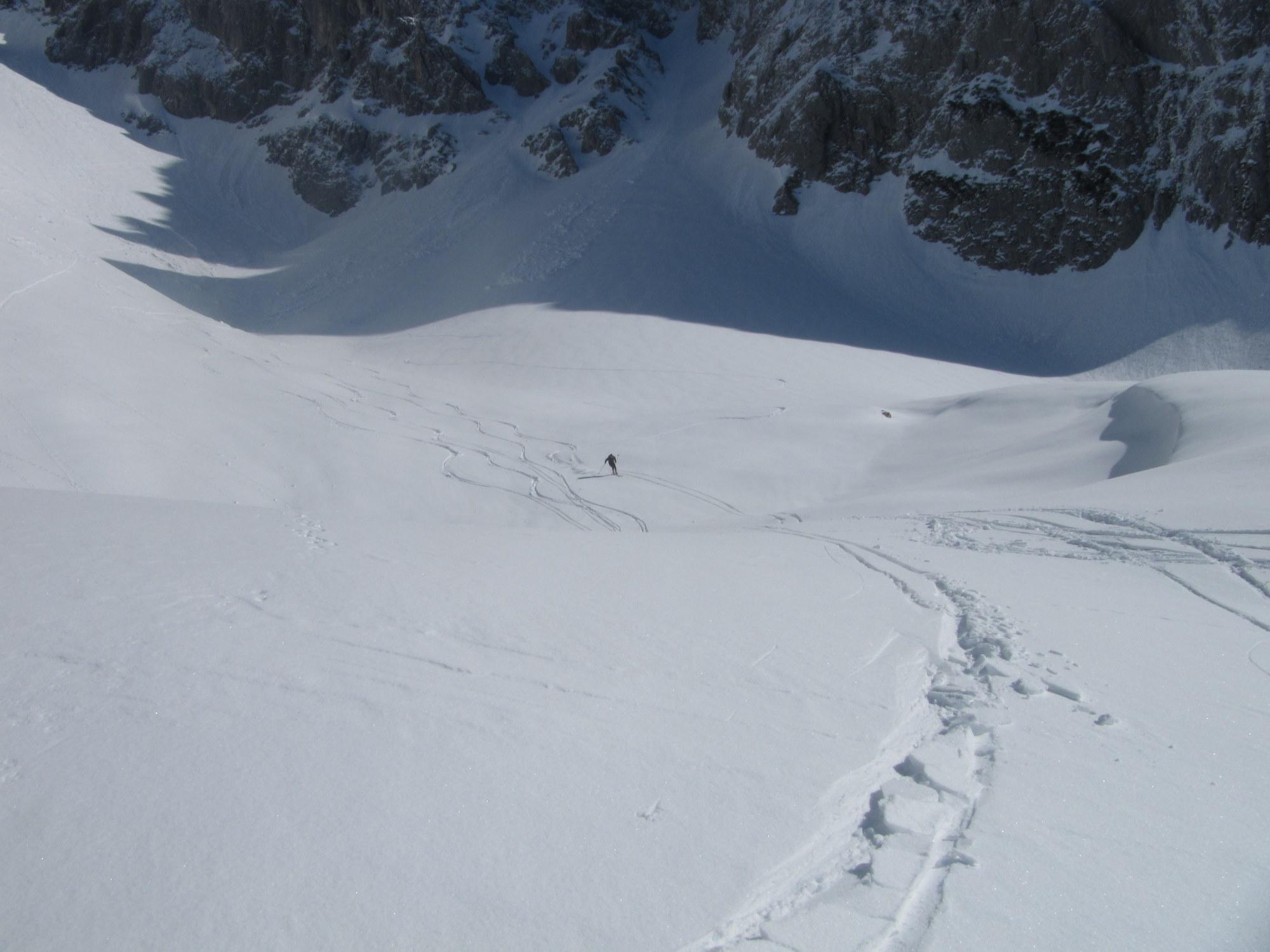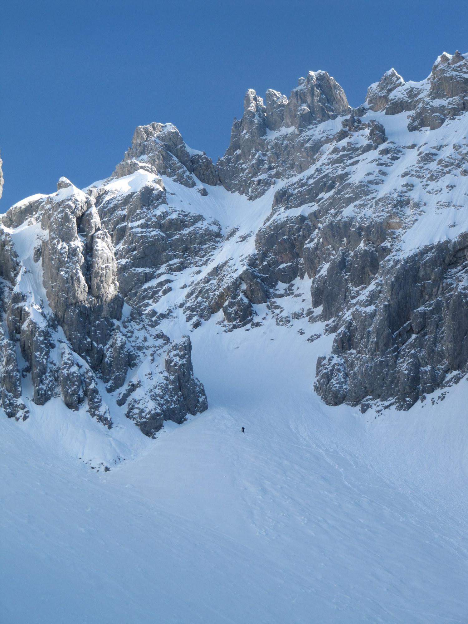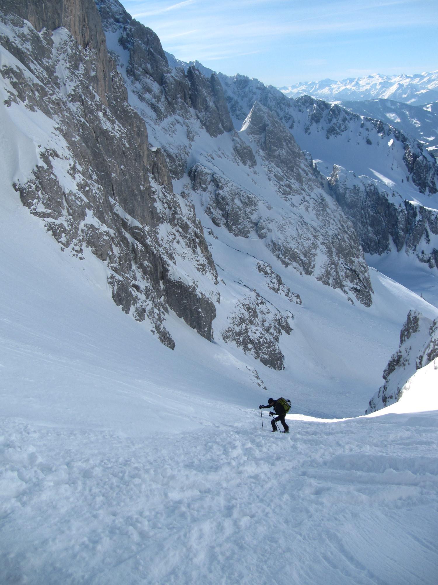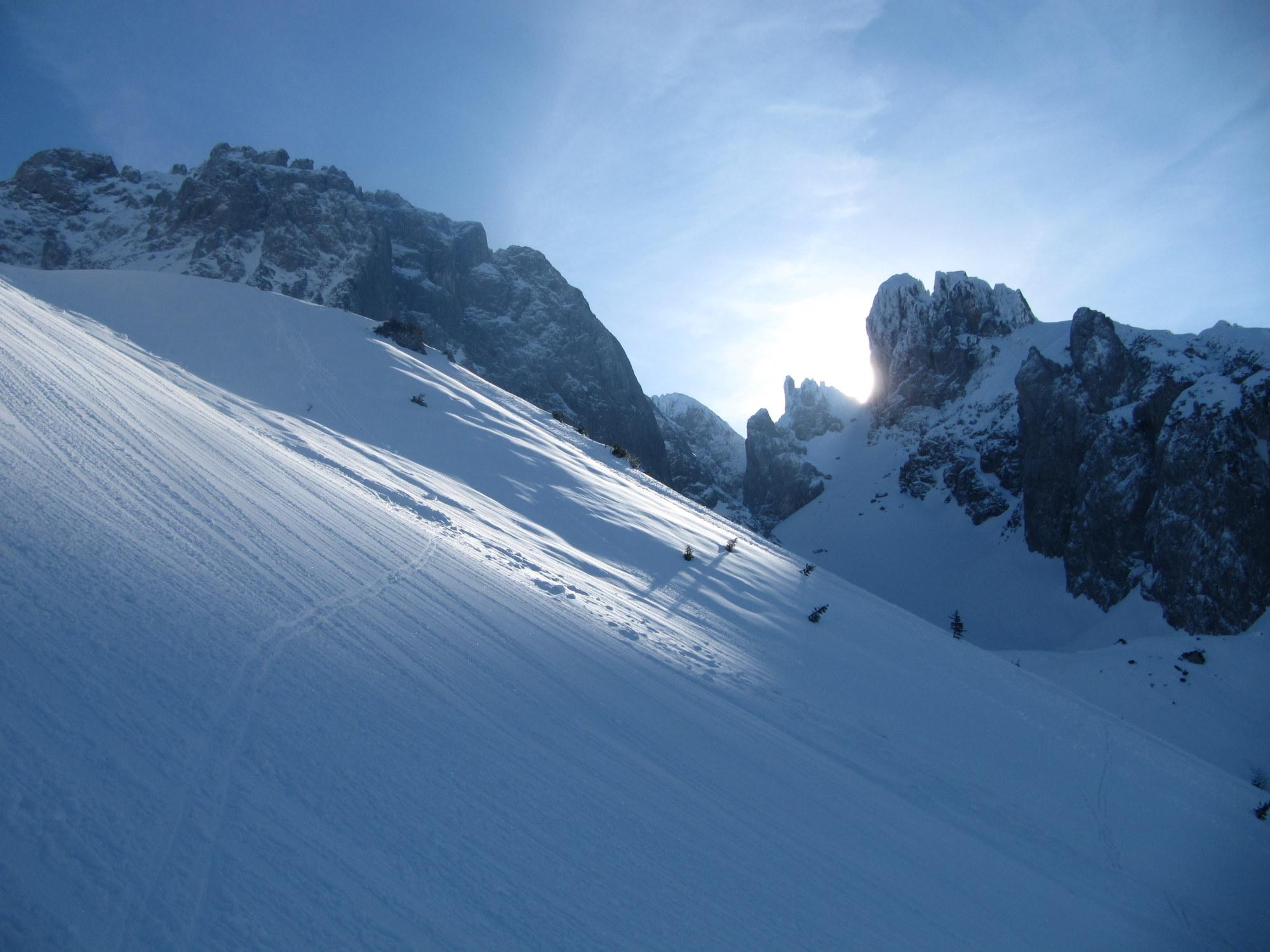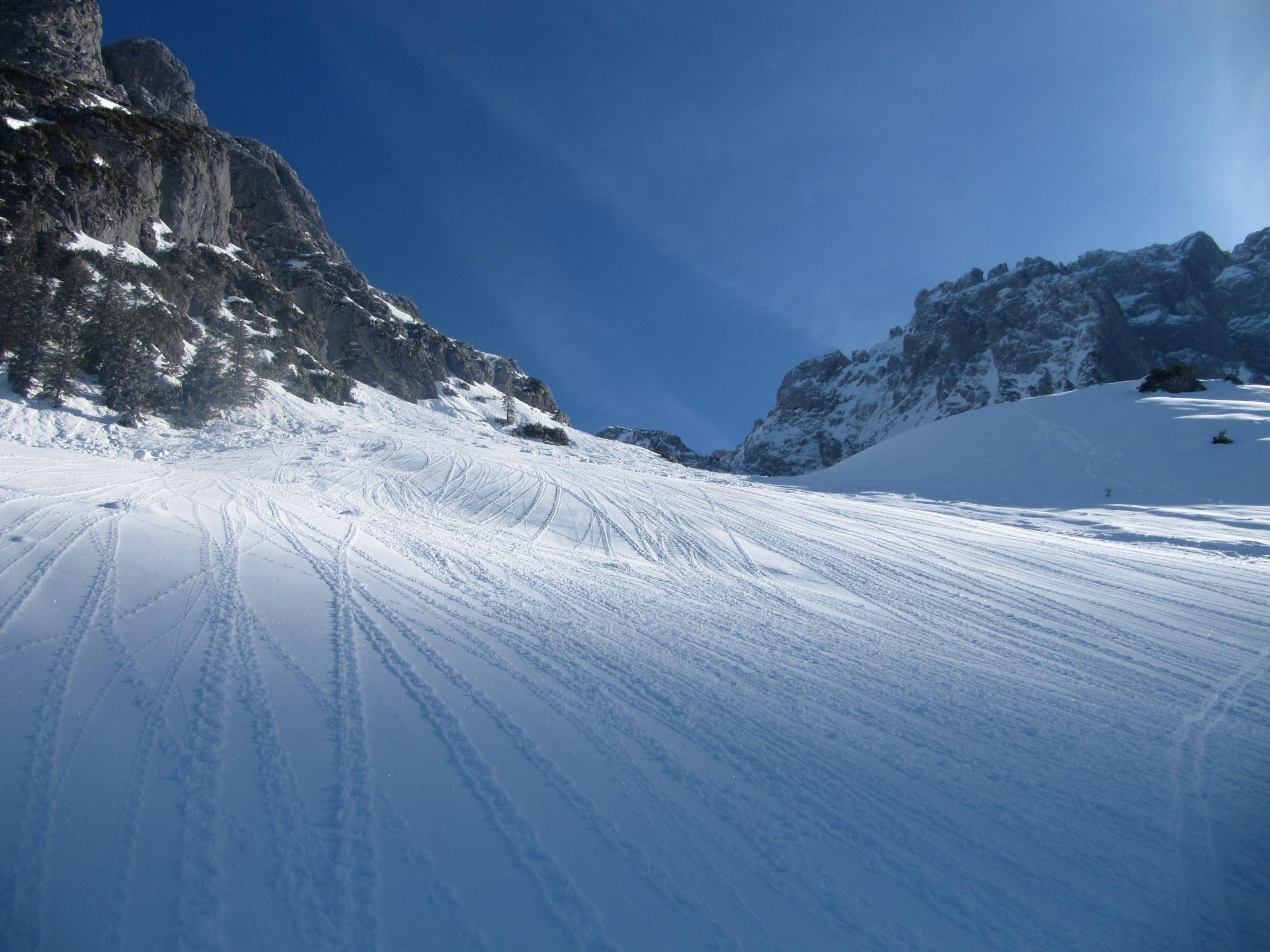 Etwa 10 cm Neuschnee auf Harschdeckel, in der Rinne kammnah Zunahme des losen Pulvers; mühsam im Aufstieg. Ab ca. 10.30 Uhr beginnt es von den steilen Felsflanken zu rieseln, auch kleinere Rutsche sind dabei. Abfahrtsbedingungen: in der Rinne Pulver, im ungeschützten Bereich teilweise noch Bruchharsch, teilweise schon Firn, im Wald ab der Stuhlalm wieder feinster Pulver.