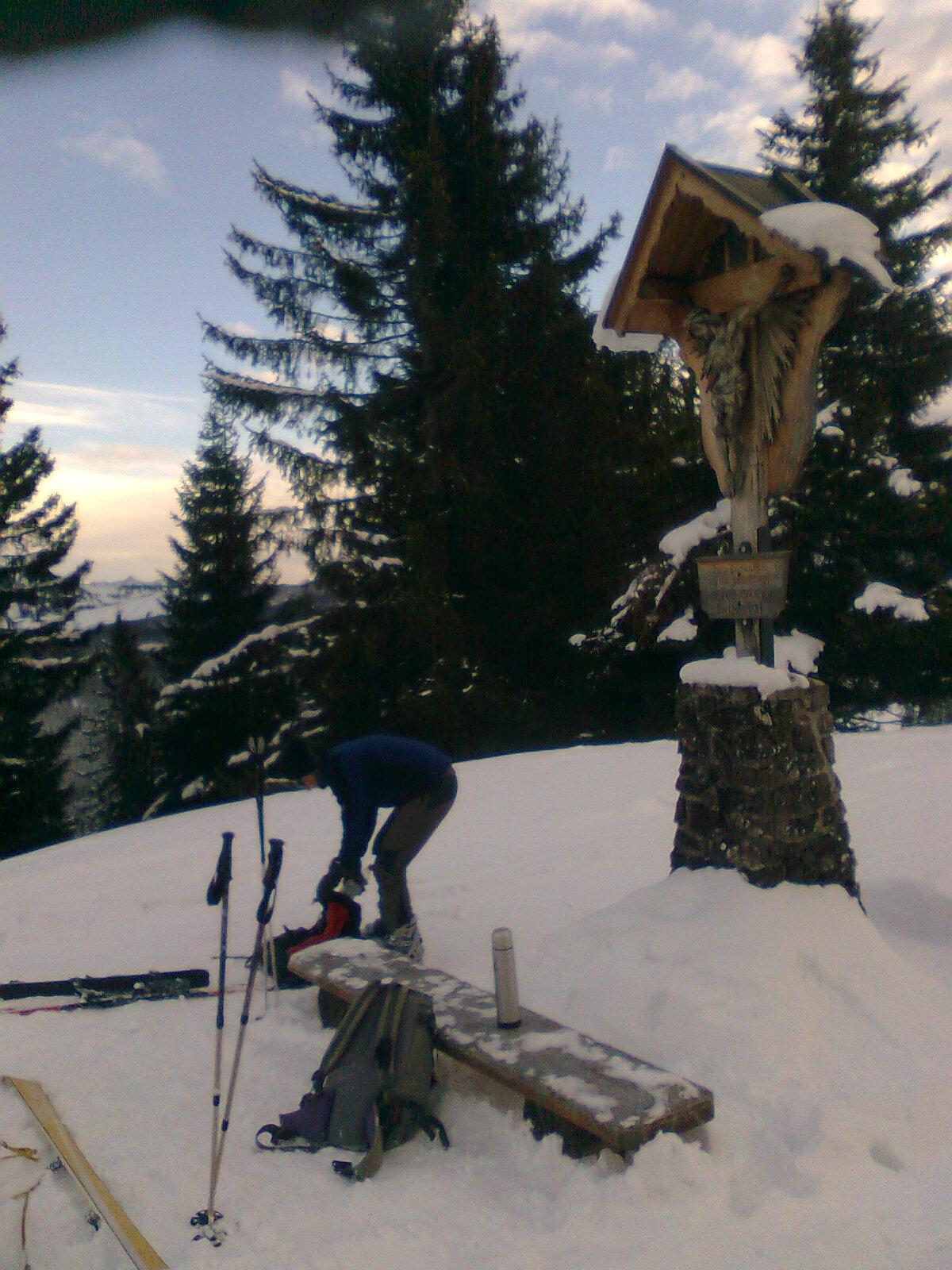 Bei der Abfahrt haben wir den Umweg über den Scheibelberg genommen. Dort hat am Gipfelkreuz einer eine Thermosflasche stehengelassen. Der Verlierer kann sich mit mir in Verbindung setzen.