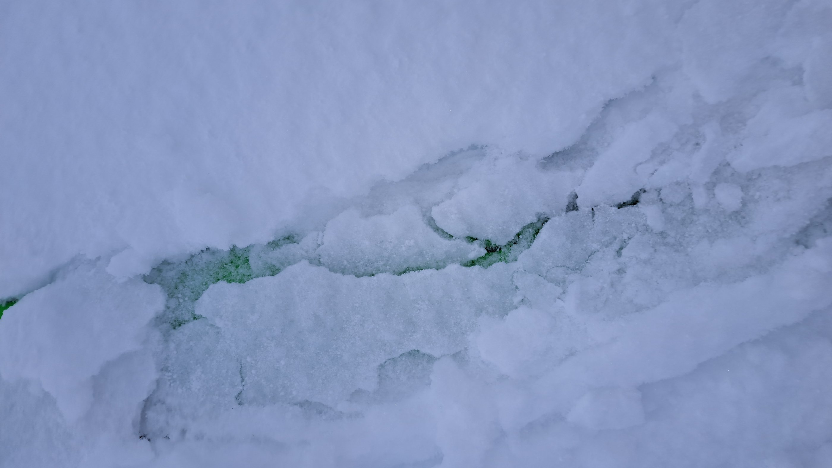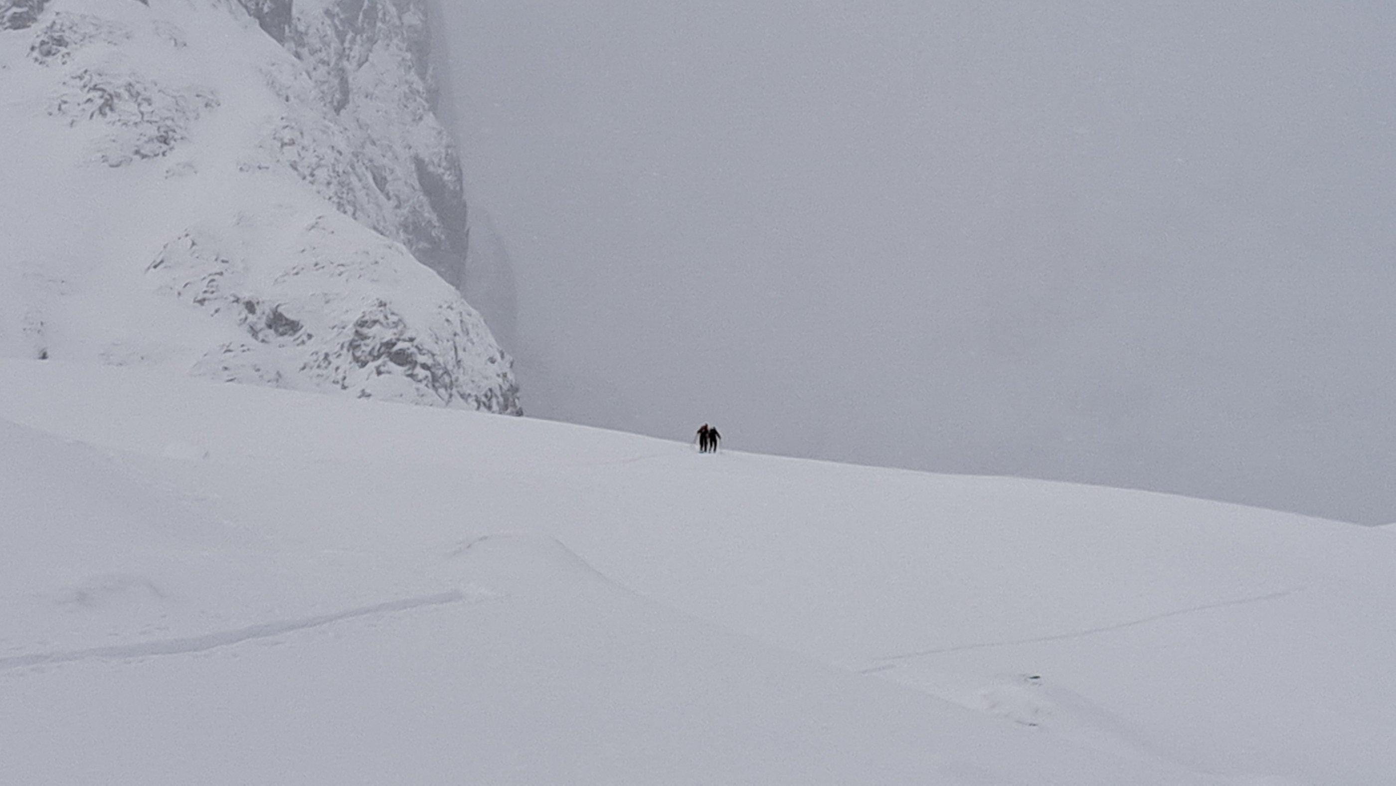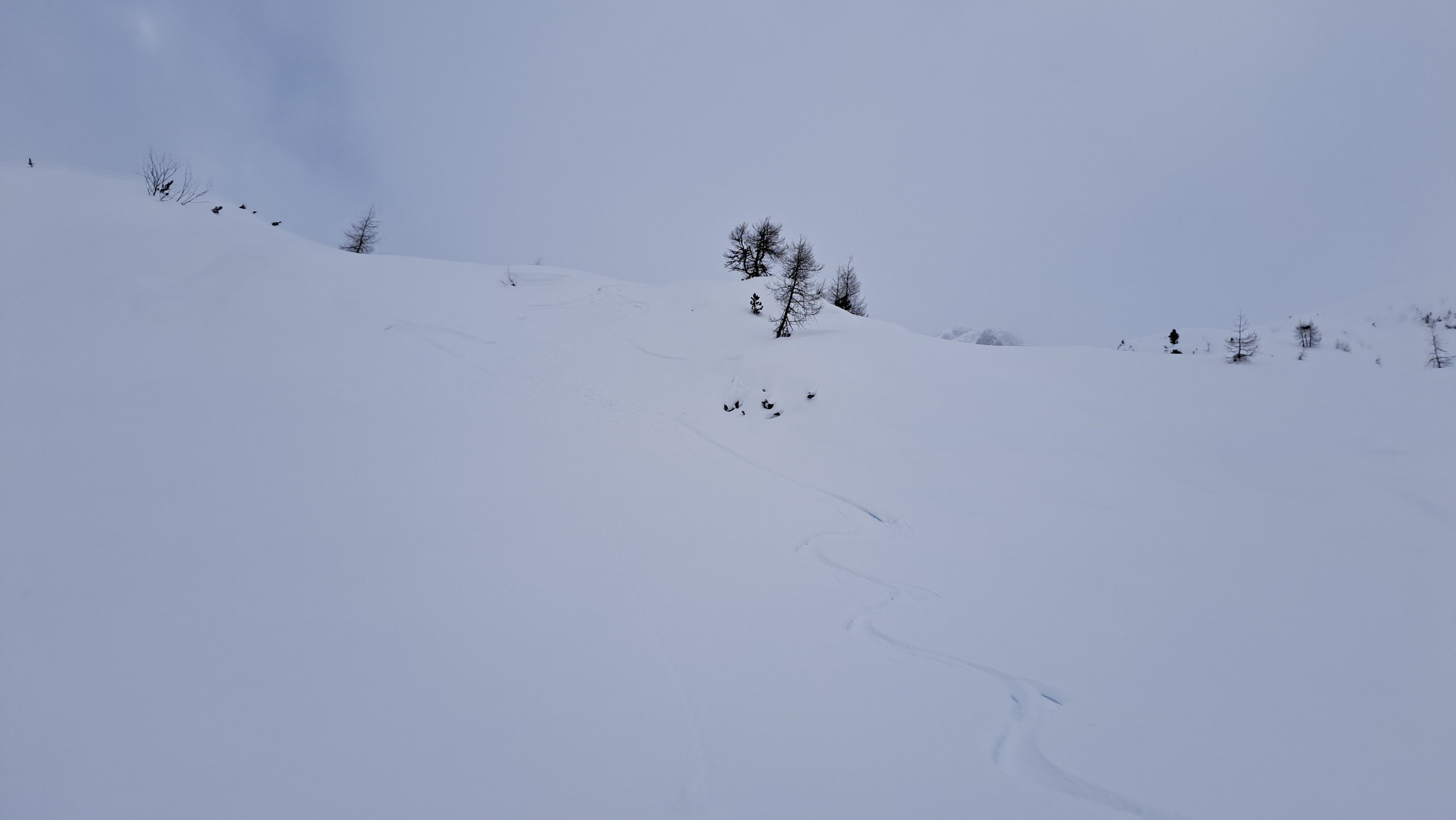 Das bisschen Neuschnee war ordentlich verblasen. Wir kamen immer wieder zu Stellen mit einer feinen Eiskruste drauf. Bei der Abfahrt löste sich auf einer nach Ost schauenden Mulde eine kleine Triebschneelinse.