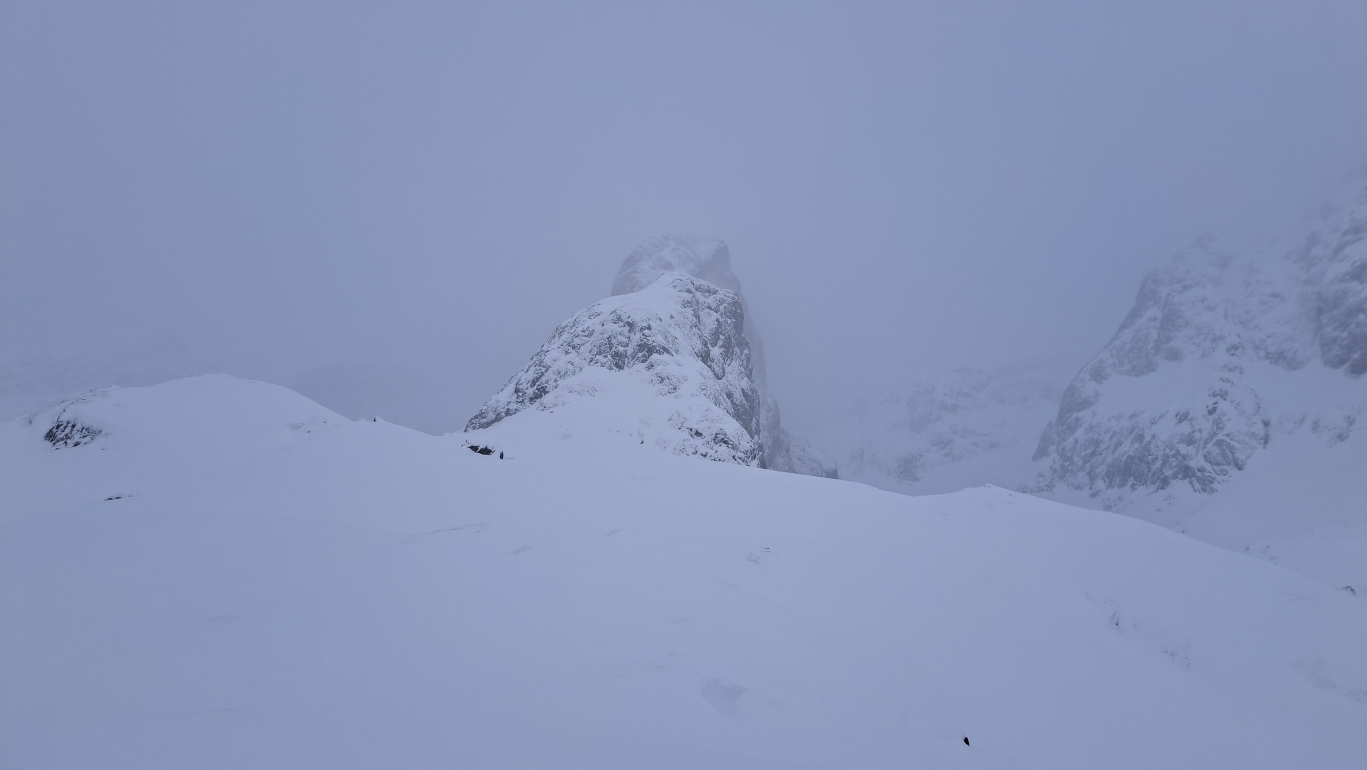 Unsere Spur vom Feiertag war streckenweise zugeweht. Wir zweigten zum Ochsenriedl ab und gingen bis zum Fuß und in den Windschatten der Torsäule. Dahinter sah es ungemütlich aus, somit war das der richtige Platz zum Umdrehen.