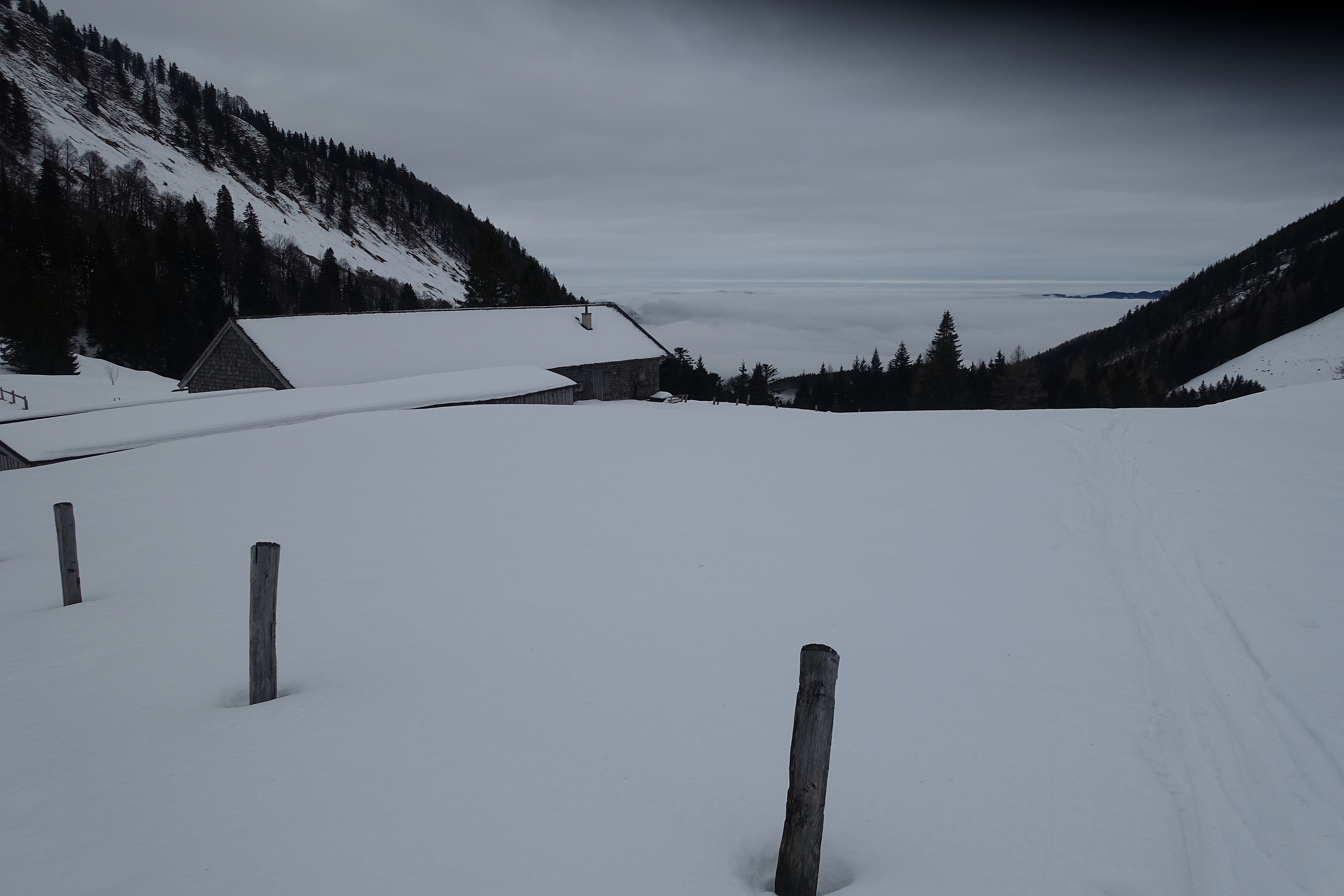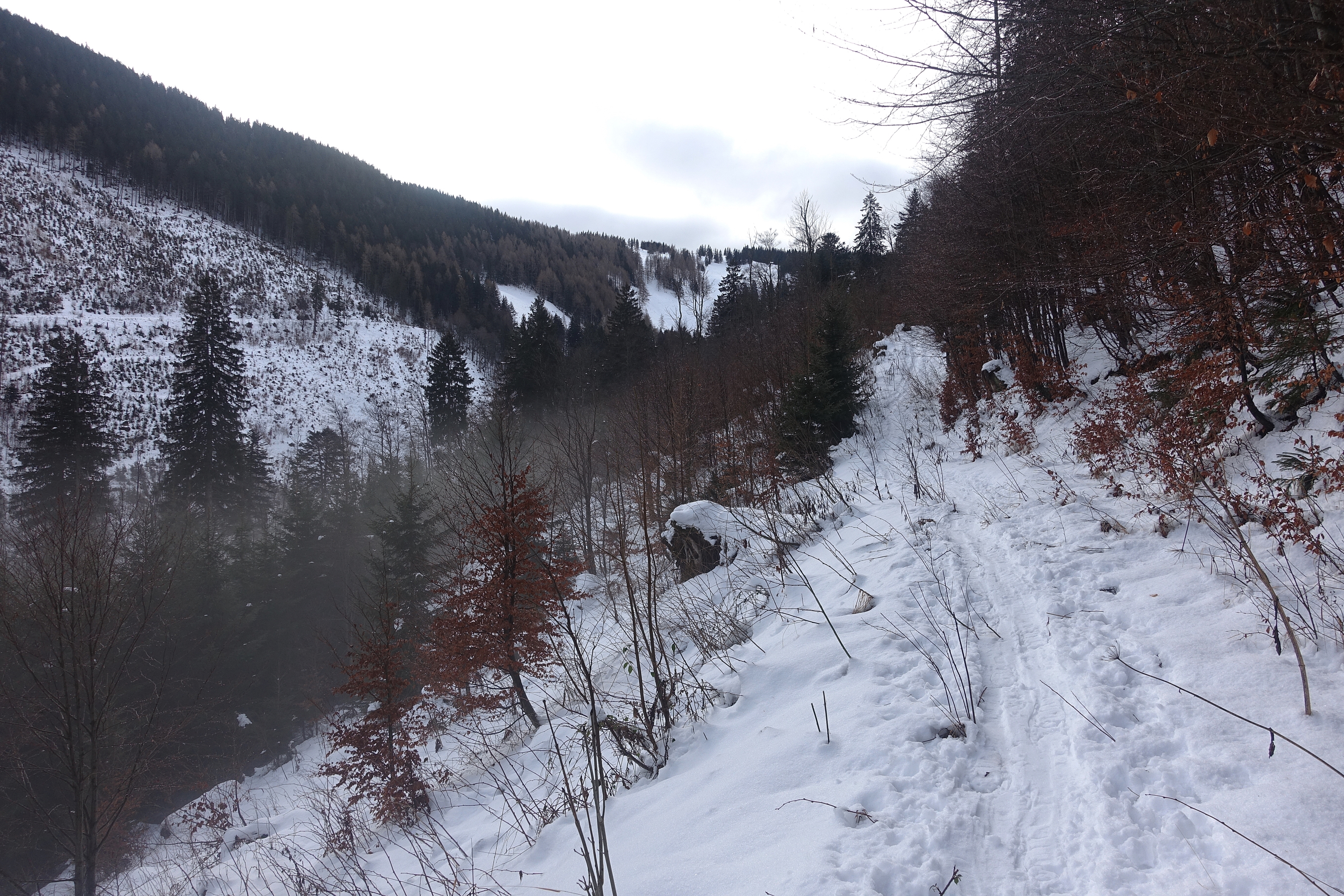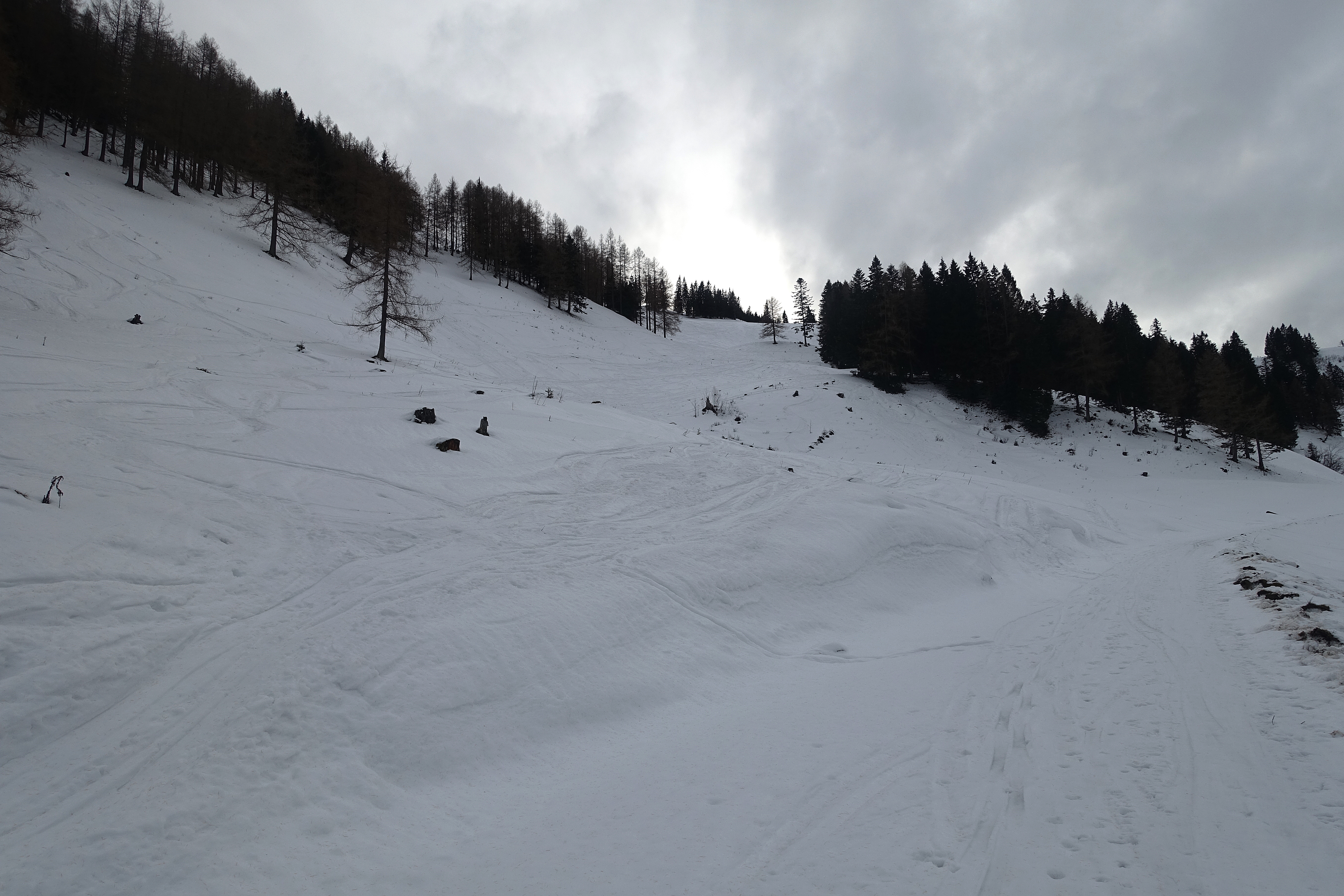 Nicht mehr wirklich lohnend, der Warmwettereinbruch und der Regen bis weit hinauf haben der Schneedecke arg zugesetzt. Stumpfer fauliger Naßschnee bis zum Untergrund - nicht wirklich ein Vergnügen zum fahren (Vergleich Bericht Johann Allgeier bzw. Peter Bruckbauer vom 13.12.2022). Aufstieg über die Gartenbergseite, Abfahrt Standard über Stubneralm und Fortsstraße, der Forstweg von der Stubneralm bis zum Parkplatz Sausteigalm wurde schon einmal geräumt, teilw. sehr dünne Schneeauflage und die Steine kommen an einigen Stellen schon durch. Die Abfahrt zum Auto schon ziemlich eisig und und ebenfalls schon Steinkontakte.