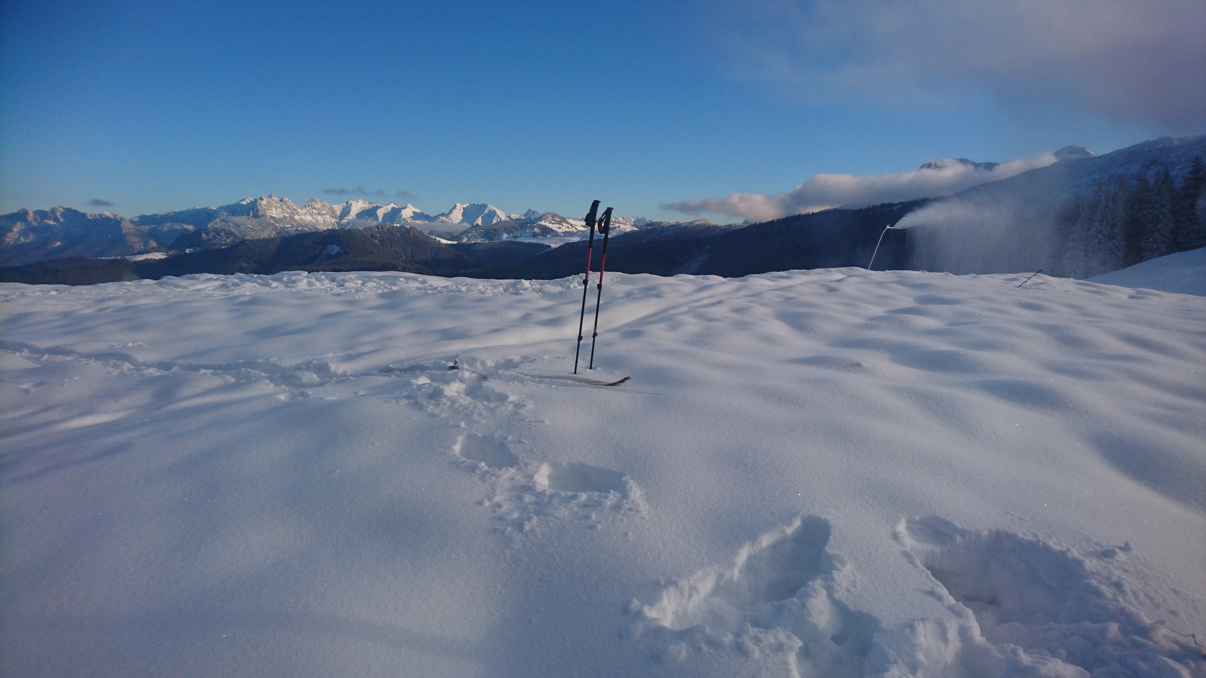 Von Seegatterl aus mit den Ski und Skischuhen auf dem Buckel los. Anschnallen kann man ab ca.1050m (10min unterhalb des Zigeunerliftes), bis dorthin geht auch die Abfahrt.