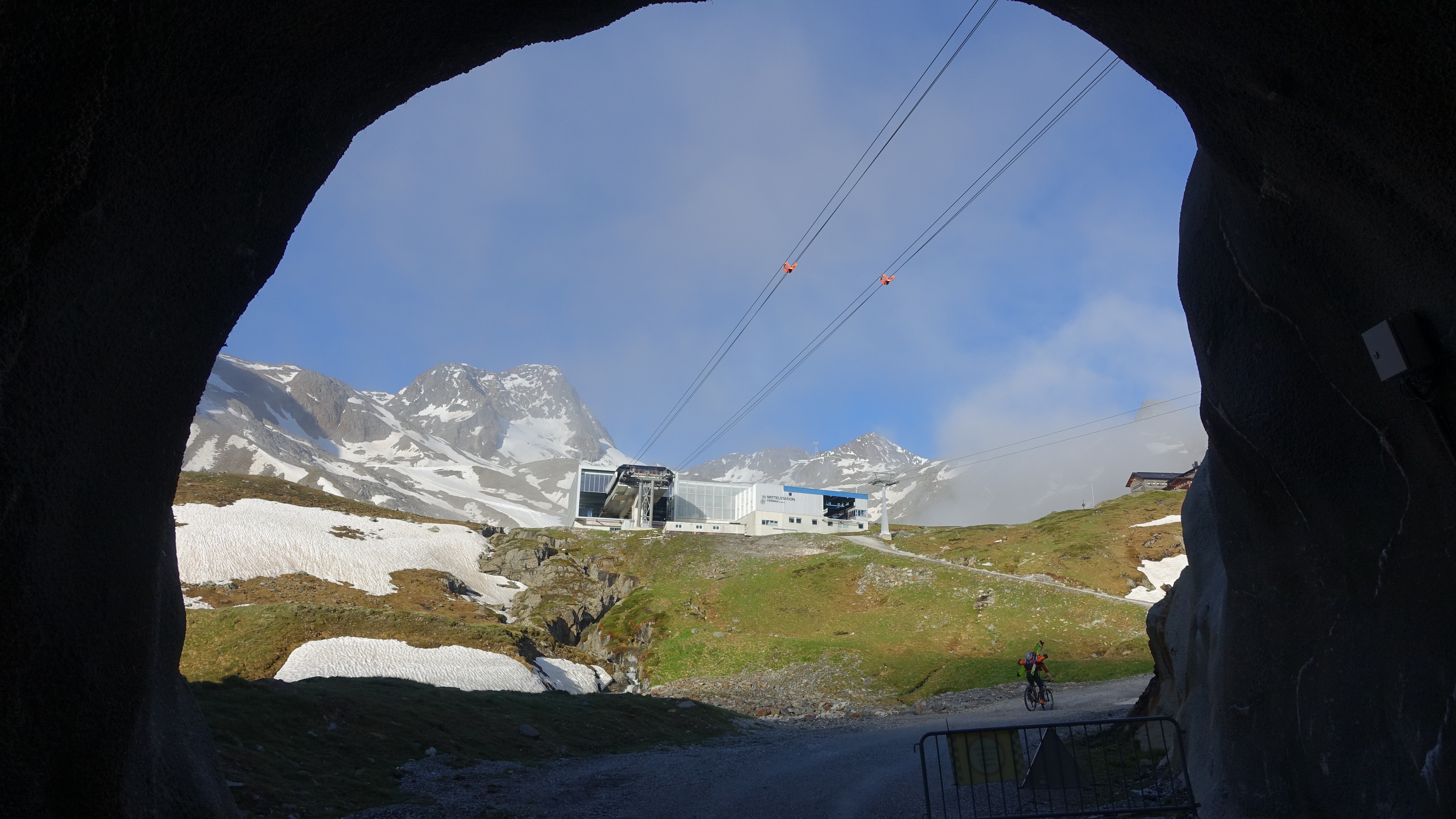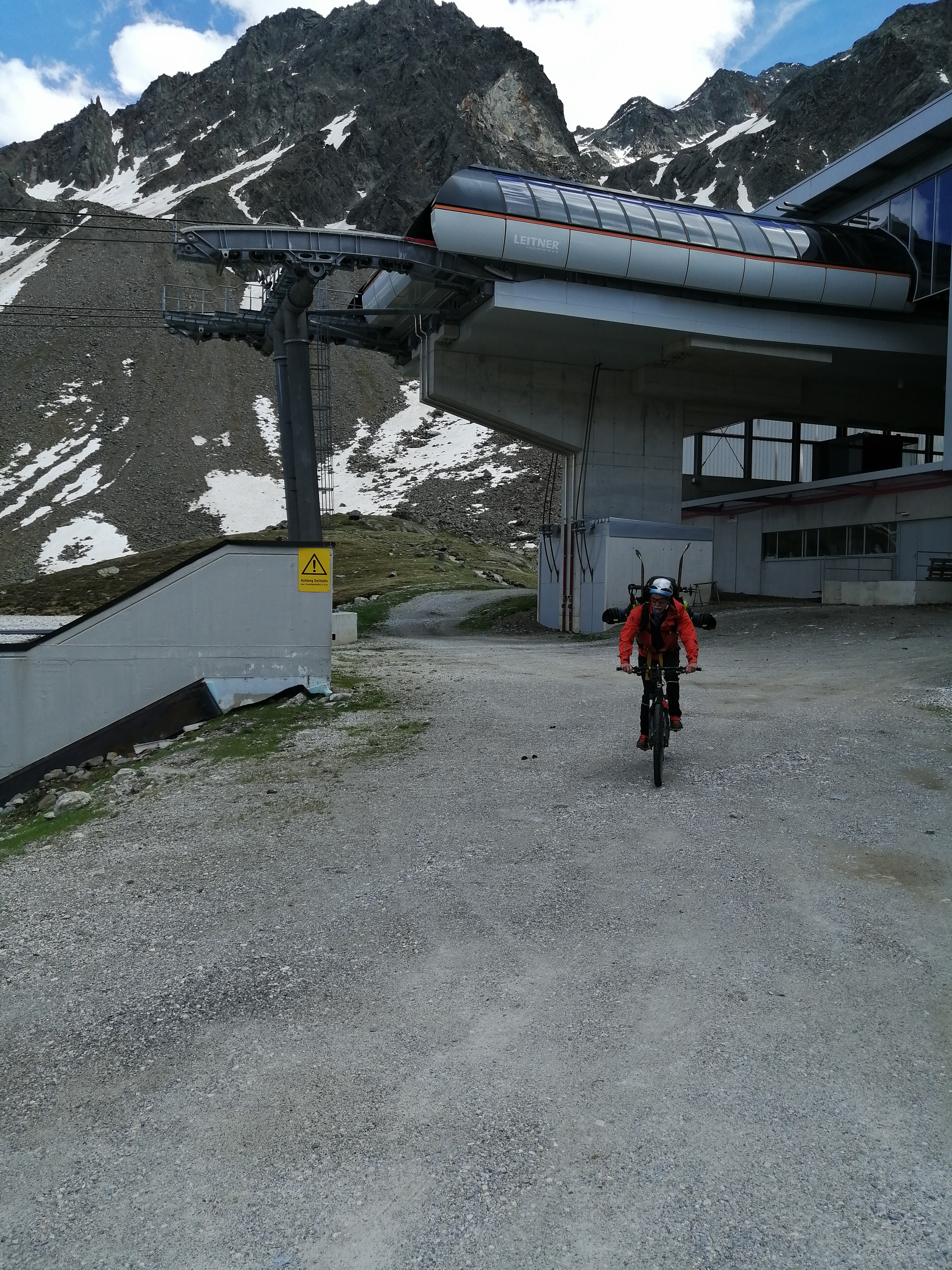 Wir starteten um 6:20 mit den Rädern (keine E-bikes) an der Talstation und mussten zugegebenermaßen meistens schieben, weil es mit den schweren Rucksäcken einfach zu steil war.