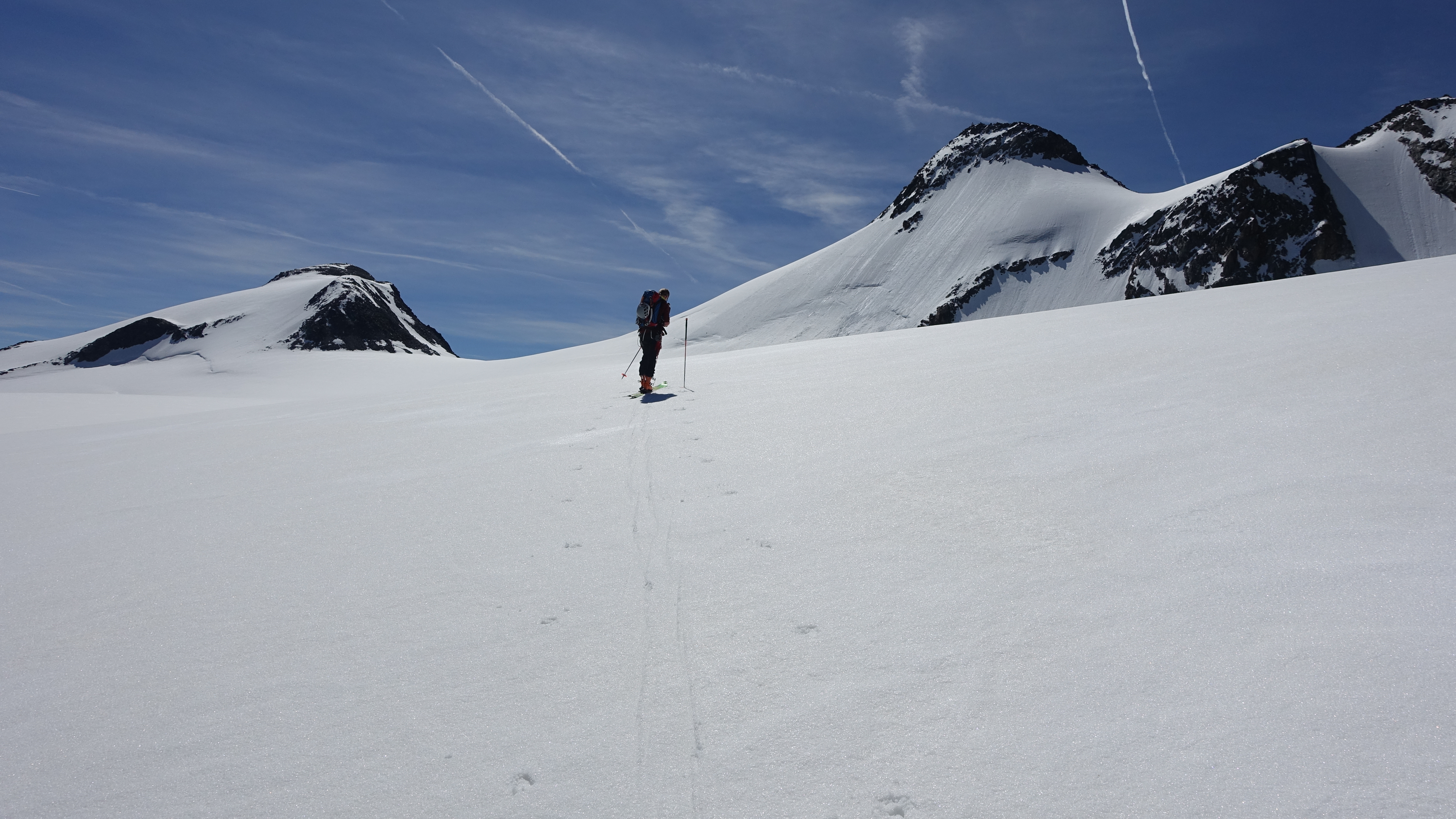 Bis zur Mittelstation, bzw. Dresdner Hütte (geschlossen) mit Rad, danach durchgehend mit Ski auf noch vorhandener Piste bis hinauf zum Pfaffengrat. Hier ca. 150 Hm Abfahrt nach Süden und Wiederaufstieg zum Pfaffenjoch.