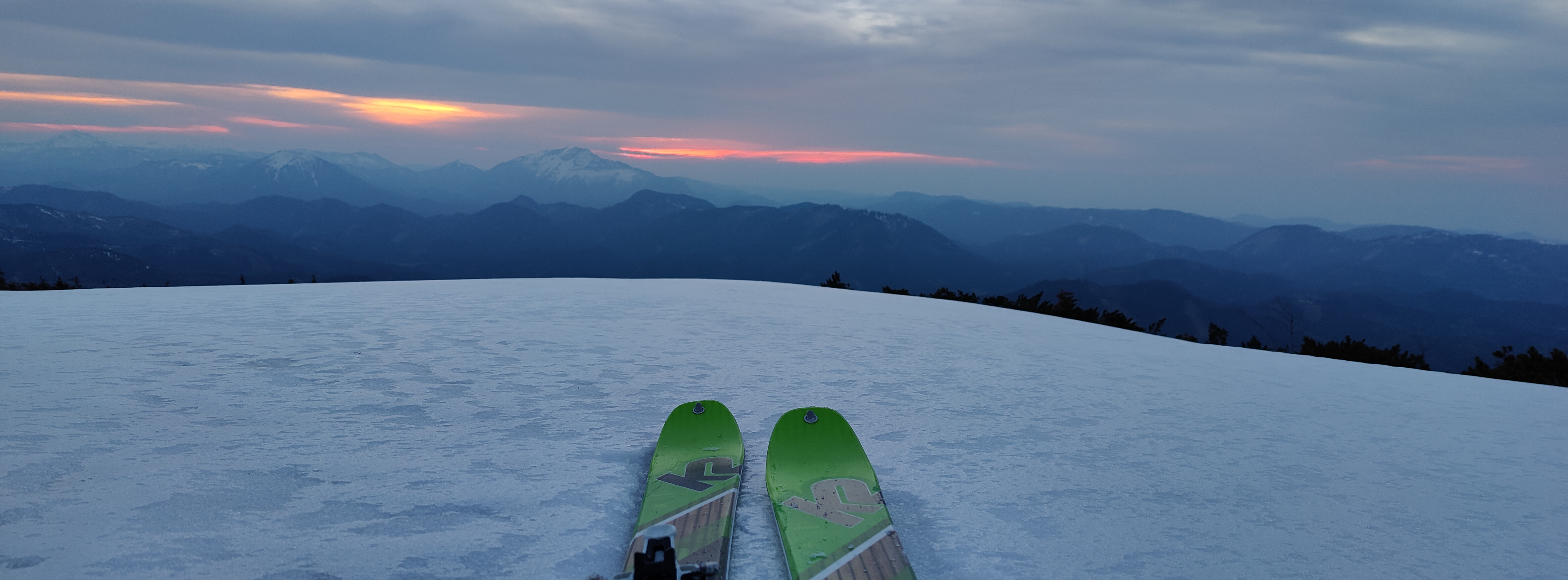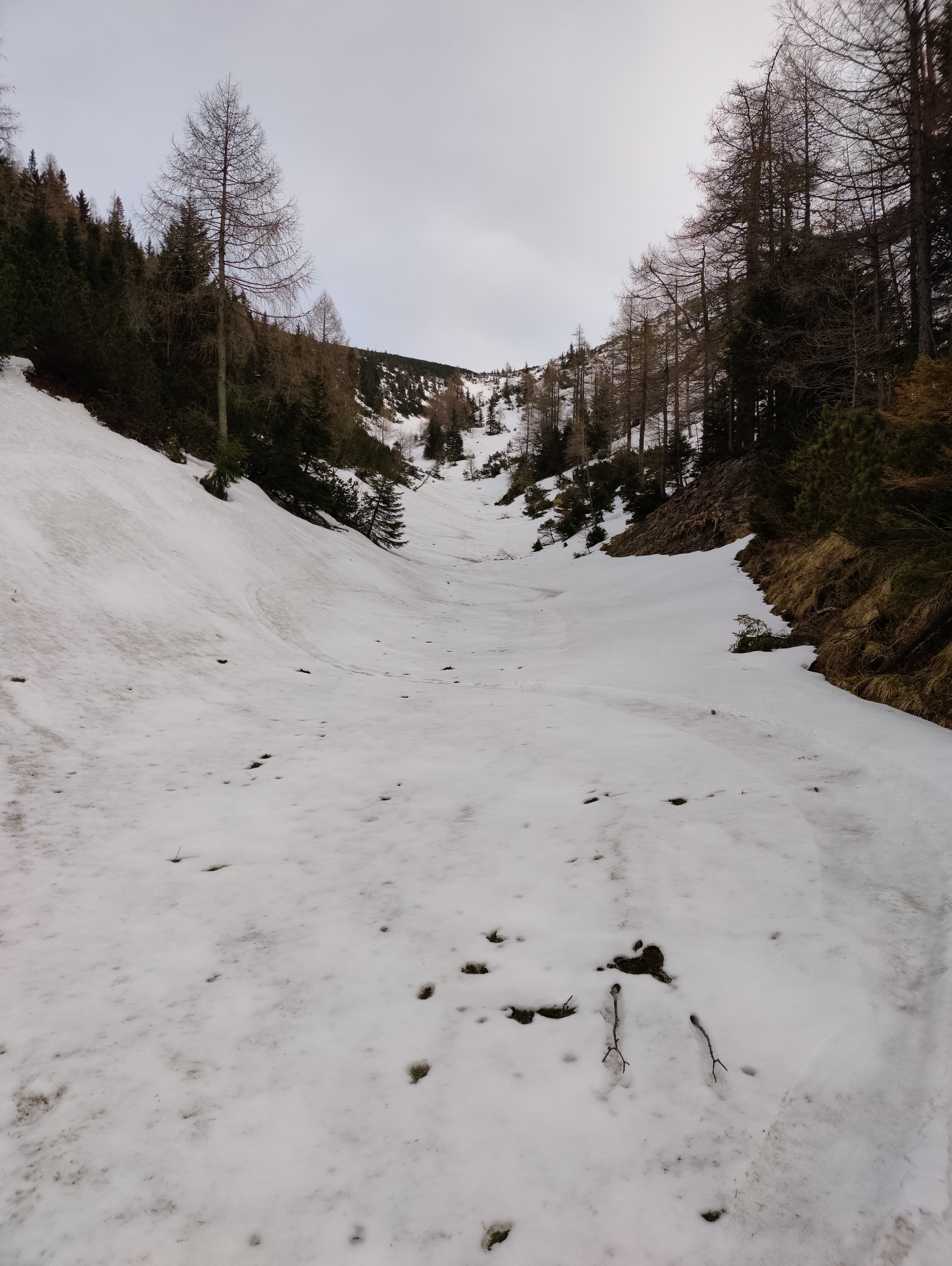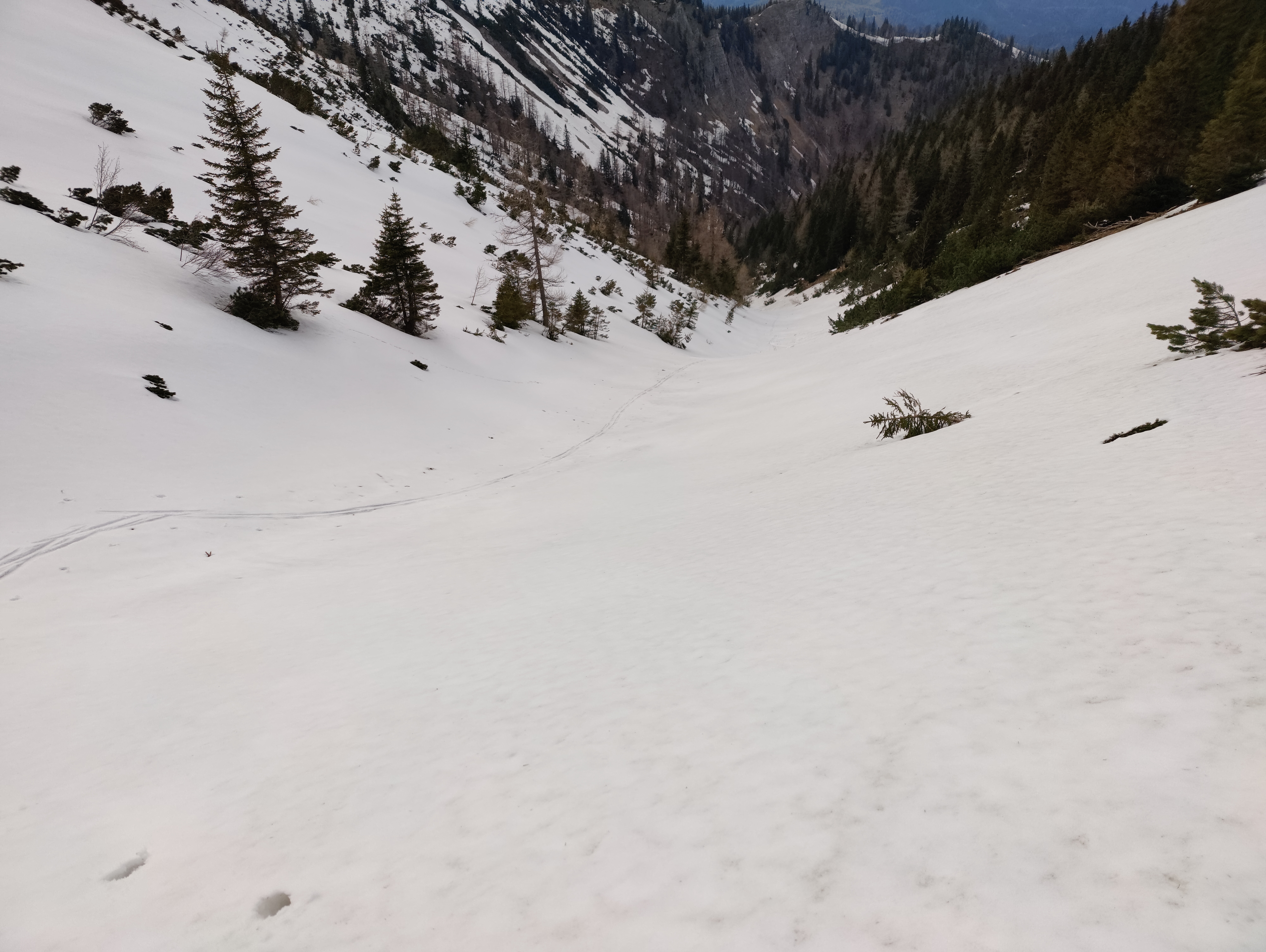Vom Gscheid auf der Nordseite über Sommerweg auf den Gipfel. Der Weg ist bis kurz nach dem Gesenger schneefrei, danach ist anschnallen möglich, ich habe es nicht gemacht. 1. Abfahrt Richtung Schindleralm direkt vom Gipfel möglich. Vor der Engstelle Abfahrt beendet und Wiederaufstieg zum Gipfel. 2. Abfahrt über die Hühnerkralle in den Göllergraben. Abfahrt bis ca. 1200 Meter möglich, 30 Minuten Ski tragen bis zum Parkplatz.